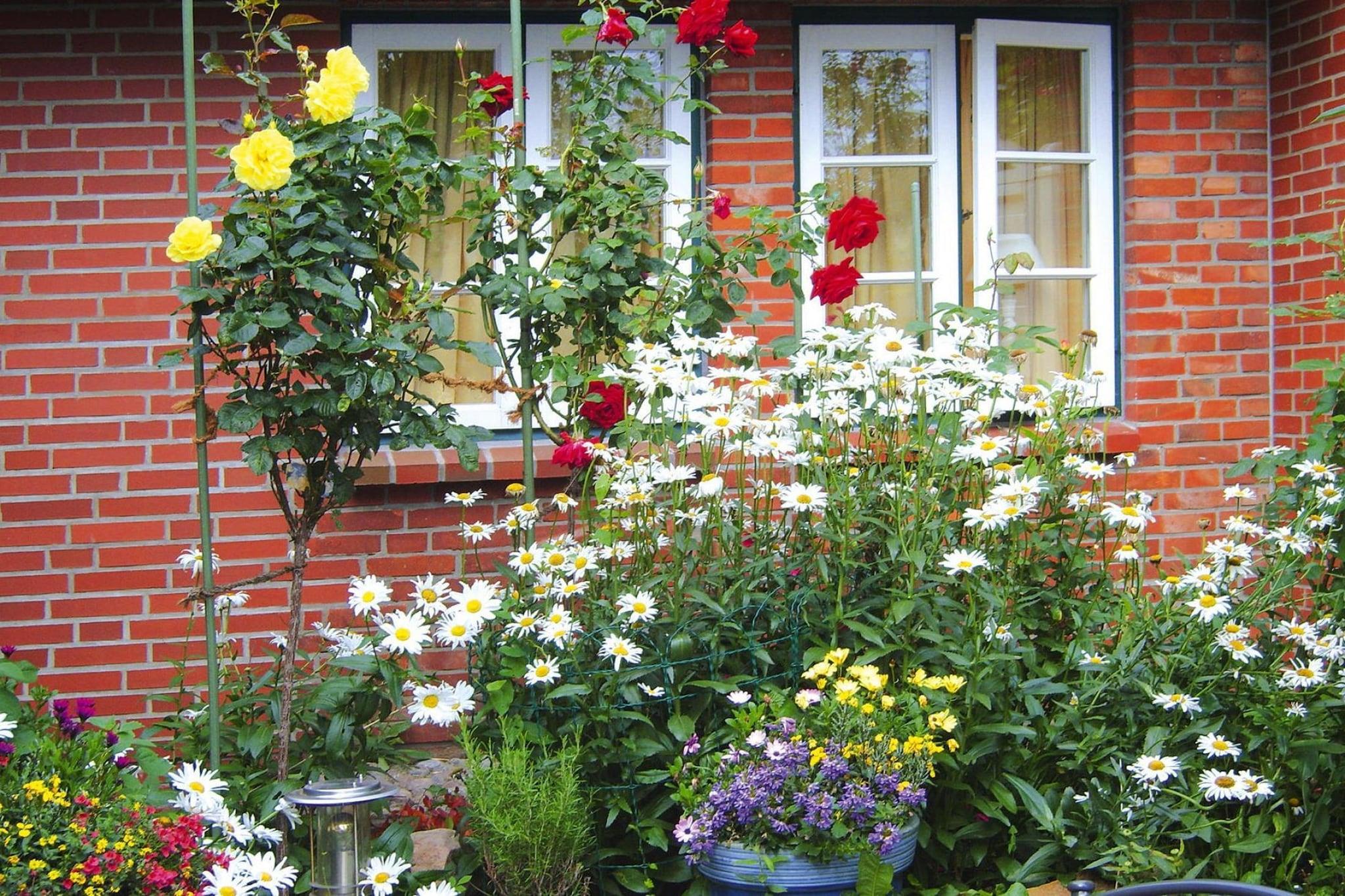Gemütliche Ferienwohnung in reetgedecktem Haus auf Föhr, ideal für Radtouren und Erholung im Garten.