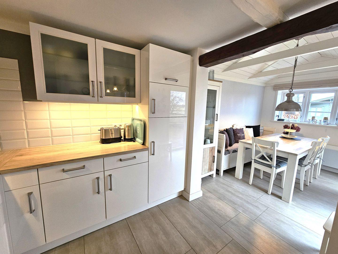 Der zentrale Wohnbereich mit offen zum Wohnzimmer gestalteter Küche verbindet Kochen, Essen und Entspannen in einem angenehmen, kommunikativen Raum. Für Ihre Selbstversorgung steht eine umfangreich ausgestattete Küche bereit: 4-Platten-Herd, Backofen, Mikrowelle, Kühlschrank mit Gefrierfach, Spülmaschine sowie Kaffeemaschine, Wasserkocher und Toaster. Ein Esstisch mit Essbereich ist ebenfalls vorhanden. Im Wohnzimmer laden Sofa und Sessel zum Ausruhen ein; für Unterhaltung stehen TV (insgesamt 3 TVs), Radio und DVD-Spieler zur Verfügung. An kühleren Tagen sorgt der Kaminofen für eine behagliche Atmosphäre.