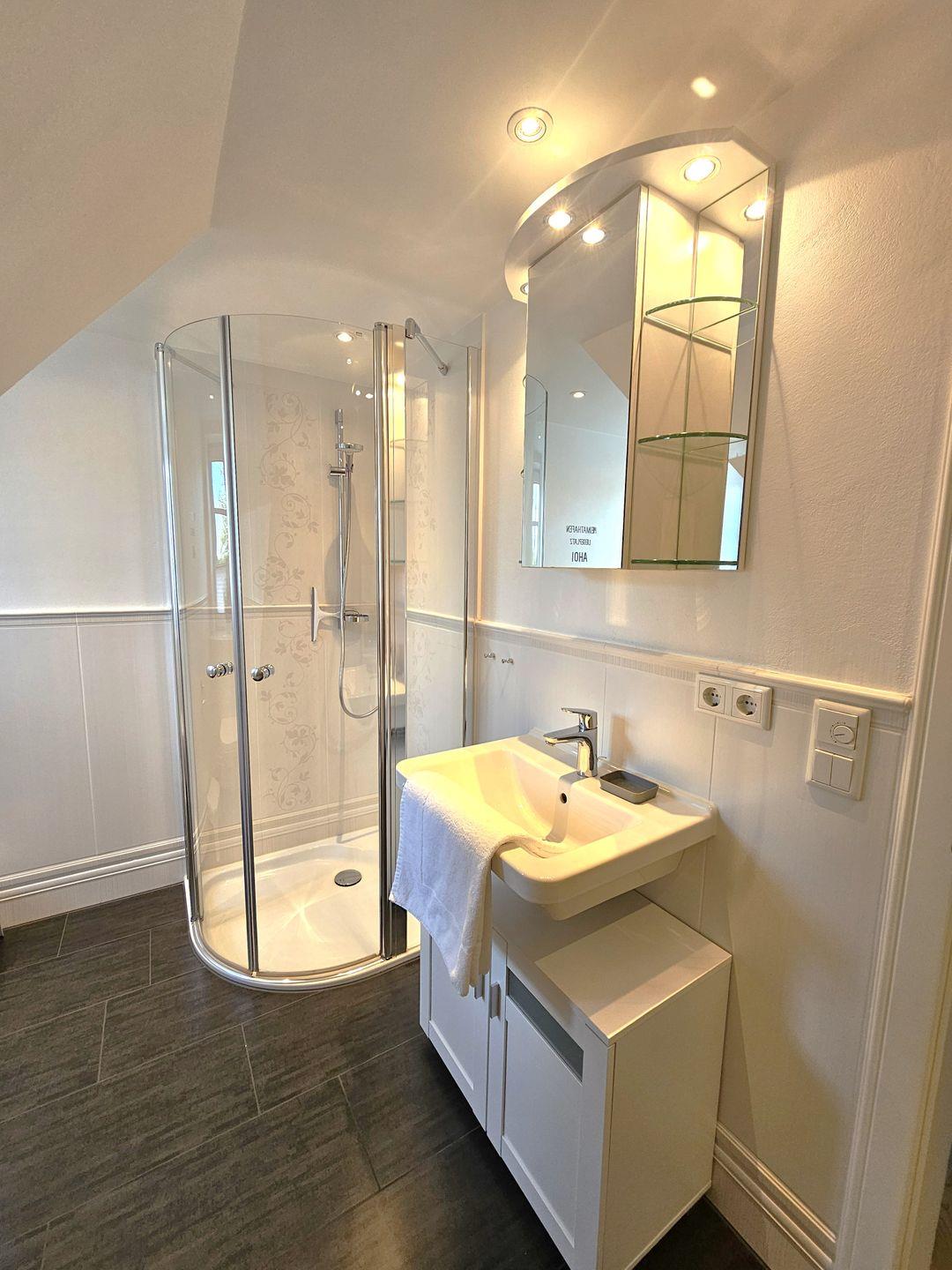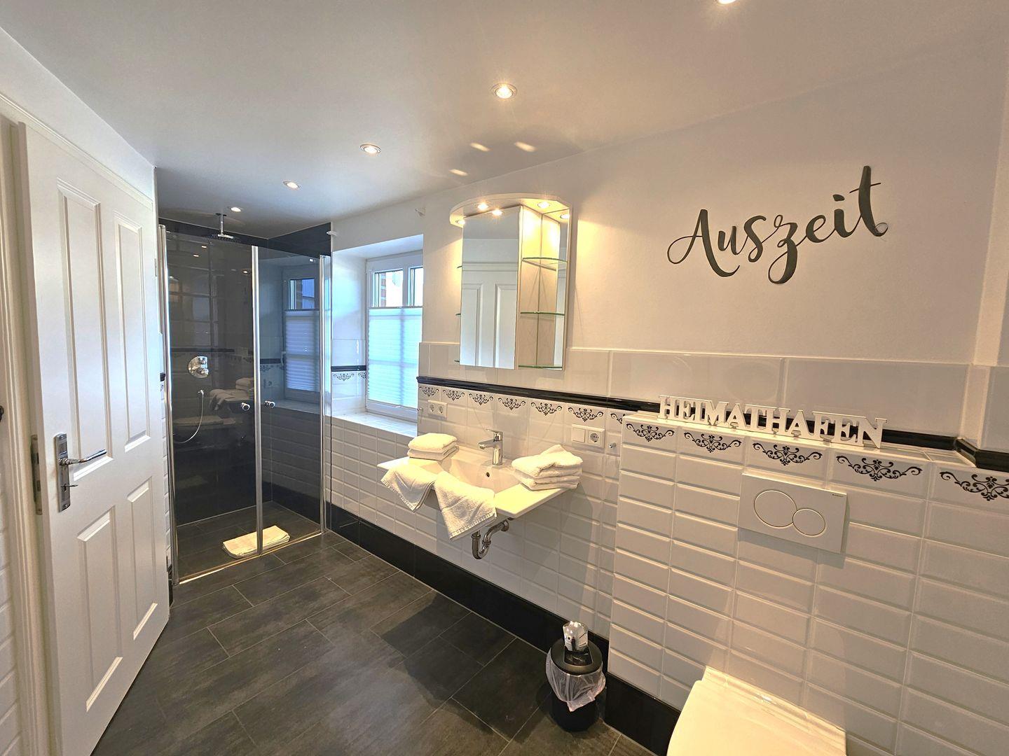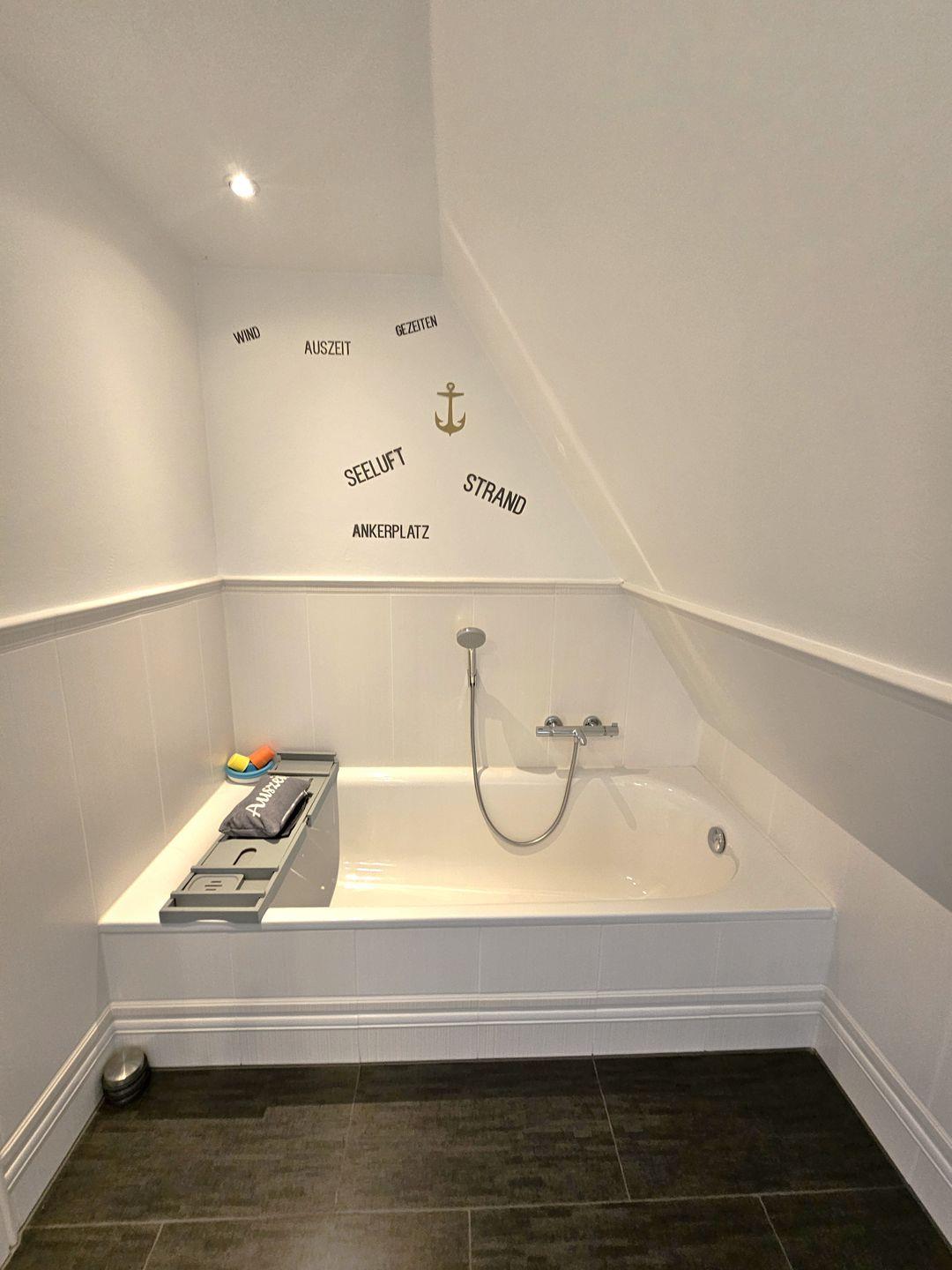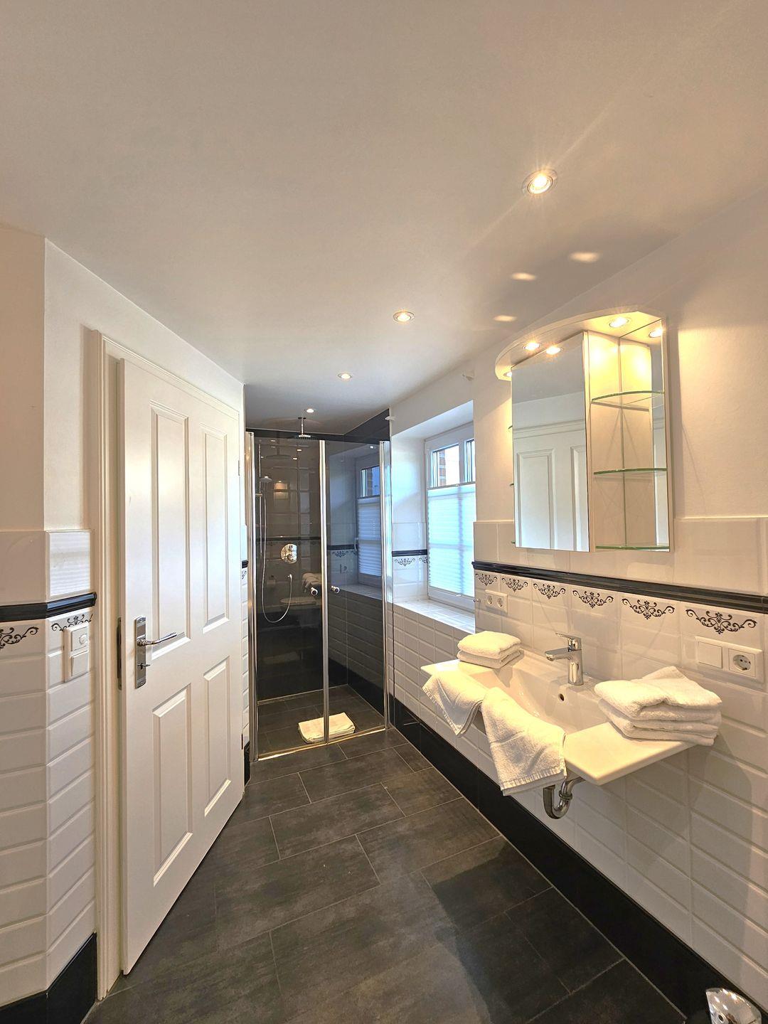 Zwei Badezimmer stehen zur Verfügung; zusätzlich gibt es eine Badewanne. Haartrockner, Spiegel und Waschbecken sind vorhanden, warmes Wasser selbstverständlich ebenso. Ein besonderes Extra ist die Sauna zur Eigennutzung (gegen Gebühr: einmalig 75,- €, inkl. Bademäntel und Saunatücher) – ideal, um nach einem aktiven Tag zur Ruhe zu kommen.