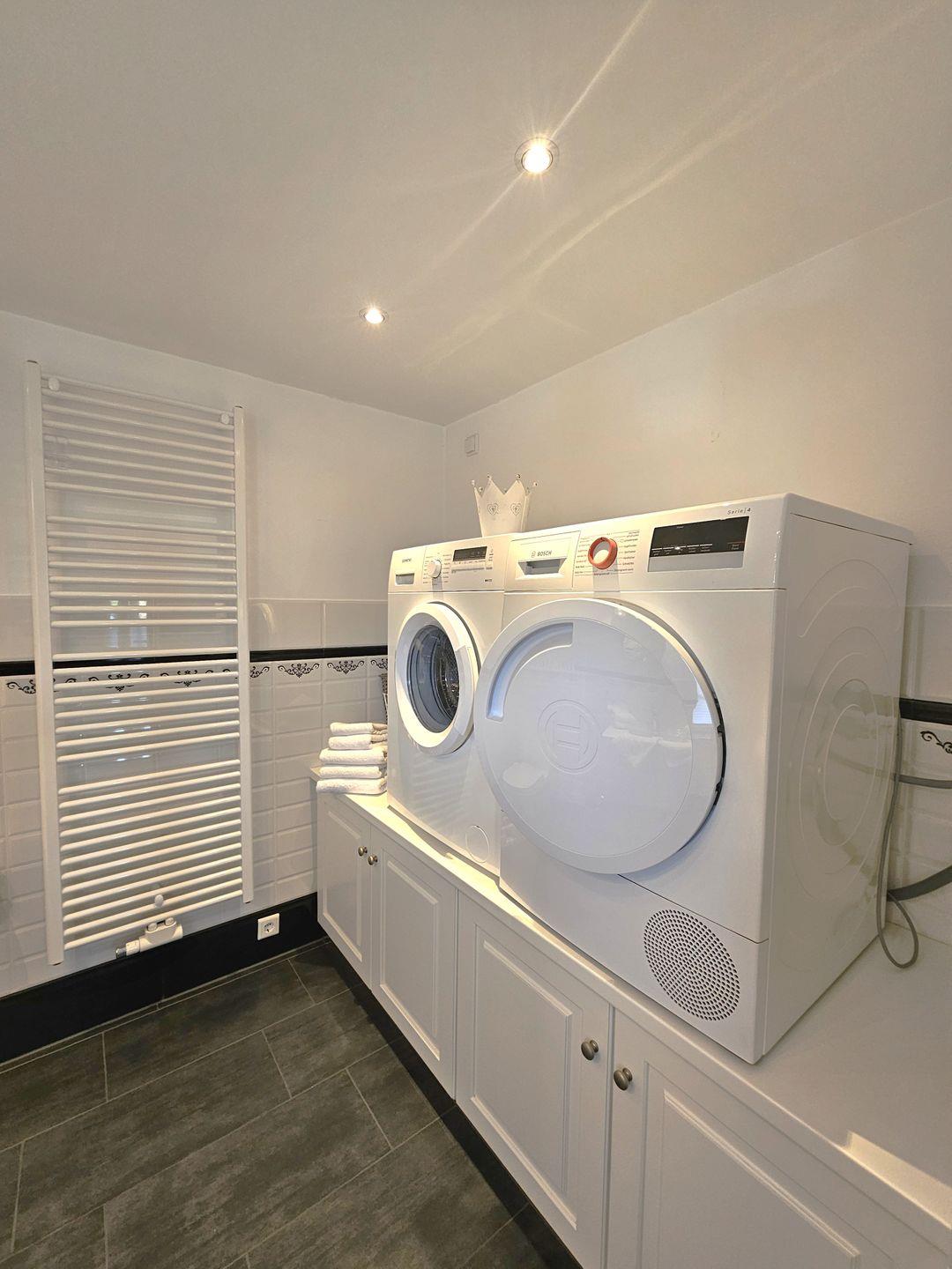 Für längere Aufenthalte ist die Haushaltsausstattung komfortabel ergänzt: Waschmaschine und Trockner zur Eigennutzung, Bügeleisen und Bügelbrett sowie Staubsauger.