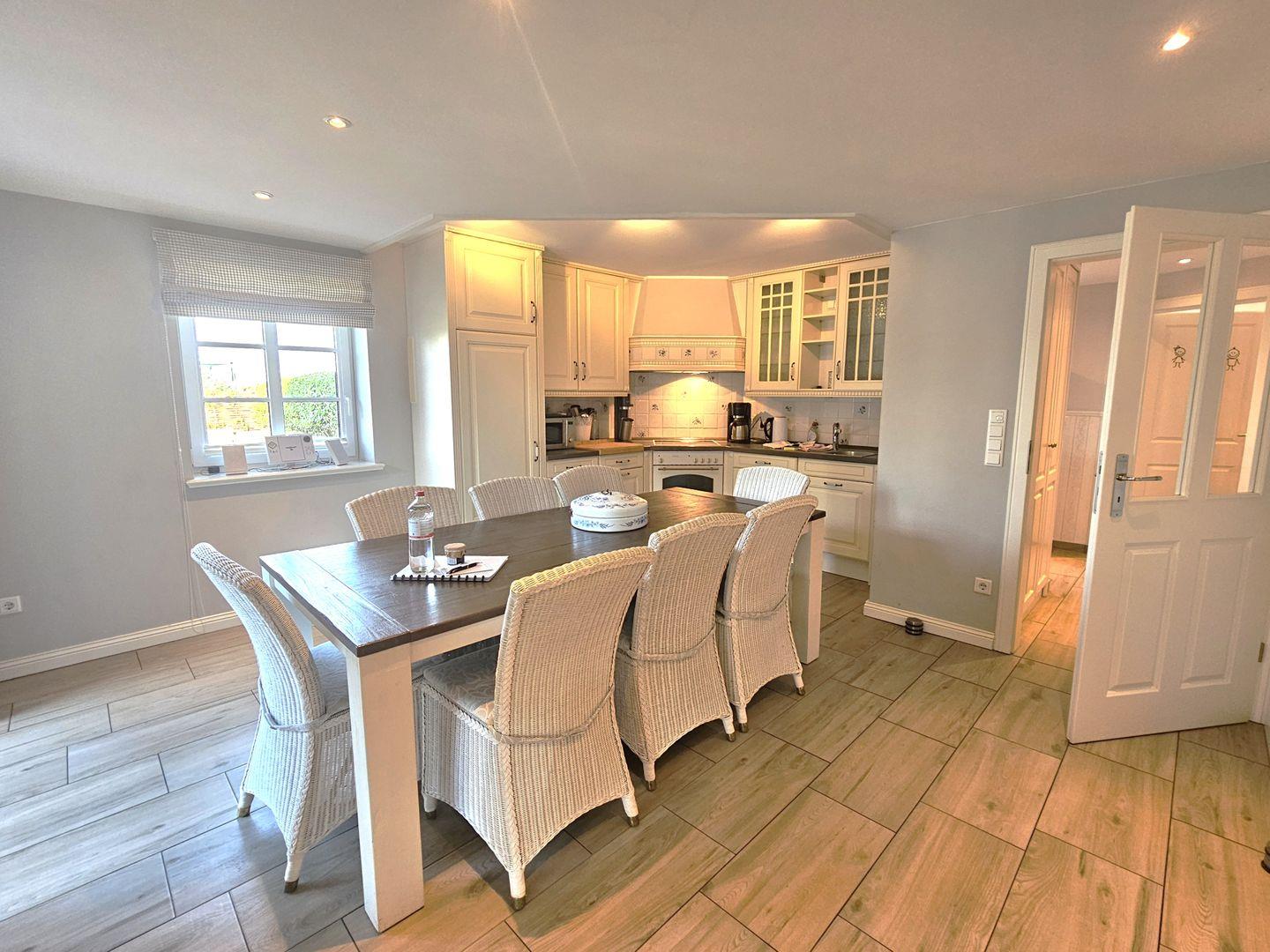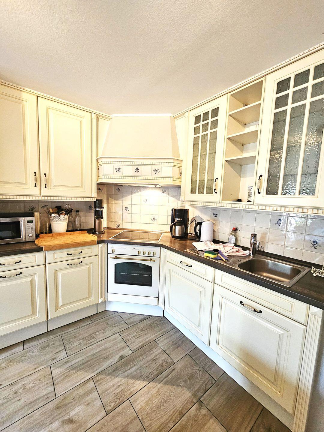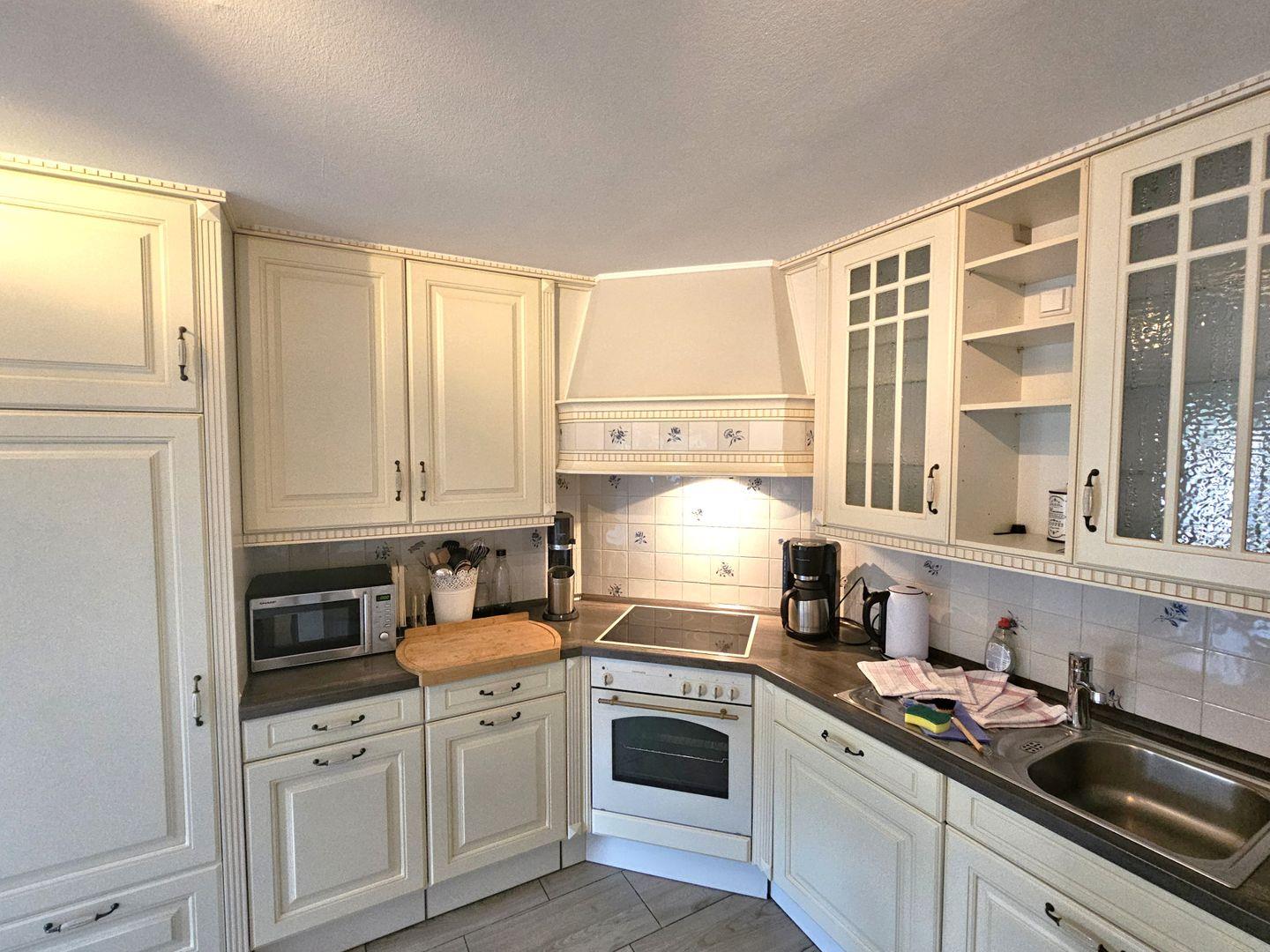 Die offene Küche ist umfassend ausgestattet: Herd mit 4-Platten-Kochfeld, Backofen, Mikrowelle, Kühlschrank mit Gefrierfach, Spülmaschine sowie Kaffeemaschine, Wasserkocher, Toaster, Eierkocher und Küchenmaschine.