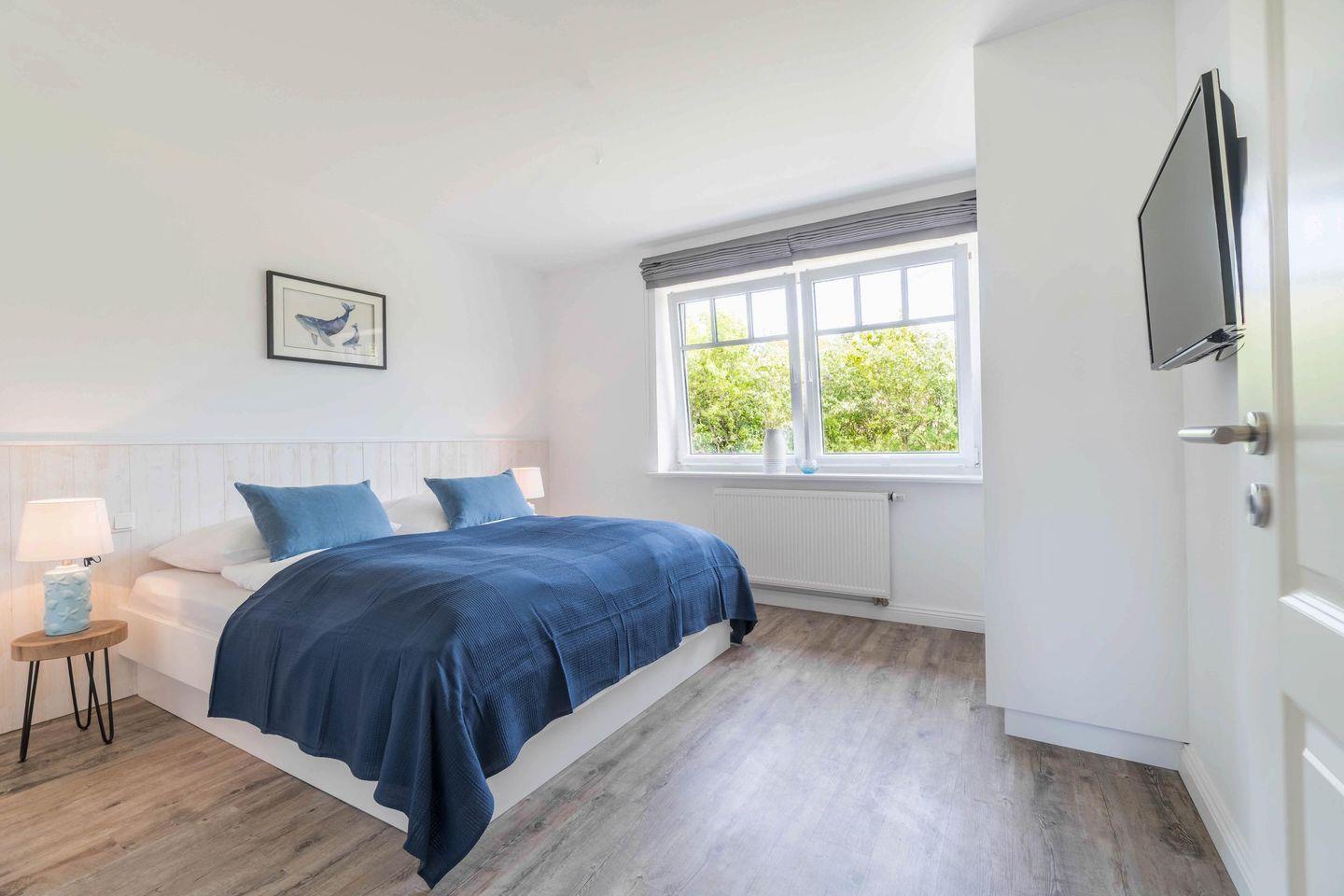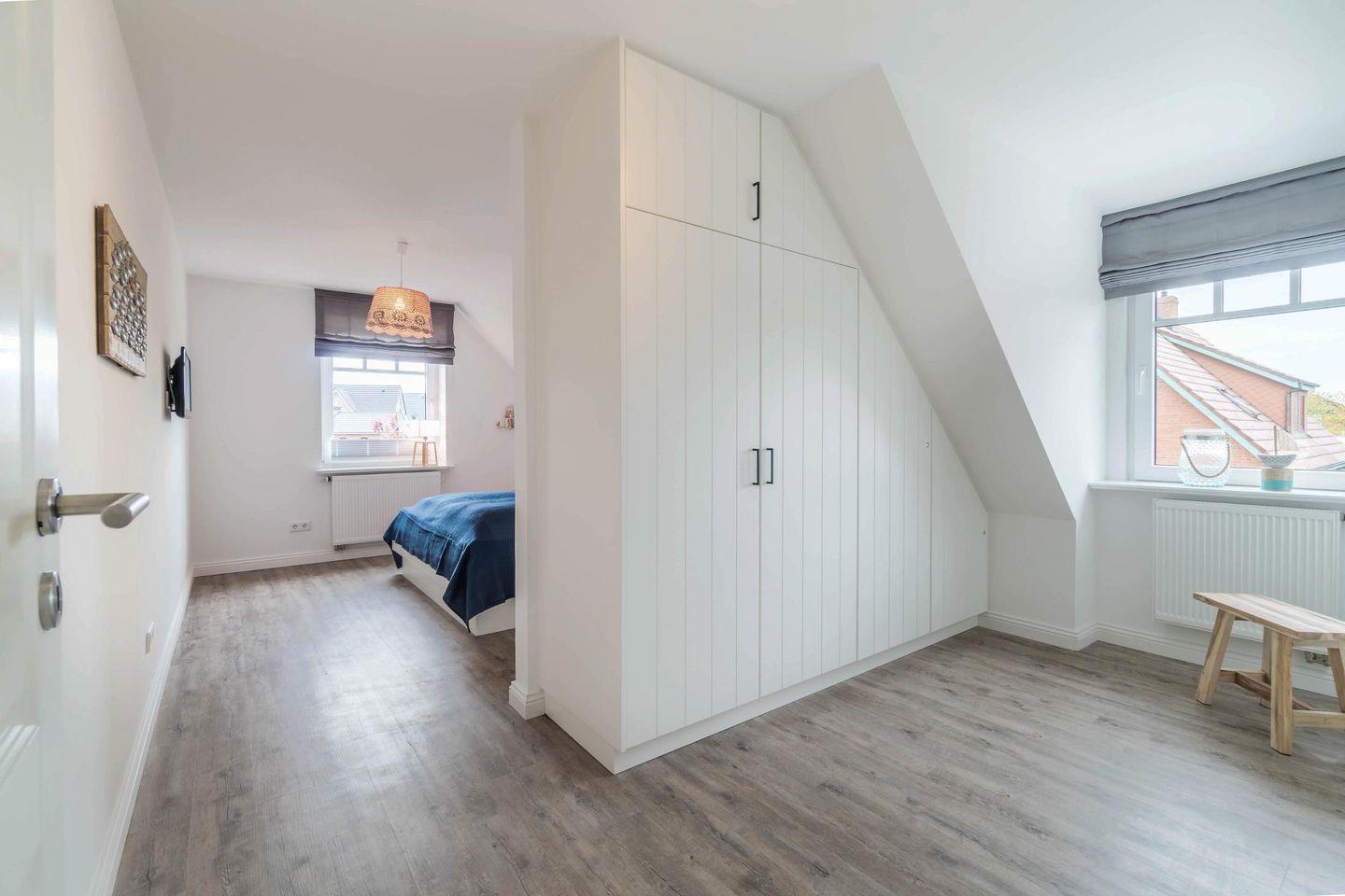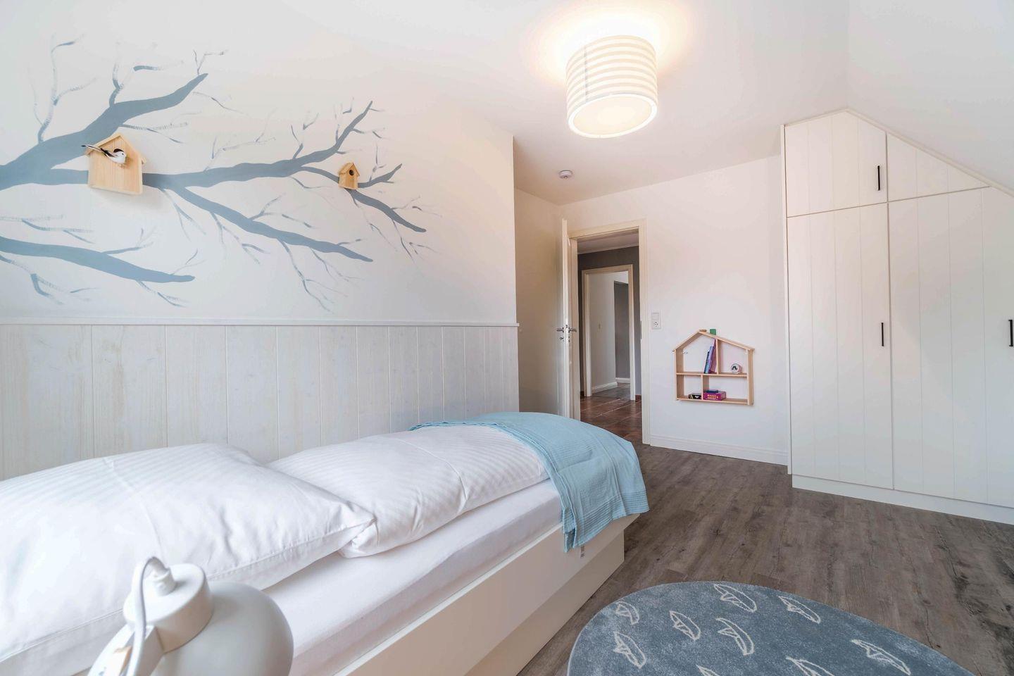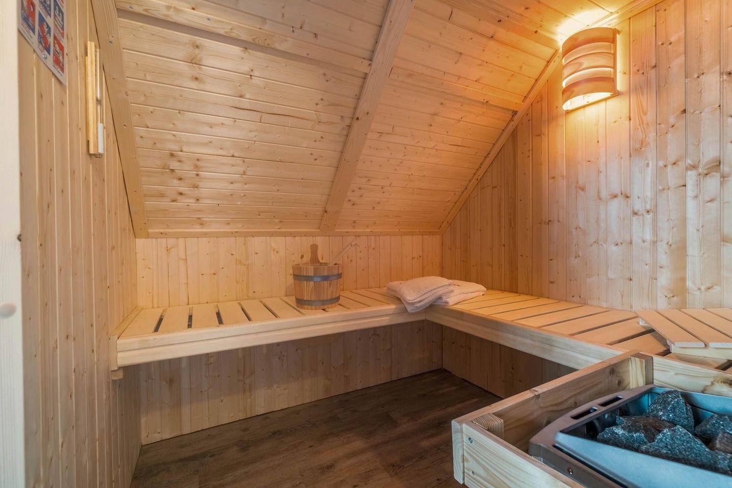 Über die Treppe erreichen Sie das 1. OG. Hier befinden sich drei weitere Schlafzimmer, eins davon ist ebenfalls mit einem Smart-TV ausgestattet. Das Saunazimmer verfügt über eine hochwertige Sauna samt Liegebereich. Das Badezimmer ist mit einer Dusche und einer Badewanne ausgestattet. In allen Schlafzimmern befinden sich Doppelbetten und Einbauschränke, welche vom Tischler angefertigt wurden.
