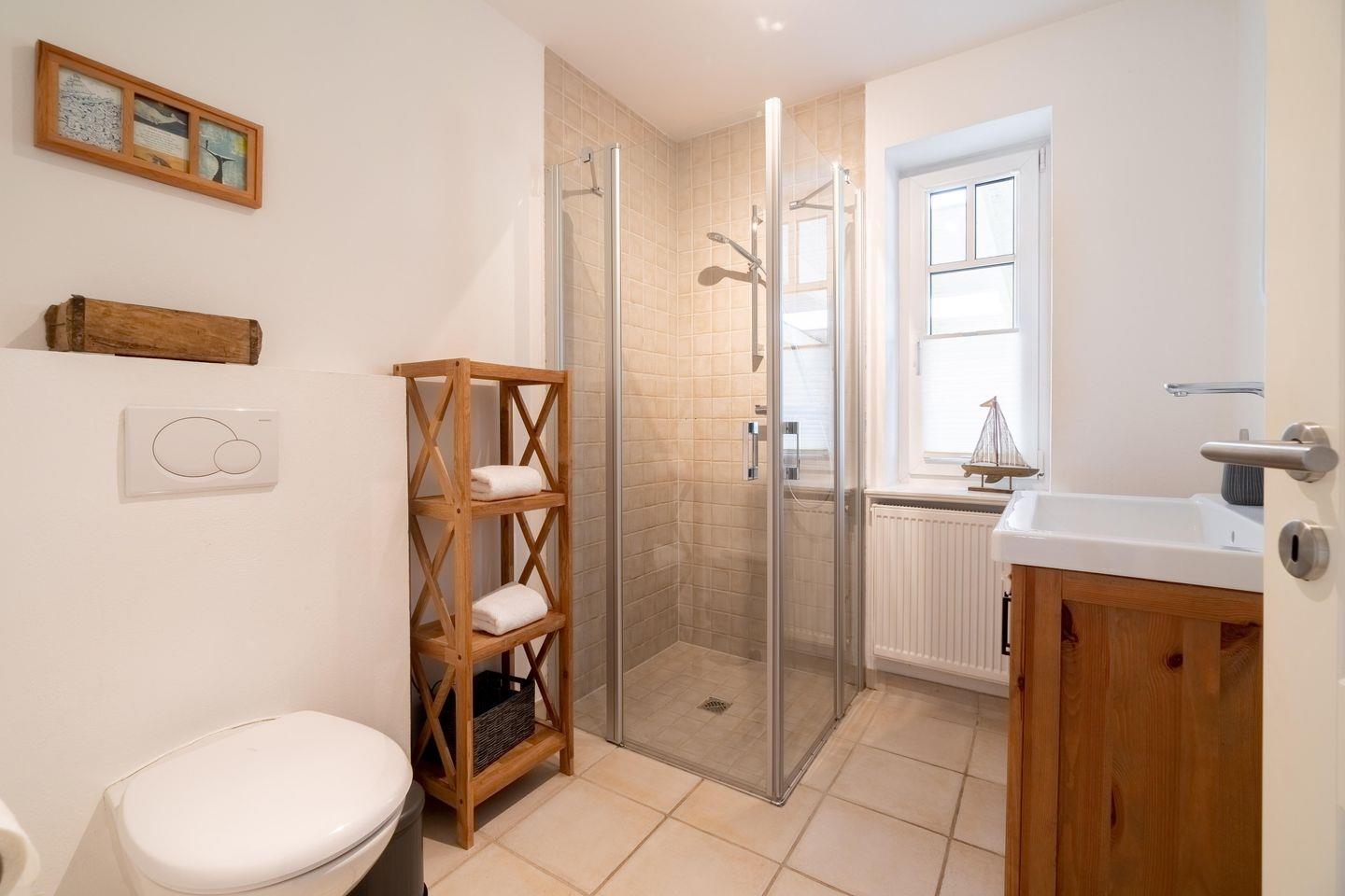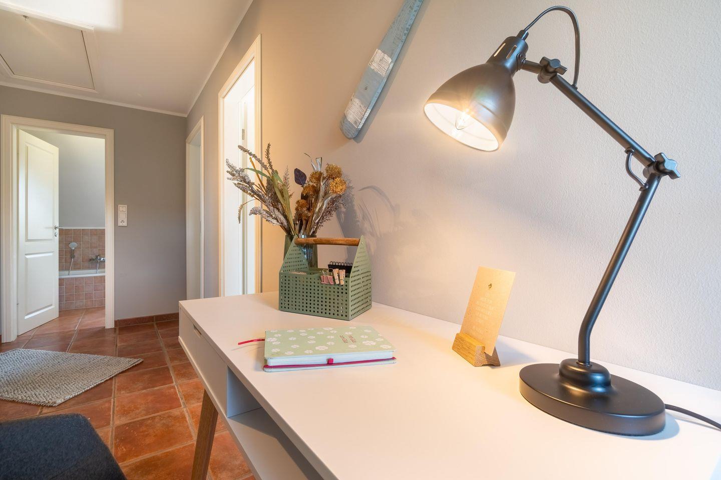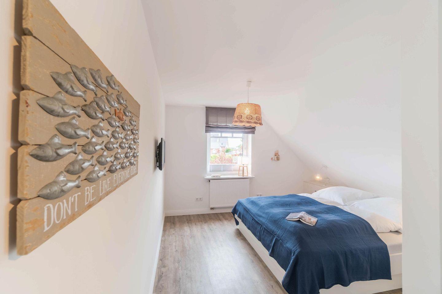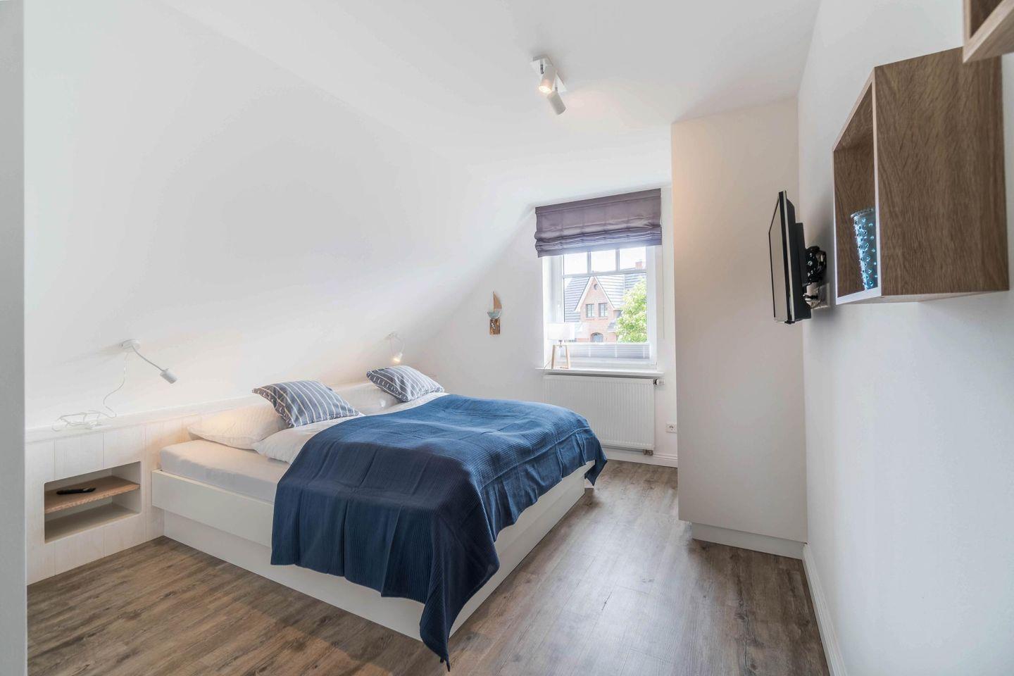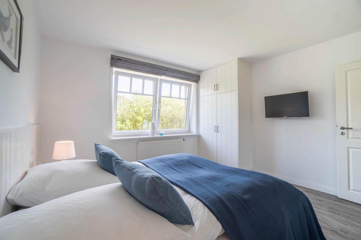 Über die Treppe erreichen Sie das 1. OG. Hier befinden sich drei weitere Schlafzimmer, eins davon ist ebenfalls mit einem Smart-TV ausgestattet. Das Saunazimmer verfügt über eine hochwertige Sauna samt Liegebereich. Das Badezimmer ist mit einer Dusche und einer Badewanne ausgestattet. In allen Schlafzimmern befinden sich Doppelbetten und Einbauschränke, welche vom Tischler angefertigt wurden.