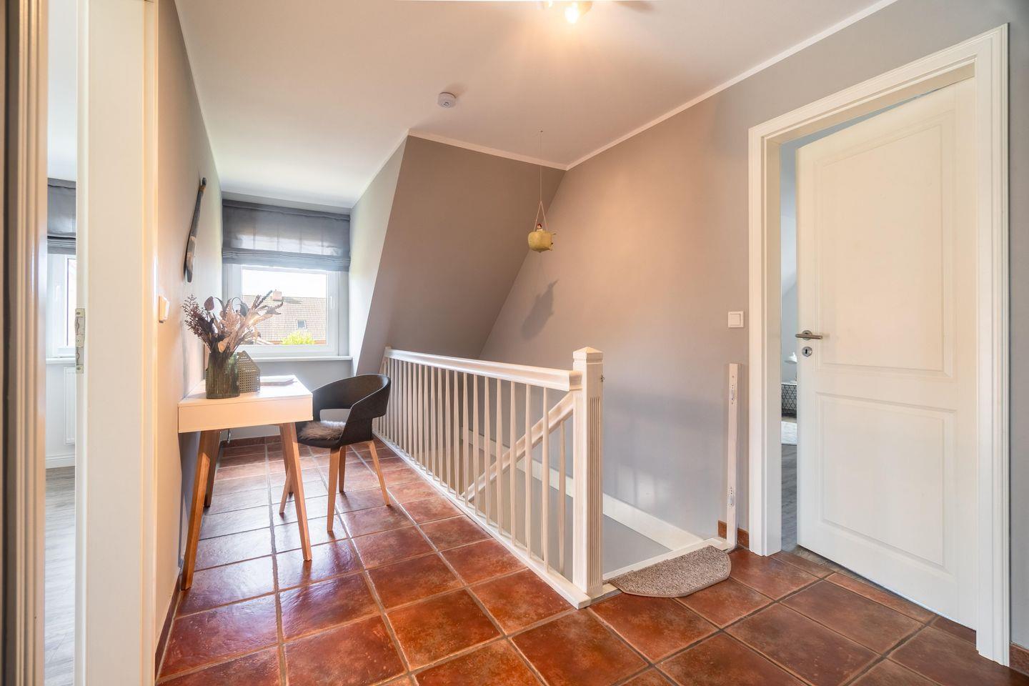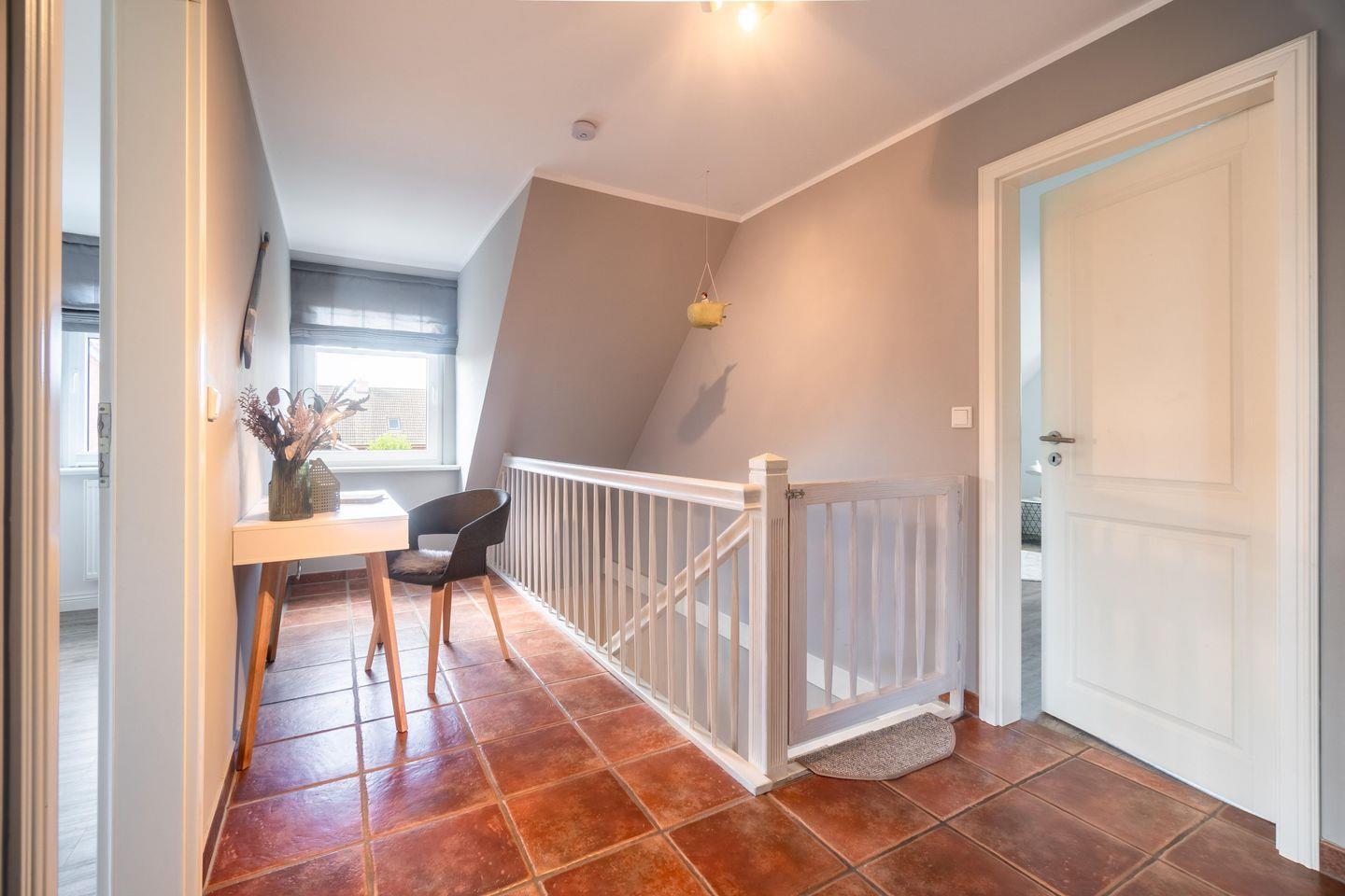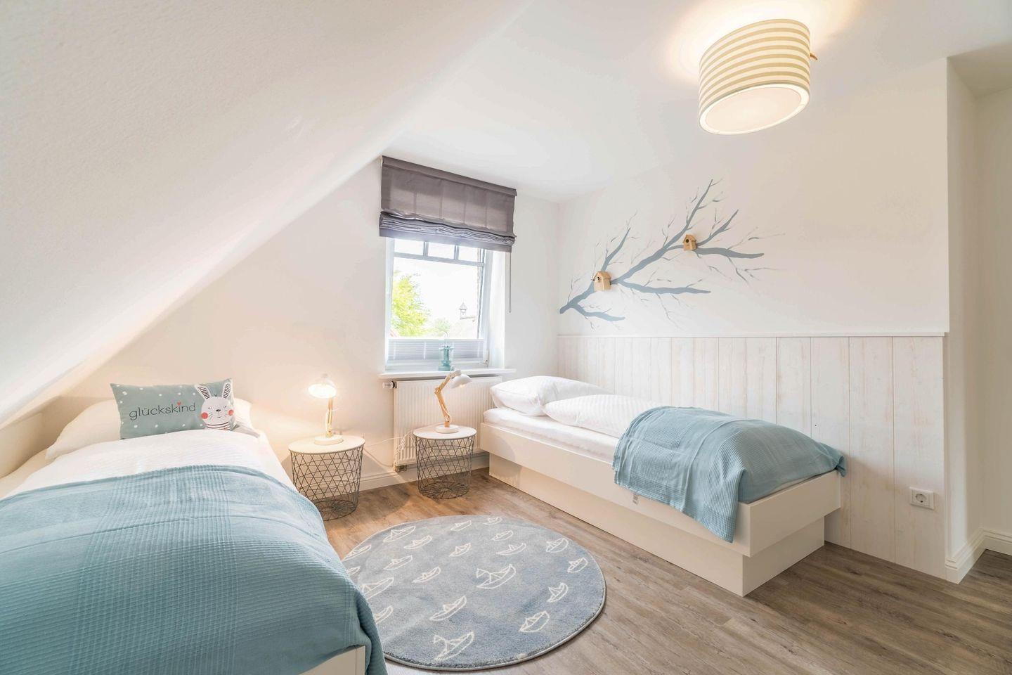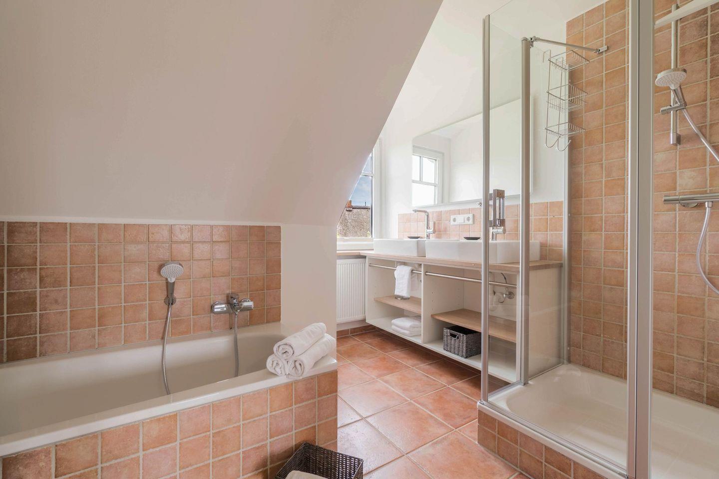 Über die Treppe erreichen Sie das 1. OG. Hier befinden sich drei weitere Schlafzimmer, eins davon ist ebenfalls mit einem Smart-TV ausgestattet. Das Saunazimmer verfügt über eine hochwertige Sauna samt Liegebereich. Das Badezimmer ist mit einer Dusche und einer Badewanne ausgestattet. In allen Schlafzimmern befinden sich Doppelbetten und Einbauschränke, welche vom Tischler angefertigt wurden.