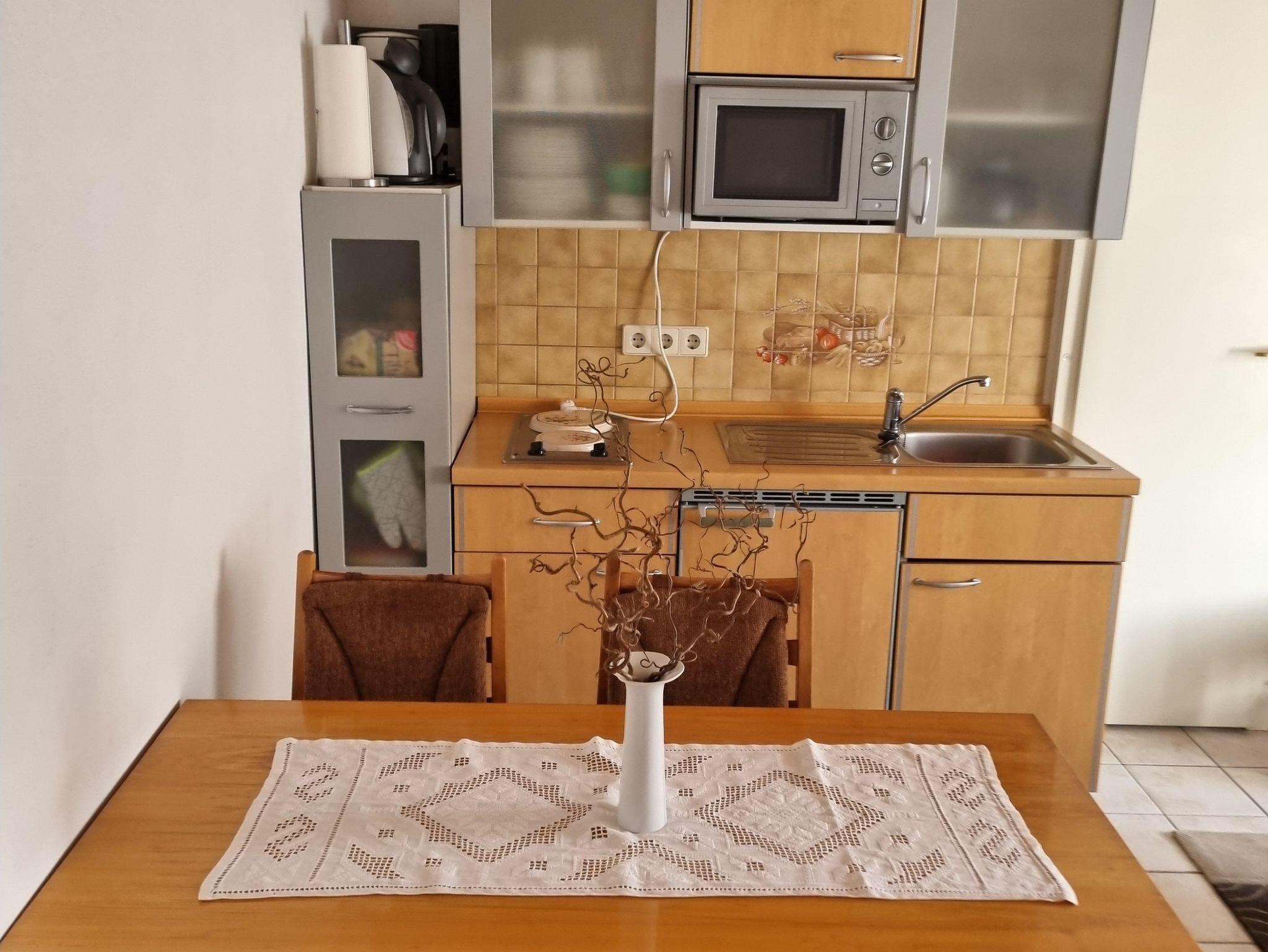 Die Wohnung verfügt über eine Kleinküche mit Kochgelegenheit, Mikowelle und Kühlschrank, Kaffeemaschine, Wasserkocher und Toaster.