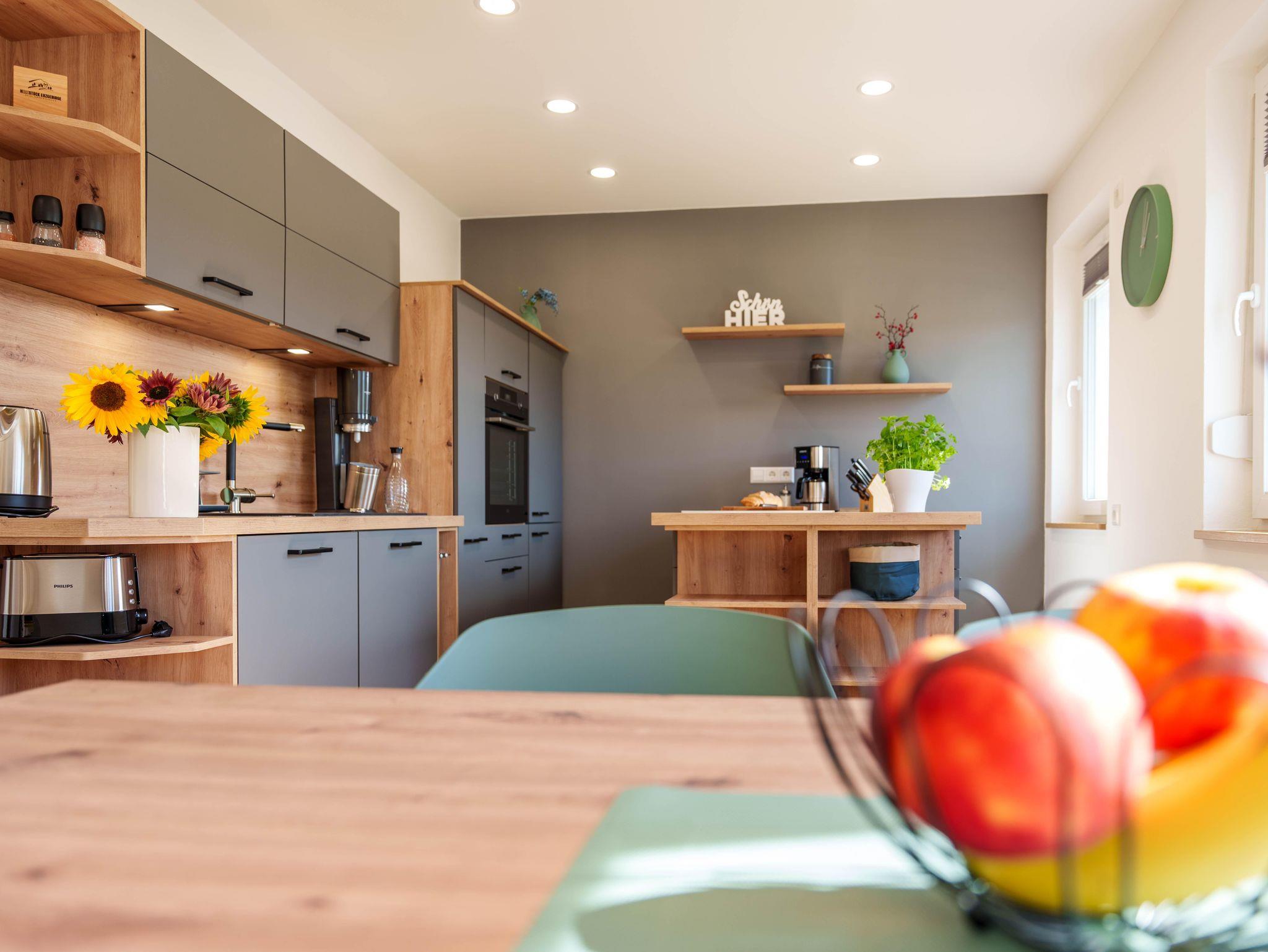 Herzlich Willkommen in unserer großzügigen und komfortablen Ferienwohnung. Sie ist der perfekte Rückzugsort für Ihren erholsamen Urlaub. Es bietet sich ein herrlicher Blick auf die umliegende Landschaft und Natur. Erkunden Sie von diesem idealen Ausgangspunkt die Schönheit des Erzgebirges. Für Ihren nachhaltigen Aufenthalt bei uns legen wir besonderen Wert auf umweltfreundliche Energiequellen und klimaneutrale Maßnahmen. Unsere Ferienwohnung wird durch eine eigene Photovoltaikanlage mit sauberem Strom versorgt. Zusätzlich nutzen wir Solarthermie zur umweltfreundlichen Wärmeerzeugung. Der große Garten vor dem Haus lädt zur Erholung ein und verfügt über einen Sitzbereich mit Grillmöglichkeit. Für unsere kleinen Gäste gibt es ausreichend Spielmöglichkeiten sowie viel Platz auf der grünen Wiese. Im Garten wachsen saisonales Obst, Gemüse und Küchenkräuter.