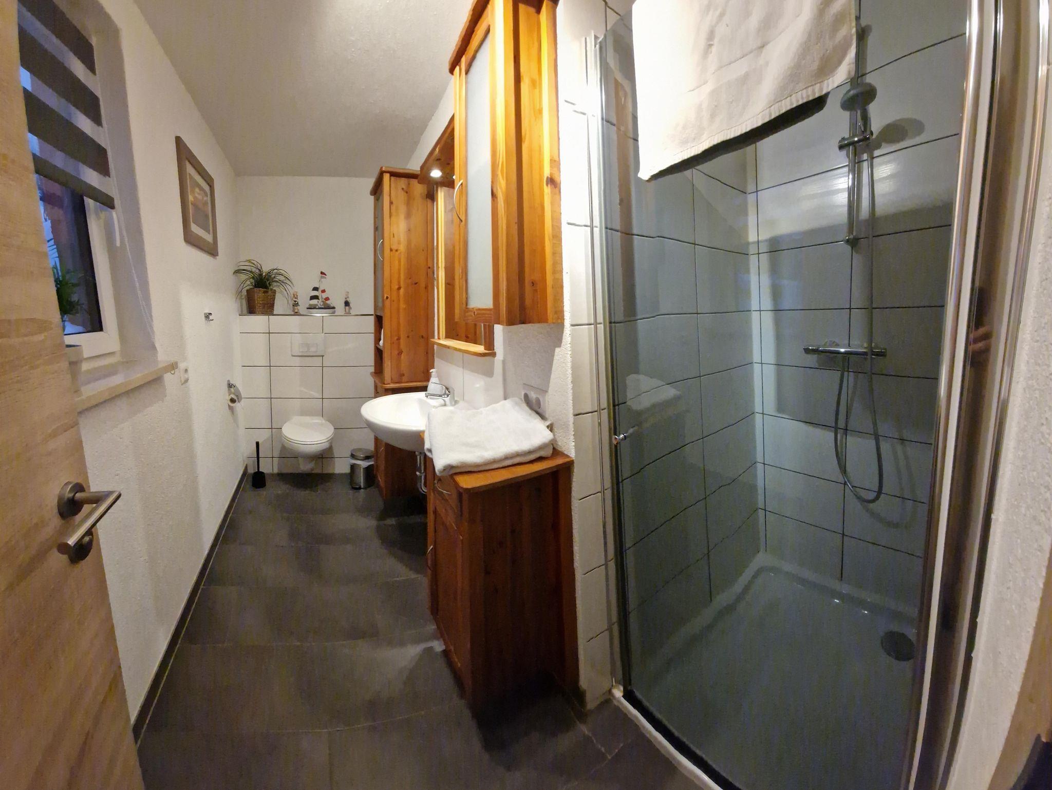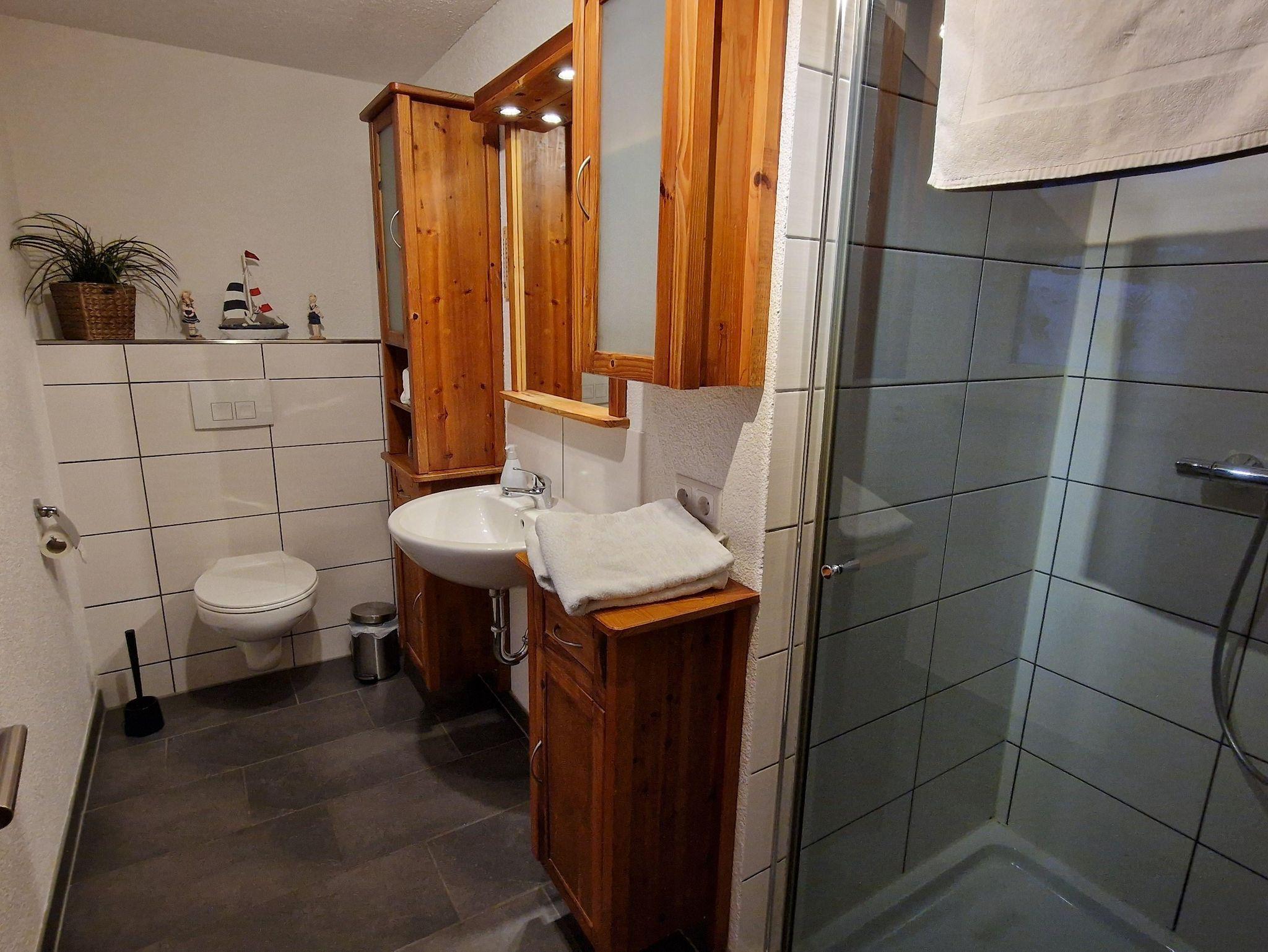 Im modernen Badezimmer genießen Sie den Komfort einer Fußbodenheizung und einer ebenerdigen Dusche. Handtücher werden selbstverständlich bereitgestellt.
