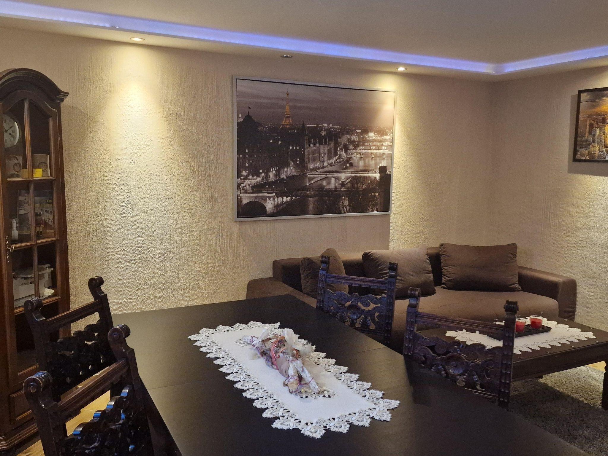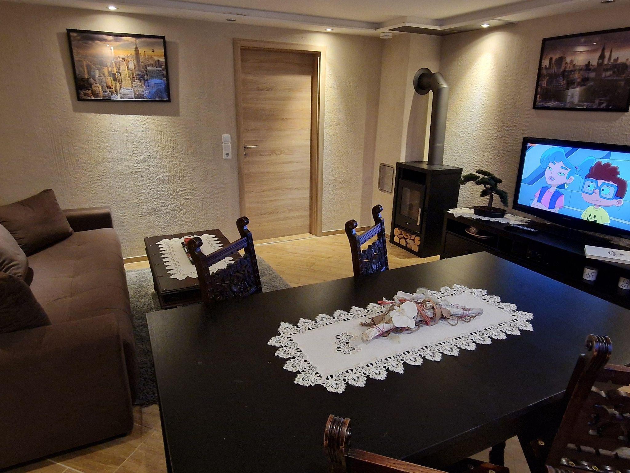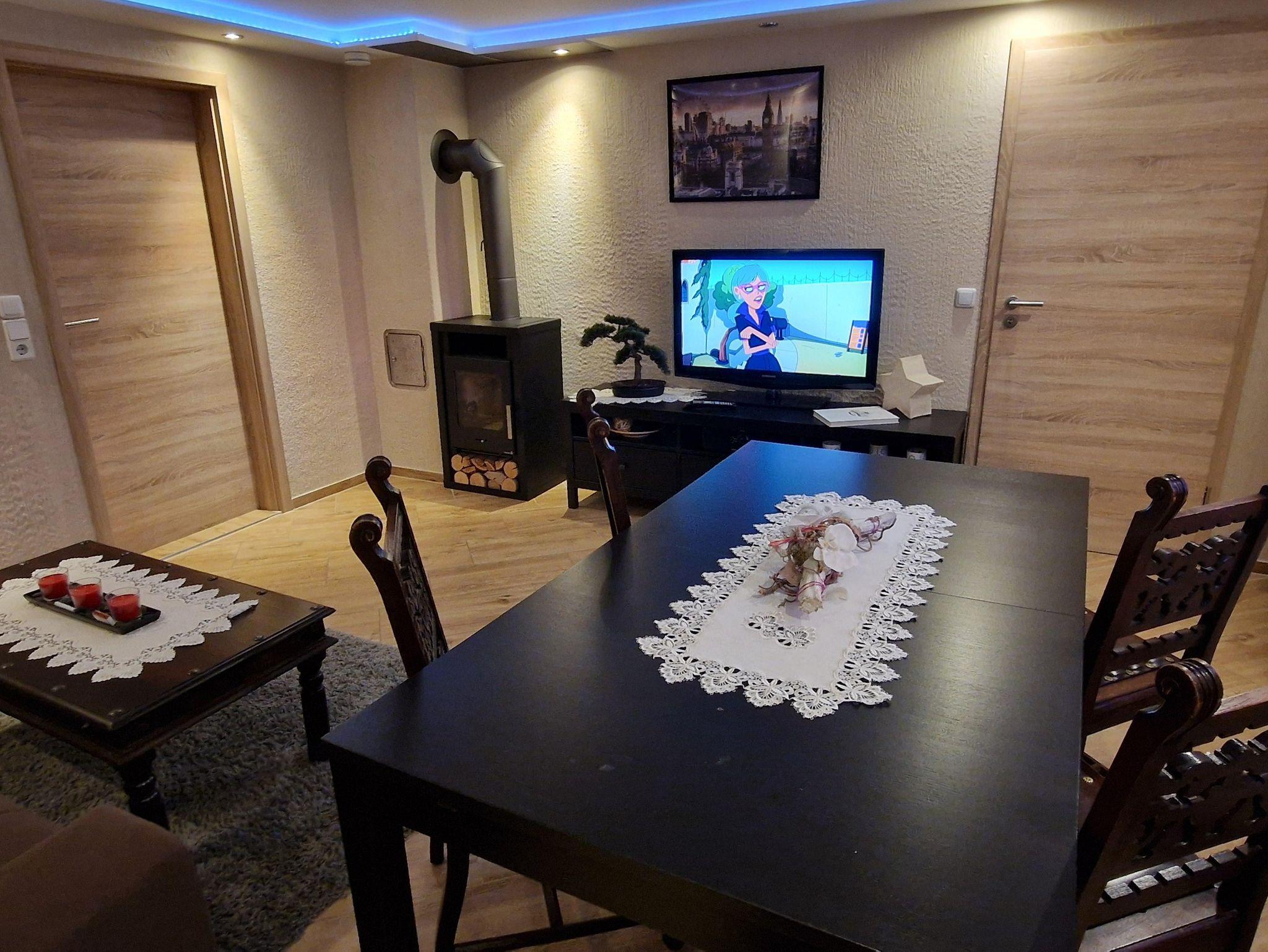 Unsere gemütliche Ferienwohnung bietet alles, was Sie für einen entspannten Aufenthalt benötigen. Im stilvoll eingerichteten Wohnzimmer finden Sie einen TV mit Radio sowie einen einladenden Kamin, der für eine behagliche Atmosphäre sorgt. Der Sitz- und Essbereich bietet ausreichend Platz für bis zu vier Personen und lädt zu geselligen Abenden ein.