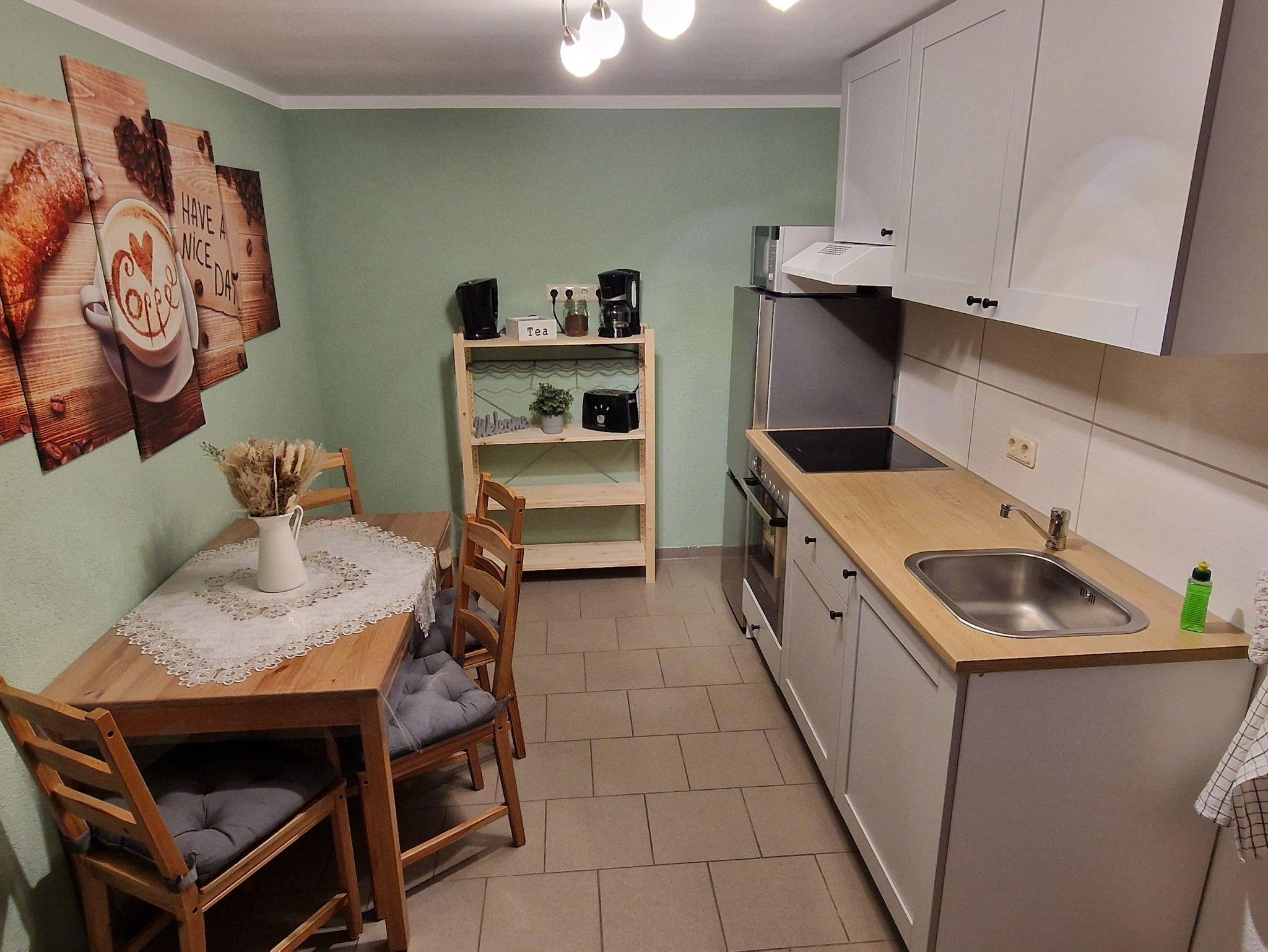 Die Küche ist komplett ausgestattet und lässt keine Wünsche offen. Sie verfügt über einen Kühlschrank, einen Herd mit Backofen, eine Mikrowelle, eine Kaffeemaschine, einen Wasserkocher und einen Toaster – ideal, um Ihre Lieblingsgerichte zuzubereiten.