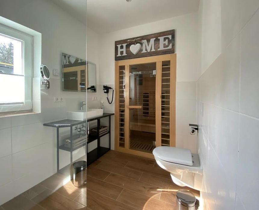 Das Haus ist großzügig geschnitten und bietet einen offenen Wohn- und Küchenbereich mit großem Esstisch für gemeinsame Mahlzeiten und gemütliche Abende. Im Erdgeschoss befindet sich außerdem ein großes Bad mit Infrarotsauna. Im Obergeschoss gibt es neben den Schlafzimmern ein Spielzimmer mit Fußballkicker und Dartscheibe – perfekt für kleine und große Gäste.