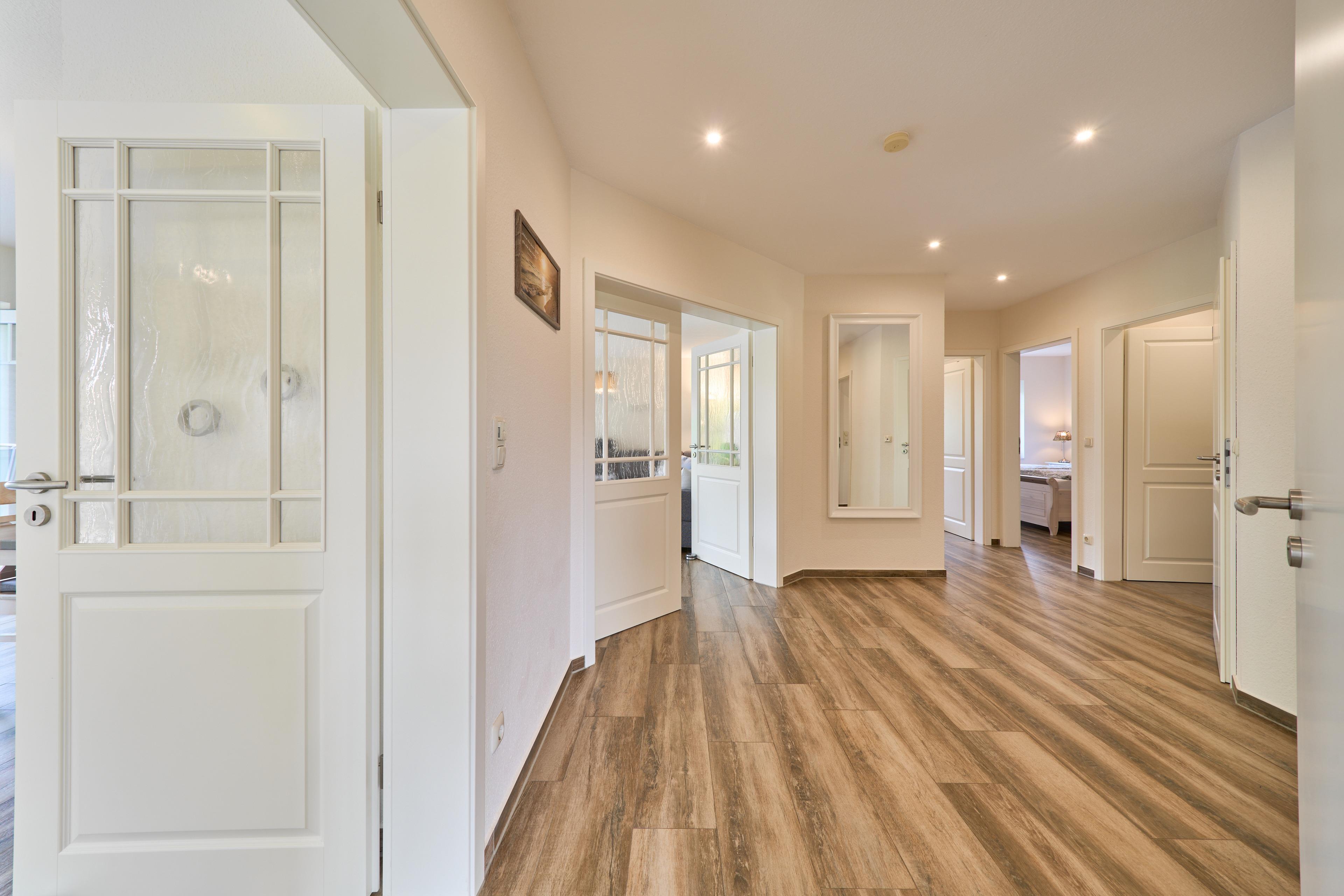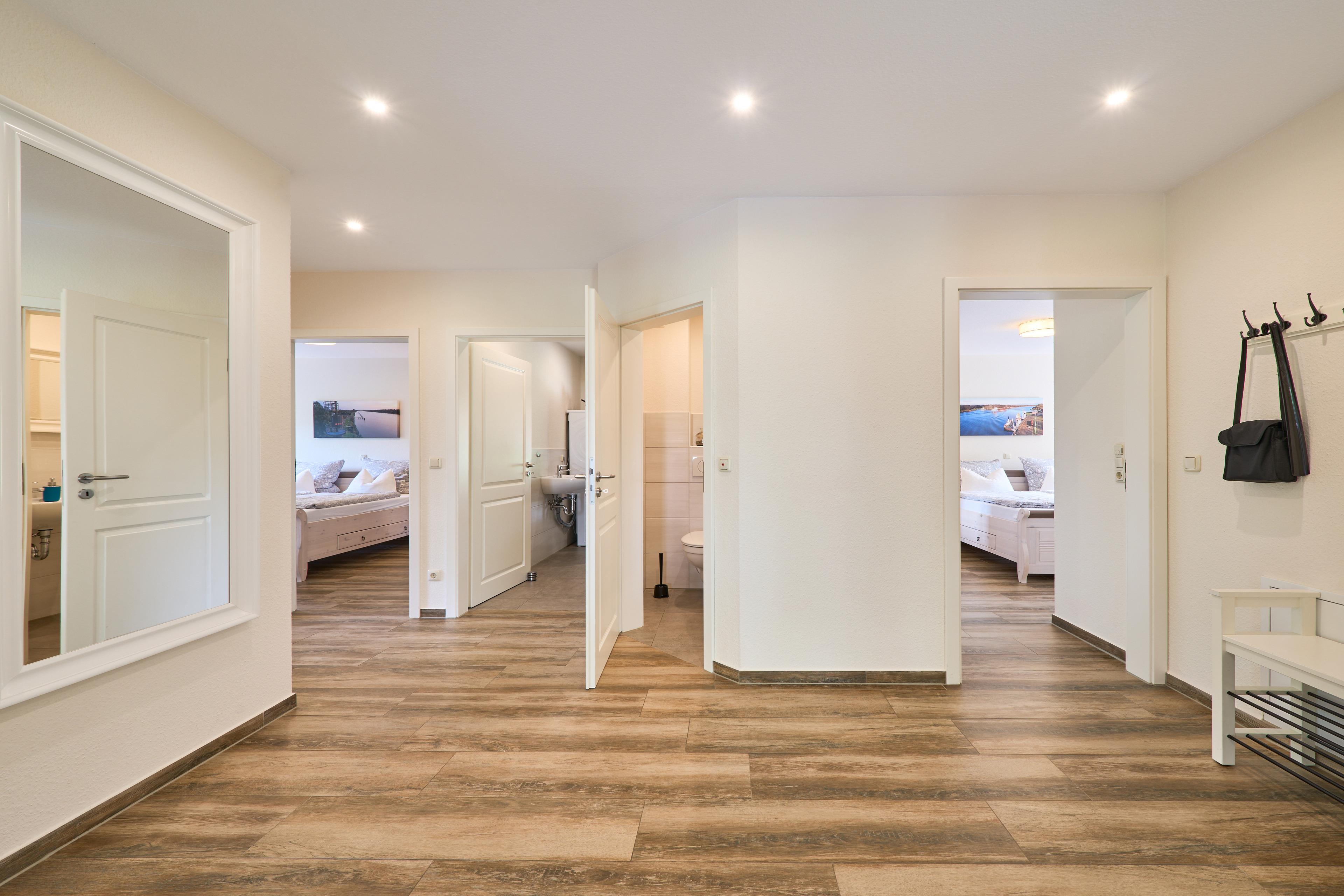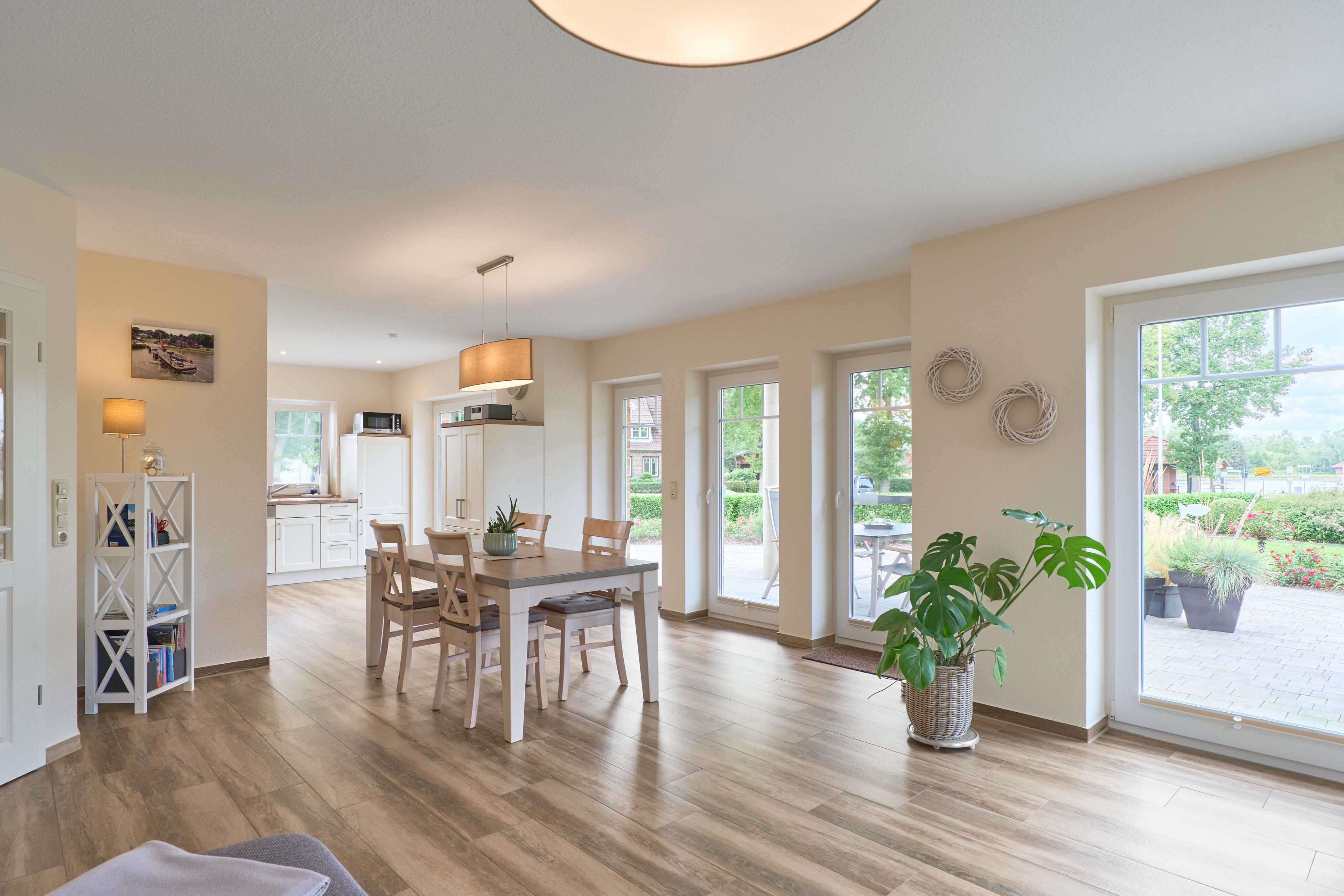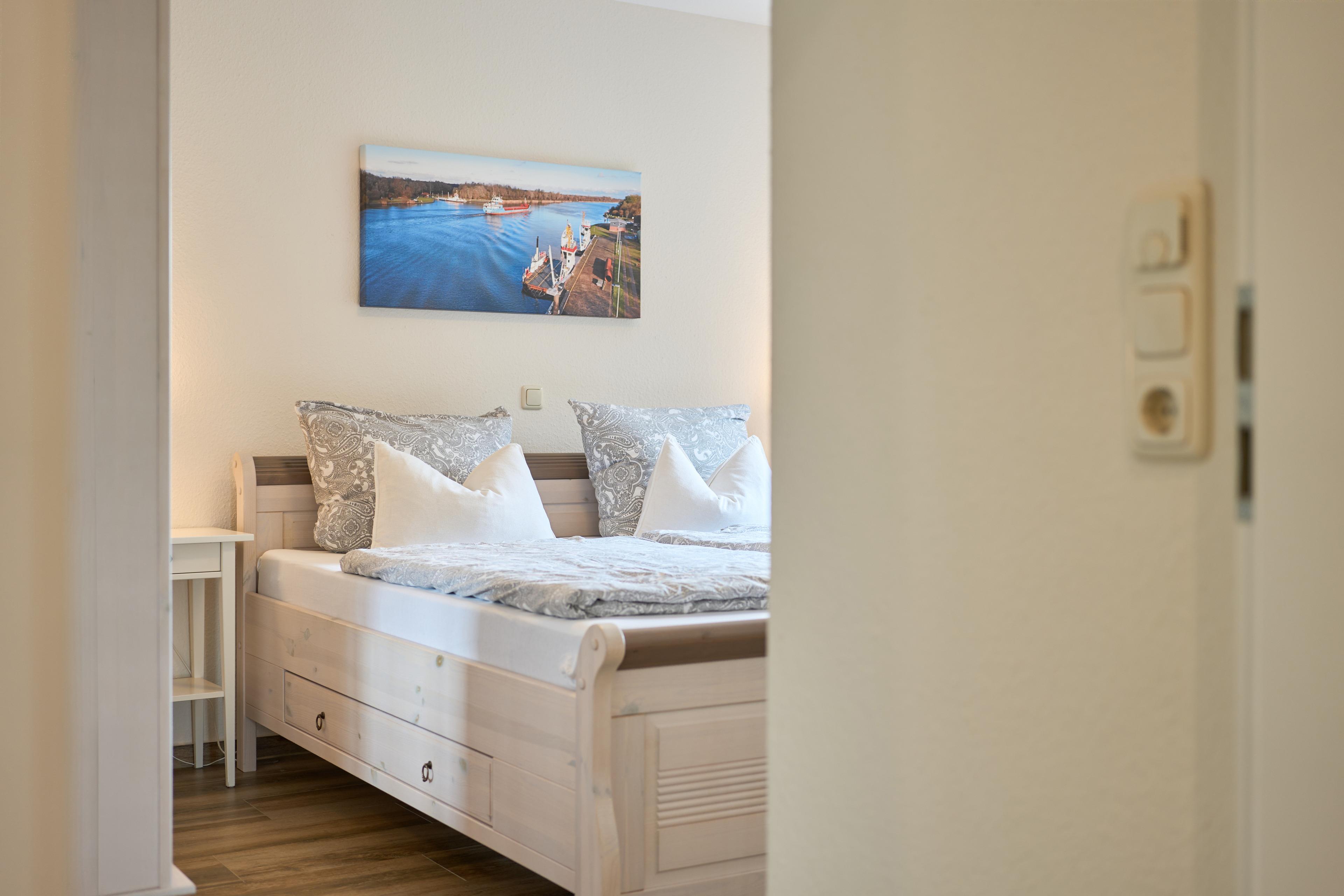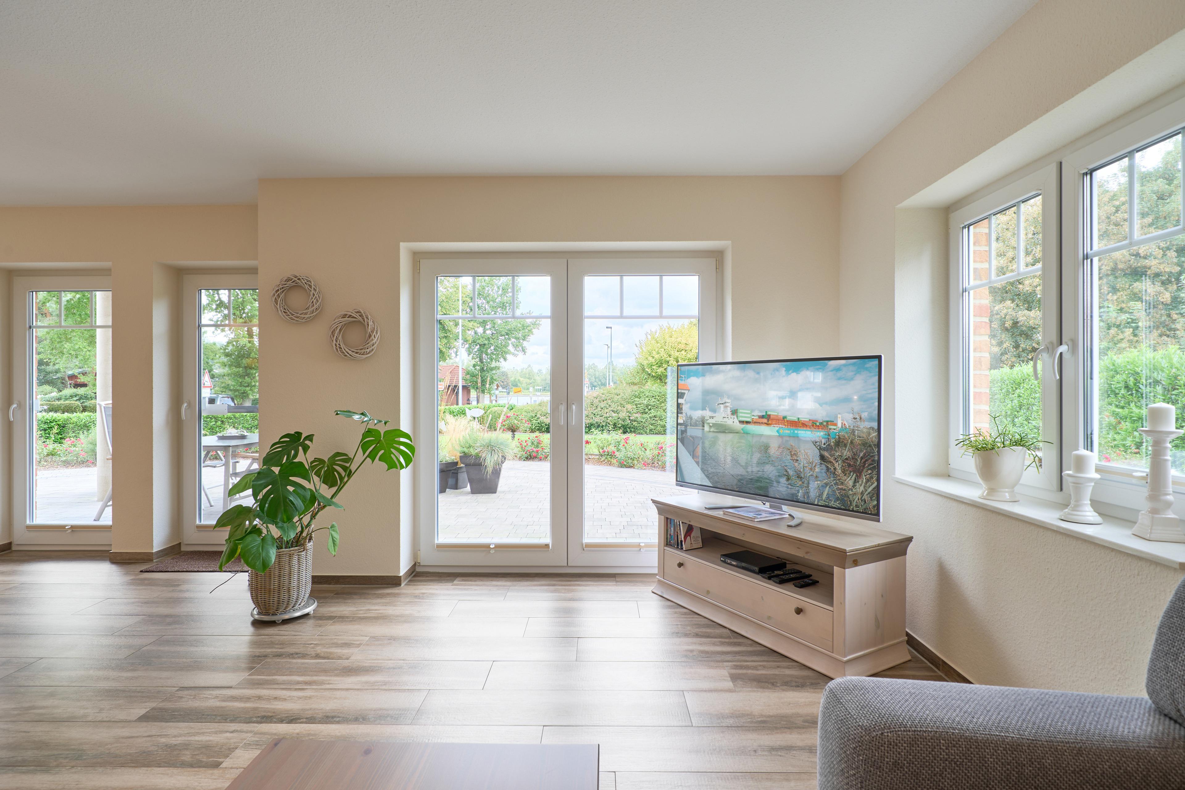 Die Ferienwohnung Schiffsdeck im Erdgeschoss ist hochwertig und geschmackvoll im hellen, modernen Landhausstil eingerichtet. In der lichtdurchfluteten Wohnung finden Sie viel Platz und Komfort für Ihren Traumurlaub. Der großzügige Schnitt der Wohnung lädt zum Erleben ein, ob gemeinsam oder lieber alleine, hier genießen Sie viel Freiraum, aber auch individuelle Rückzugsorte. Auf der großen Sonnenterrasse, die direkt vom Wohn- und Essbereich begehbar ist, finden Sie hochwertige Gartenmöbeln, einen Weber Gasgrill und natürlich einen Sonnenschirm. Der Garten mit viel Rasenfläche ist ideal für Familien mit Kindern. Die Wohnung ist bedingt barrierefrei, auf Wunsch steht Ihnen ein mobile Rollstuhlrampe zur Verfügung. Von der Nebeneingangstür zusätzlich zum Haupteingang könne Sie die Wohnung direkt vom Carport aus betreten. Zwei geräumige Schlafzimmer (Doppelbett 180x200) mit TV laden hier nach einem tollen Urlaubstag zum Träumen ein. Die Schlafzimmer haben zusätzlich zu den Plissees elektrische Aussenrollläden, damit Sie auch im Sommer nicht auf einen erholsamen Schlaf verzichten müssen. Der Wohn- und Essbereich bietet mit seinen bodentiefen Fenstern einen herrlichen Blick auf den NOK. Träumen Sie beim Kochen in der hochwertig ausgestatteten Küche von großen Pötten und der weiten Welt oder genießen Sie von der großen Wohnlandschaft das ständige pendeln der Fähre. Die Wohnung ist komplett ausgestattet, neben dem 55 Zoll TV mit DVD Player und Sonoro Soundsystem, im Wohnbereich, finden Sie eine feine Auswahl an Lektüren und Spielen. Unsere kleinen Gäste liegen uns sehr am Herzen, für sie stellen wir Ihnen gerne unsere Kleinkindausstattung zur Verfügung. Genießen Sie entspannte Sonnentage in der sehr gepflegten Gartenanlage mit viel Platz zum relaxen, Kraft tanken, entspannen oder toben und spielen. Staunen Sie über die vorbeiziehenden Schiffe oder beobachten Sie das rege Treiben der NOK- Fähre.