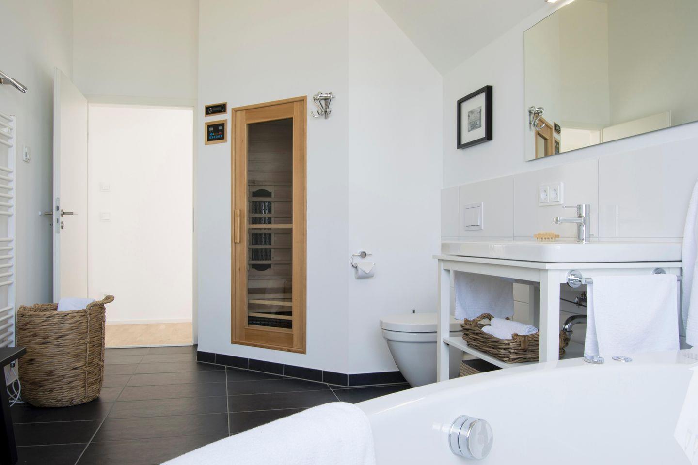 Eins der beiden Badezimmer verwöhnt Dich mit einer Dusche und Whirlwanne– der perfekte Ort zum Entspannen und Relaxen! Zudem profitierst Du von einem zweiten Badezimmer mit Dusche, was besonders für Familien oder Gruppen von Vorteil ist. Für Wohlfühlmomente sorgt die zur Ferienwohnung gehörende Infrarot-Sauna, die Ihnen nach einem Tag am Strand eine wohltuende Erholung bietet.
