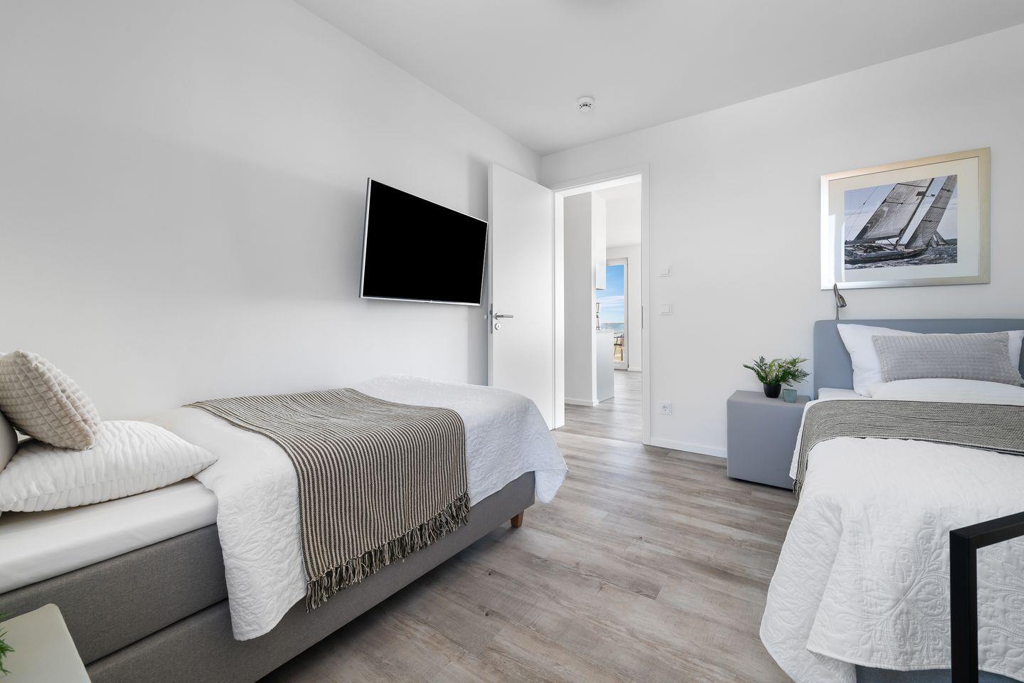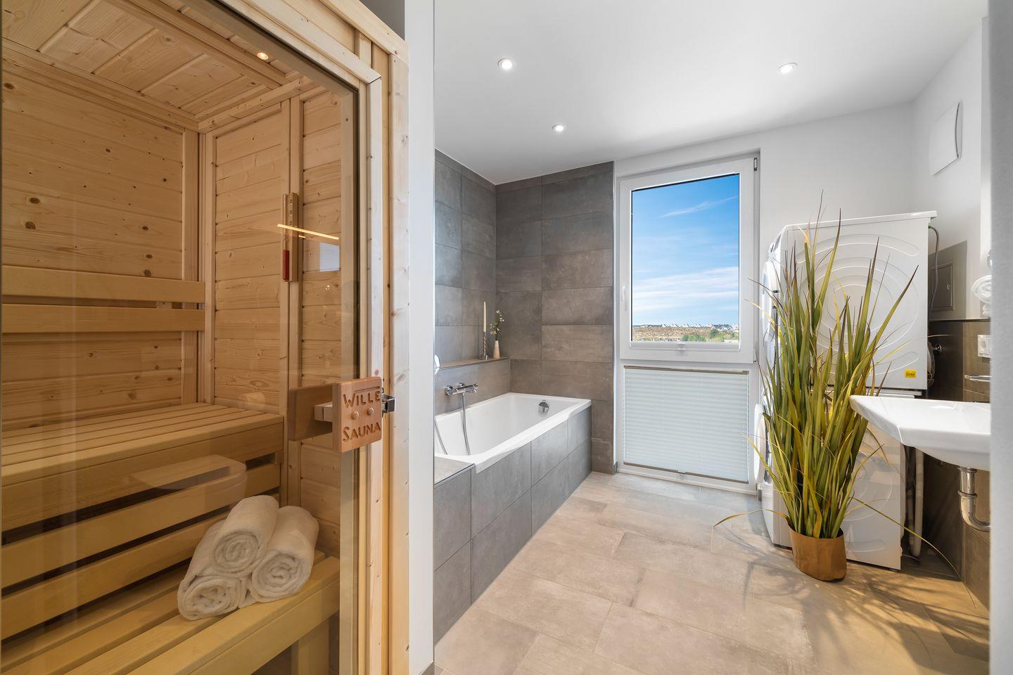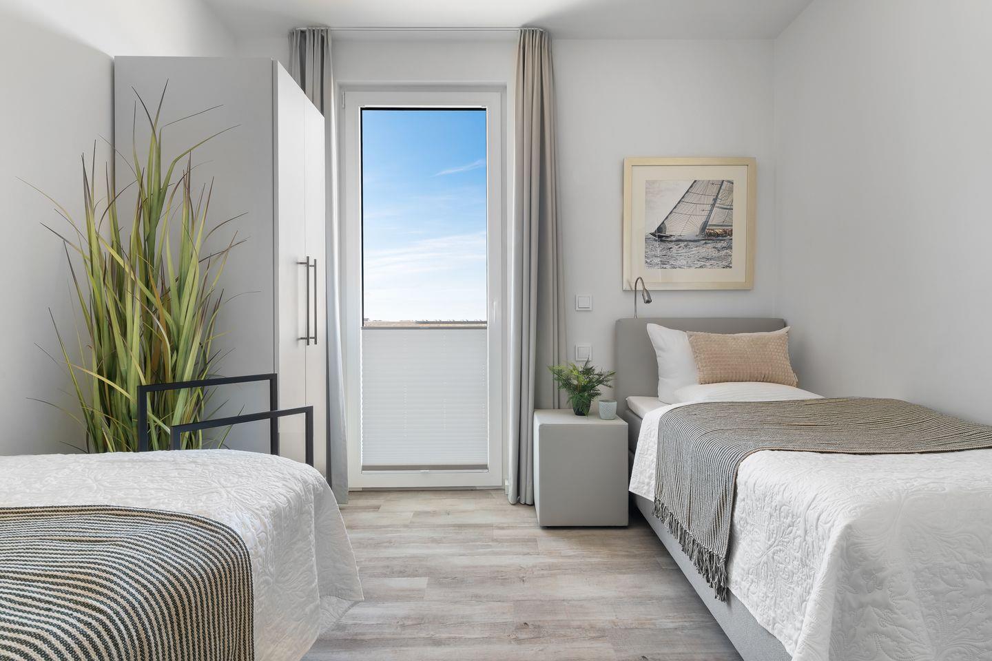Das Apartment "BeachWaveOne" bietet zwei Schlafzimmer, ausgestattet mit hochwertigen Boxspringbetten für einen erholsamen Schlaf. Entspannen Sie sich in der finnischen Sauna oder genießen Sie ein Bad in der großzügigen Wanne.