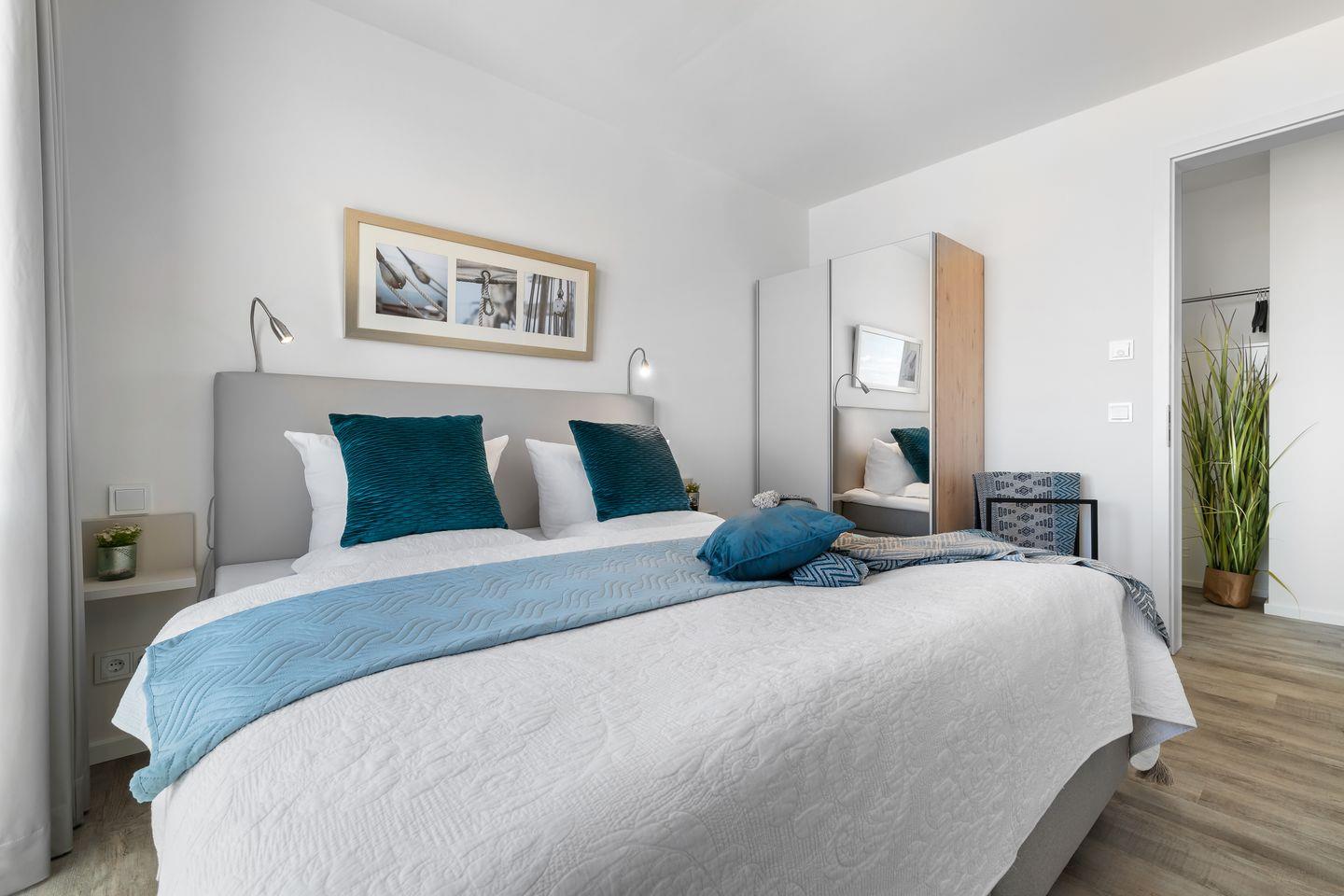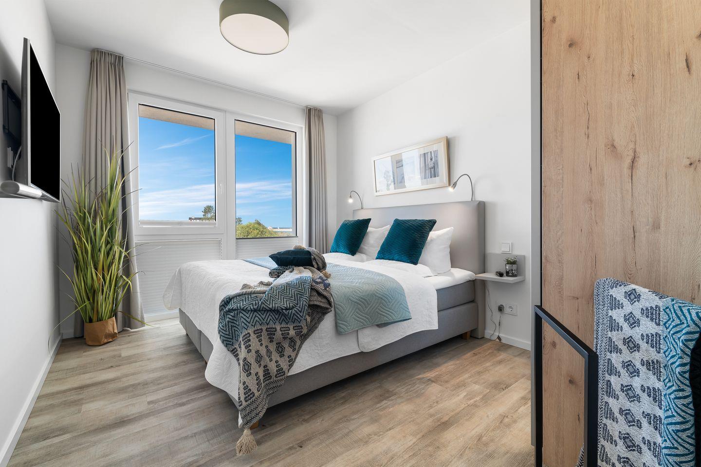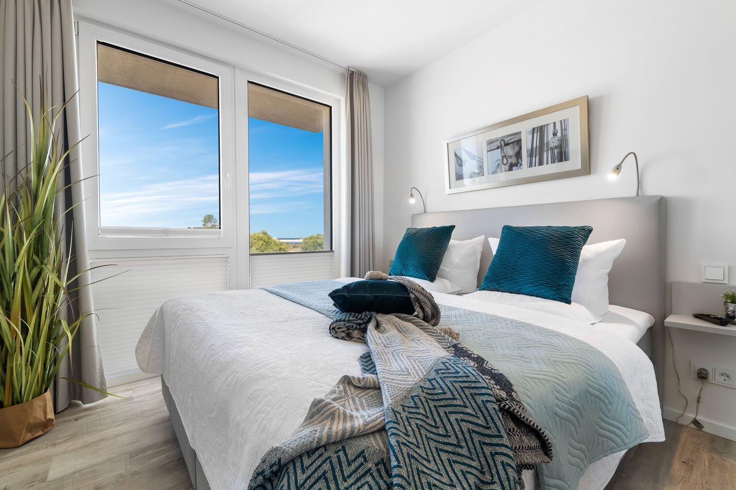 Das Apartment "BeachWaveOne" bietet zwei Schlafzimmer, ausgestattet mit hochwertigen Boxspringbetten für einen erholsamen Schlaf. Entspannen Sie sich in der finnischen Sauna oder genießen Sie ein Bad in der großzügigen Wanne.