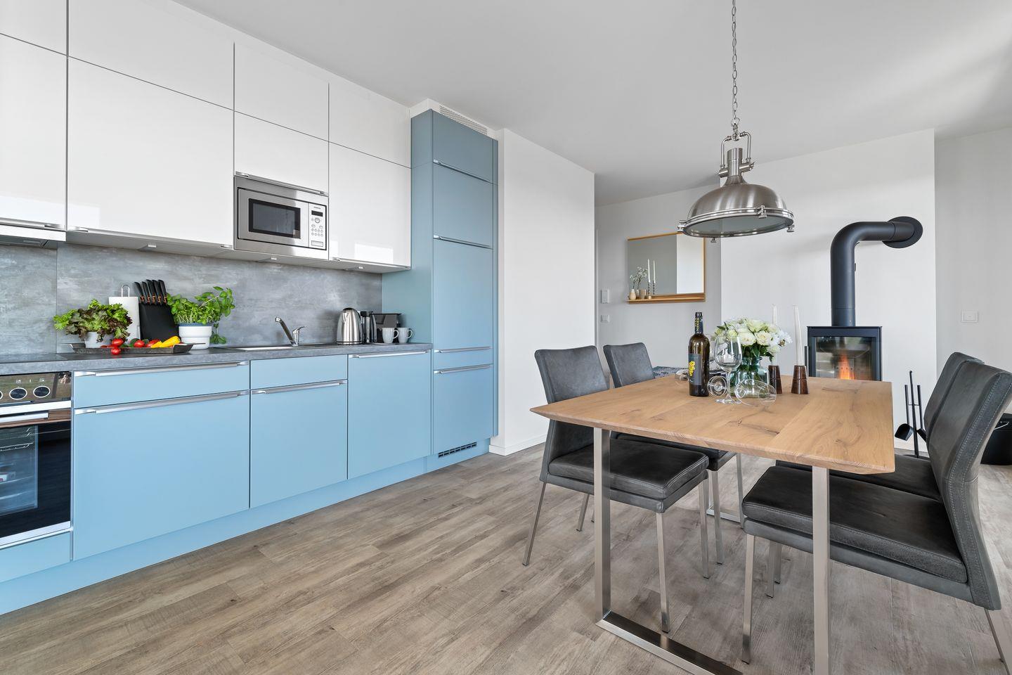 Der großzügige Wohn- und Essbereich ist der perfekte Ort für gesellige Stunden. Ausgestattet mit einer vollintegrierten Küche, können Sie hier leckere Mahlzeiten für Familie und Freunde zubereiten, während Sie den Blick auf die vorbeiziehenden Segelboote genießen. In der kühleren Jahreszeit sorgt der Kamin für gemütliche Atmosphäre.