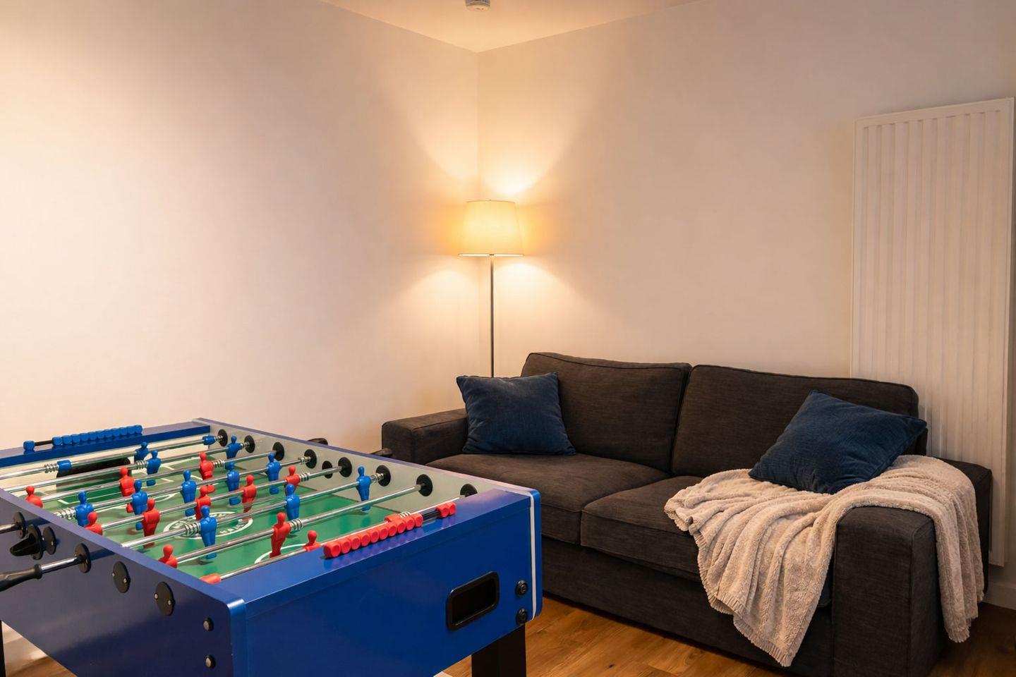 Die Ferienwohnung "Harbour Lodge" hat eine Größe von etwa 175 m² und erstreckt sich über drei Etagen. Im Erdgeschoss befindet sich ein Schlafzimmer, ein Badezimmer mit Badewanne, eine voll ausgestattete Küche und ein geräumiges Wohnzimmer mit Zugang zur Terrasse. Der ersten Stock bietet zwei weitere Schlafzimmer, ein Badezimmer mit Sauna sowie einen Balkon mit Blick auf den Hafen es Ostseeresort Olpenitz und die Schlei. Im Souterrain erwartet Sie ein Spiel- und Relaxbereich mit Tischkicker, ideal für die gemeinsame Freizeitgestaltung mit Kindern.