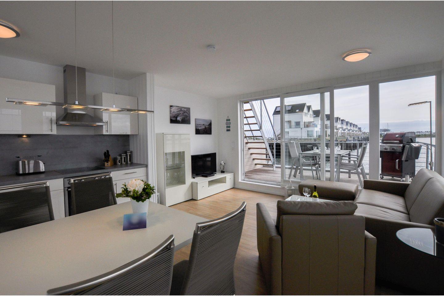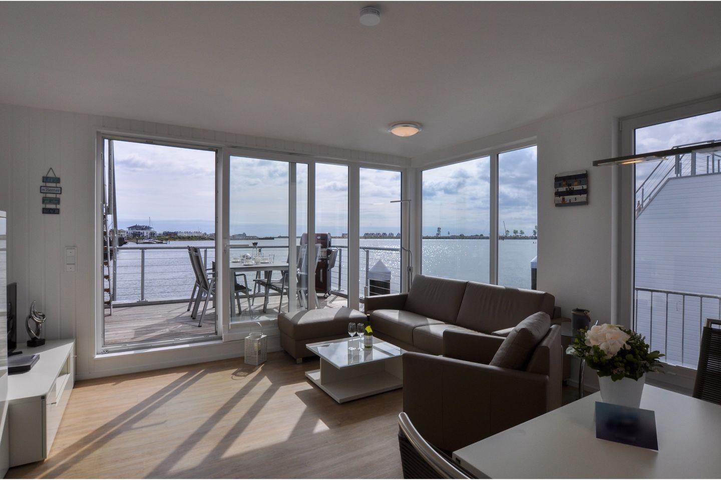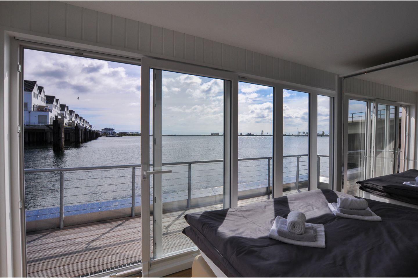 Das schwimmende Ferienhaus "Hausboot" liegt im Hafenbecken von Olpenitz mit malerischem Blick auf die Hafenausfahrt. Es bietet auf 97 m² Platz für bis zu 5 Personen und hat 2 Schlafzimmer, eins mit Doppelboxspringbett, das andere mit 2 Einzelbetten, mit je einem Smart-TV. Der fünfte Schlafplatz ist ein Schlafsofa. Zudem verfügt es über eine moderne, offene Küche, eine Sauna, WLAN sowie eine Dachterrasse mit Grill und einen eigenen Bootsliegeplatz sowie PKW-Parkplatz. Haustiere sind willkommen.