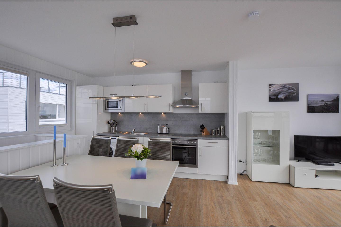 Der offene Küchenbereich, direkt an den Wohnbereich anschließend, ist mit einer Spülmaschine, einer Kaffee- und Espressomaschine, einem Eierkocher, einem Toaster, einem Waffeleisen sowie weiteren umfangreichen Küchenutensilien ausgestattet und lädt Dich zu geselligen Kochabenden ein. Ein Mixer und ein Abfalleimer sind ebenfalls vorhanden.