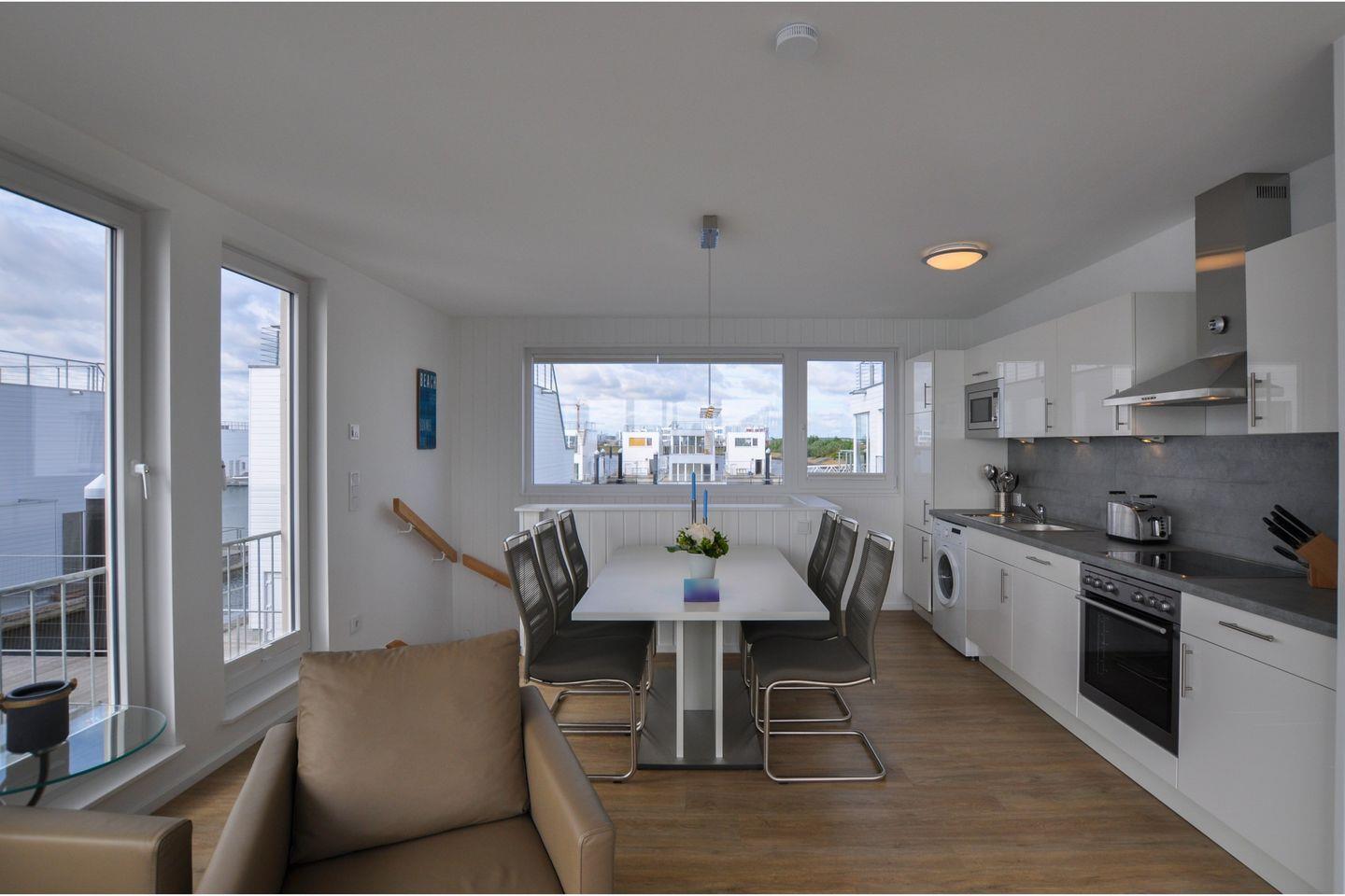 Im offen gestalteten Wohnbereich im Obergeschoss verbinden sich Gemütlichkeit und moderne Ausstattung. Dir stehen ein gemütliches Sofa, ein Sessel, ein Esstisch sowie ein Smart-TV zur Verfügung. Das Schlafsofa (120x190cm) kann als Schlafmöglichkeit für die fünfte Person genutzt werden. Für Unterhaltung sorgen Dir WLAN, ein DVD- und Blu-ray-Player sowie Gesellschaftsspiele.