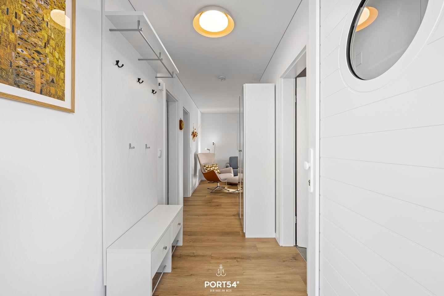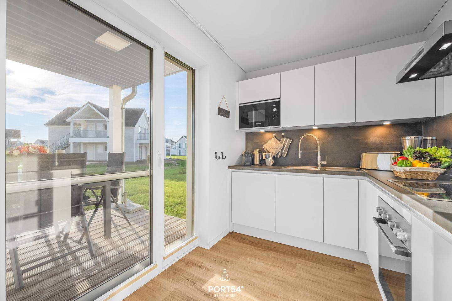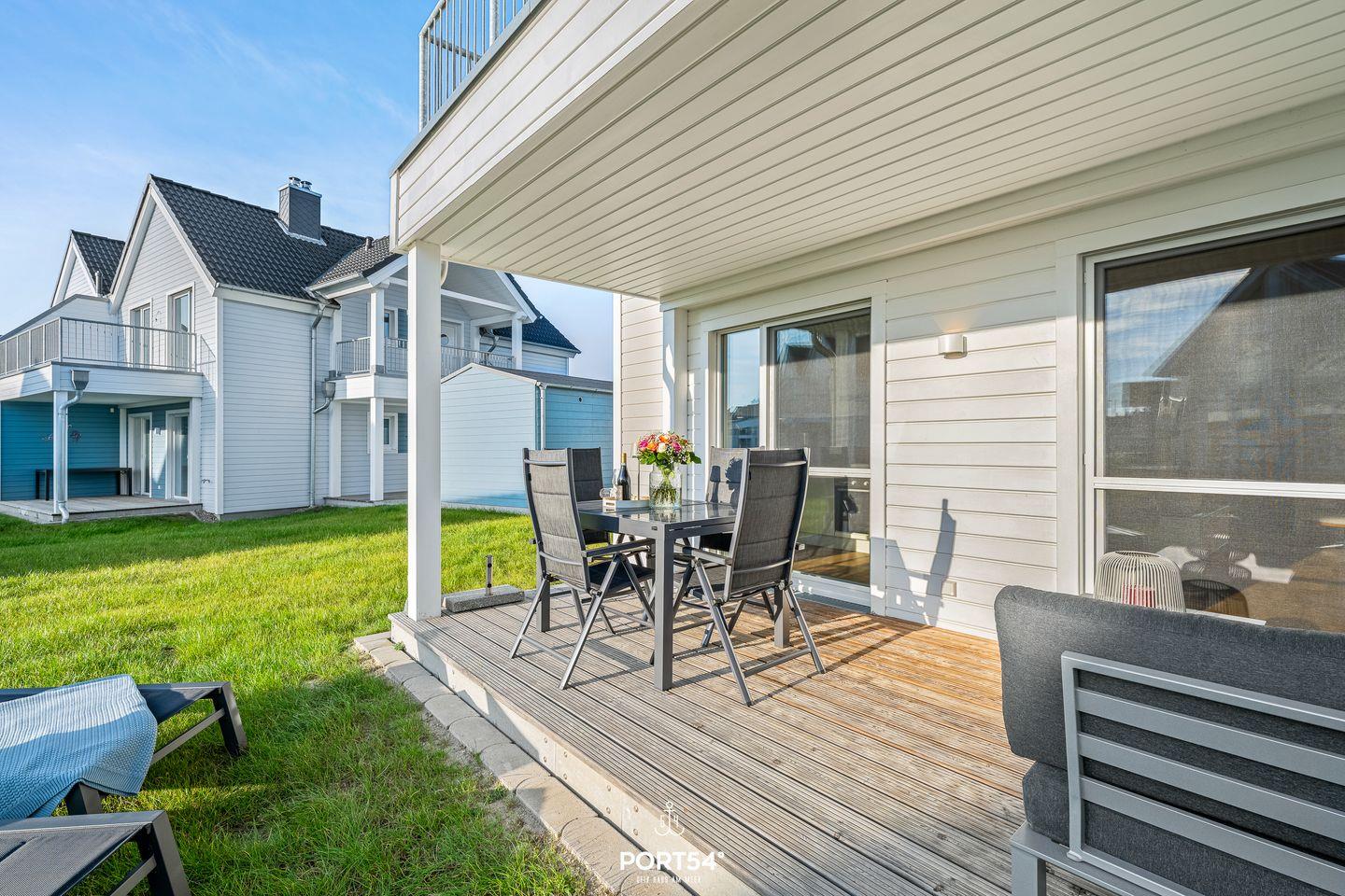 Nur wenige Meter vom Meer entfernt erwartet Dich ein stilvoll eingerichtetes Urlaubsdomizil, das mit seiner Kombination aus Komfort, Design und maritimer Leichtigkeit begeistert. Die Wohnung bietet Dir Platz für bis zu vier Personen und ist ideal für Paare, Familien oder kleine Freundesgruppen. Im gemütlichen Wohnzimmer laden ein komfortables Sofa und ein Smart-TV zum Entspannen ein. An kühleren Tagen schafft der Kaminofen eine besonders behagliche Atmosphäre. Direkt angrenzend öffnet sich die überdachte Terrasse, ausgestattet mit hochwertigen Gartenmöbeln, Strandkorb und Sonnenliegen. Hier kannst Du den Tag bei einem Glas Wein ausklingen lassen oder morgens beim Frühstück die frische Ostseeluft genießen.