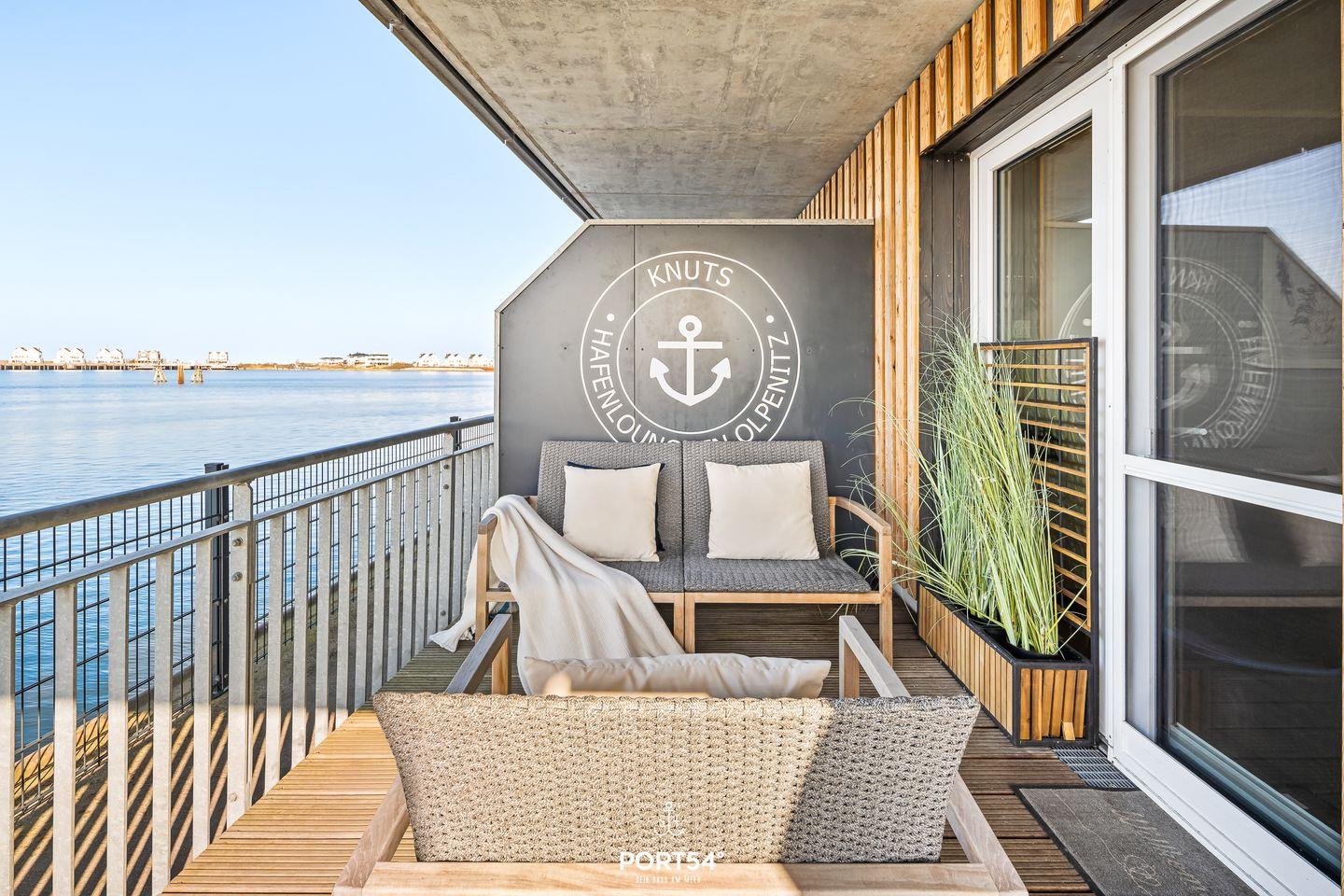Exklusive Ferienwohnung Knuts Hafenlounge mit Meerblick, Terrasse, Infrarotkabine und eigenem Stellplatz in Olpenitz.