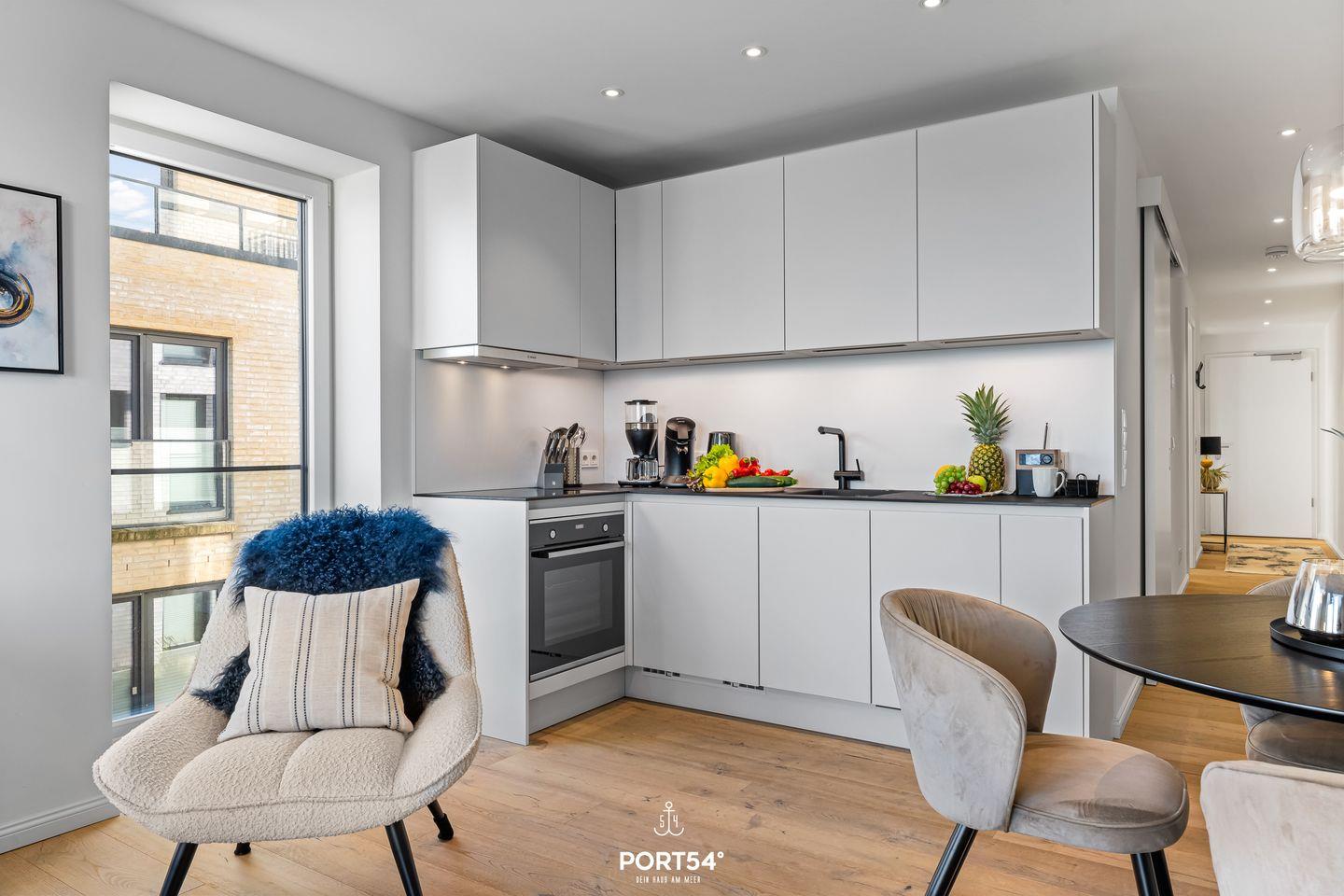 Direkt vor den bodentiefen Fenstern entfaltet sich ein atemberaubender Meerblick, der das gesamte Apartment mit natürlichem Licht durchflutet. Jeden Tag erwartet Dich ein fantastischer Blick auf die Ostsee – vom ersten Sonnenstrahl bis zum beruhigenden Sonnenuntergang. Der offene Wohn- und Essbereich ist der perfekte Ort, um den Tag zu genießen: Vom Kochen bis zum entspannten Verweilen bietet Dir dieser Raum alles, was das Herz begehrt.