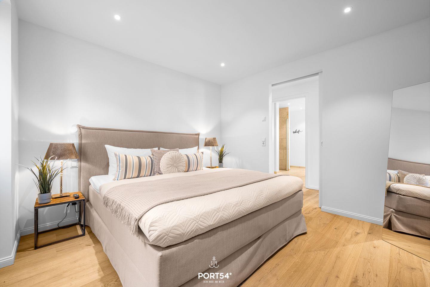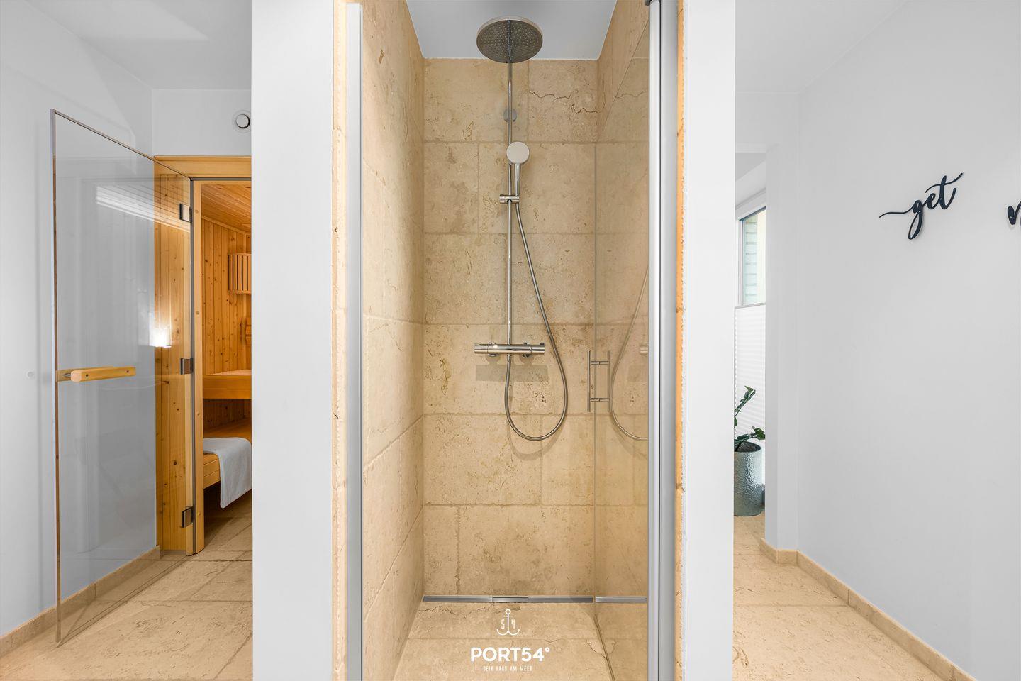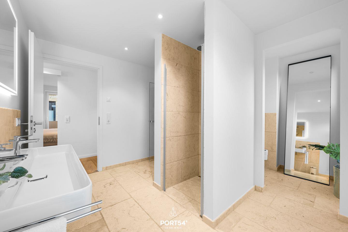 Zwei moderne Bäder sorgen für Deinen täglichen Komfort. Beide sind mit ebenerdigen Duschen ausgestattet, die den Raum großzügig und einladend wirken lassen. Das erste Bad ist besonders luxuriös mit einer eigenen finnischen Sauna, die zu jeder Jahreszeit zu purer Entspannung einlädt – ideal nach einem erfrischenden Strandspaziergang. Im zweiten Bad steht ein praktischer Waschtrockner bereit, der es Dir ermöglicht, Deine Wäsche bequem zu waschen und zu trocknen – ohne Kompromisse bei Deinem Komfort.