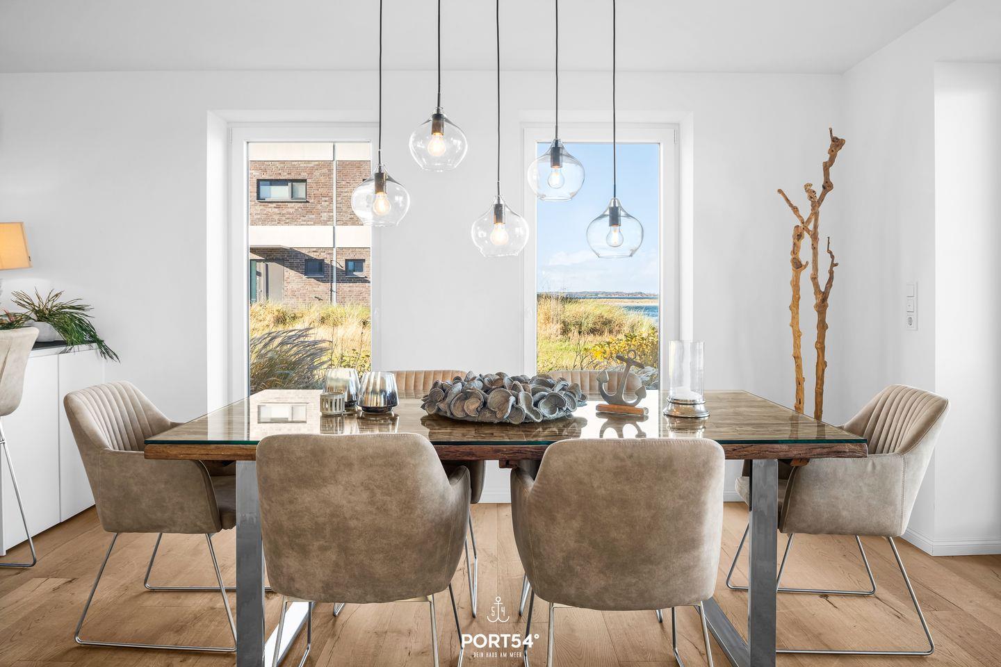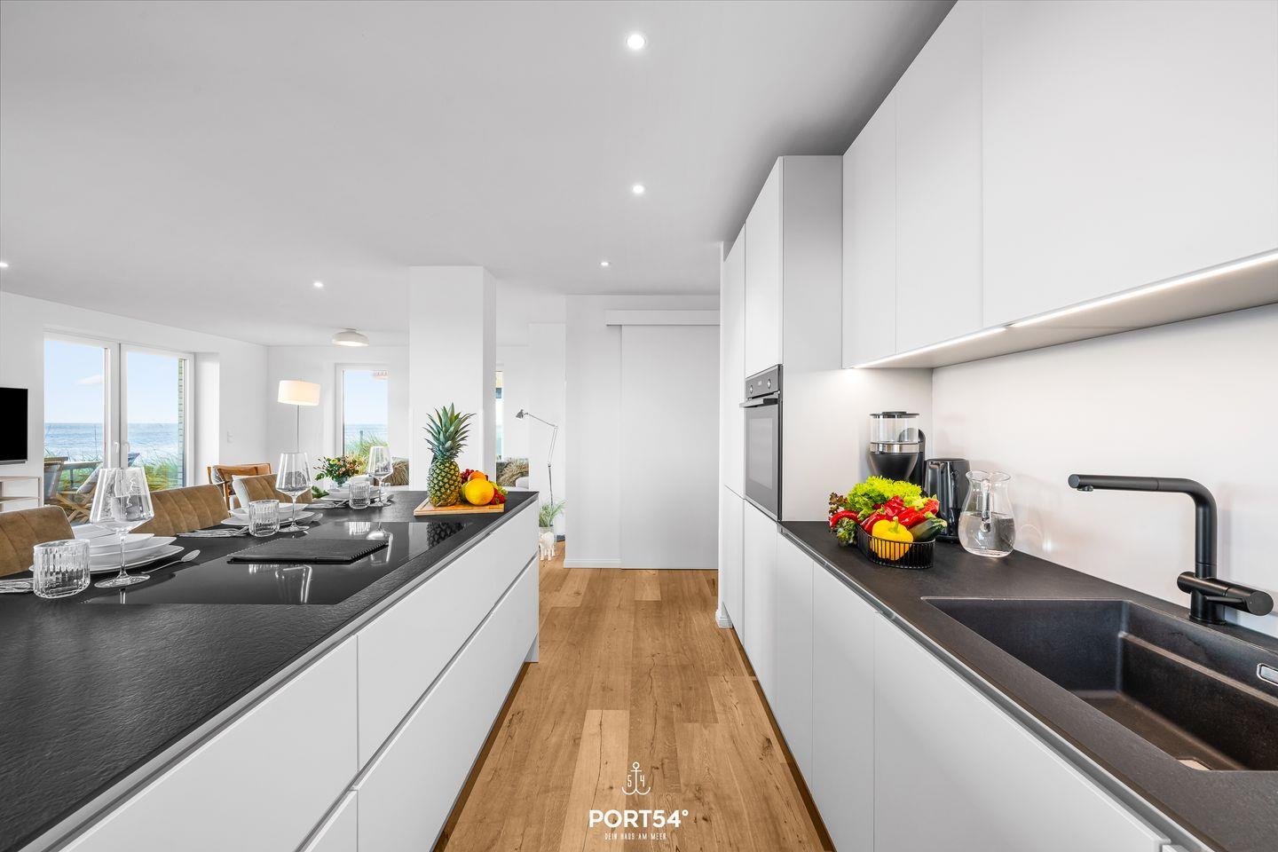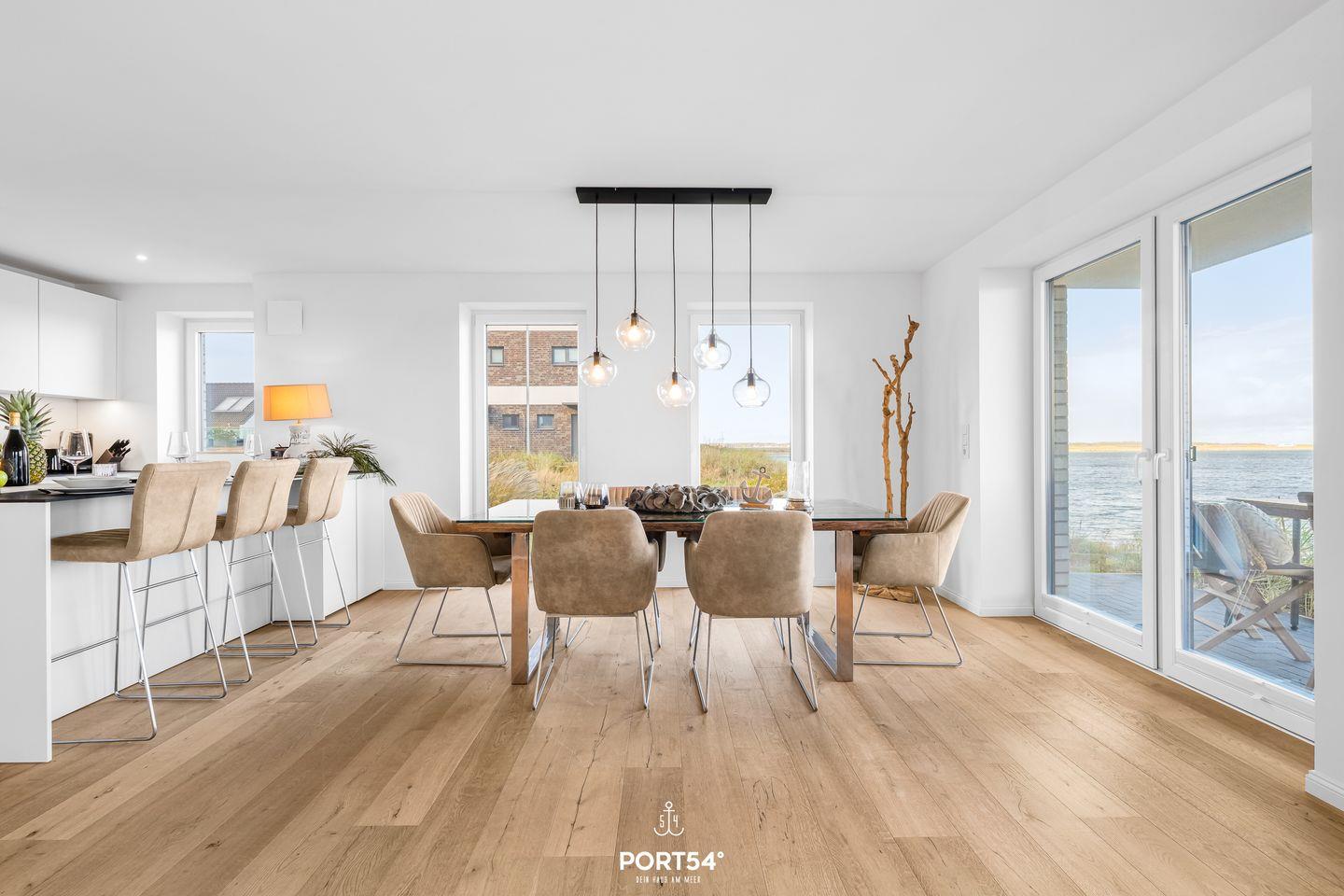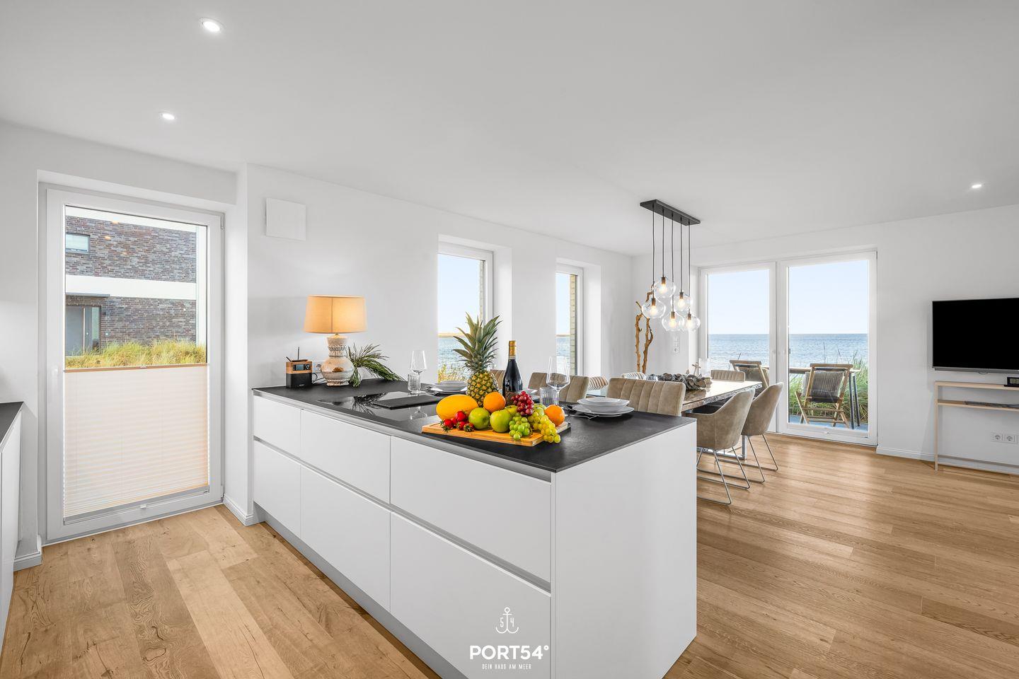 Der offene Wohn- und Essbereich lädt zum Verweilen und Genießen ein. Eine voll ausgestattete, grifflos gestaltete Küche macht das Kochen zu einem Erlebnis, während der gemütliche Küchentresen und der elegante Esstisch mit Meerblick den Raum für unvergessliche gemeinsame Mahlzeiten bieten. Ob beim Kochen oder Relaxen – der atemberaubende Blick auf die Ostsee wird Dein ständiger Begleiter sein. Das helle Wohnzimmer öffnet sich mit großen Fenstern direkt zur See, sodass Du jederzeit den beruhigenden Anblick des Wassers und das sanfte Meeresrauschen genießen kannst.