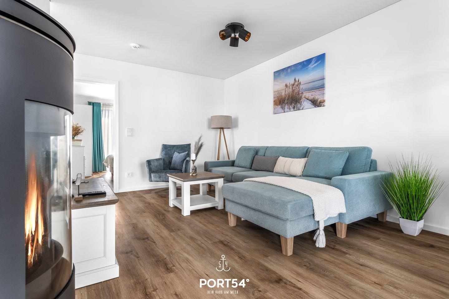 Der Wohnbereich lädt mit Kaminofen zu gemütlichen Abenden ein. WLAN, ein Fernseher sowie Spiele sorgen für Unterhaltung und Abwechslung.
