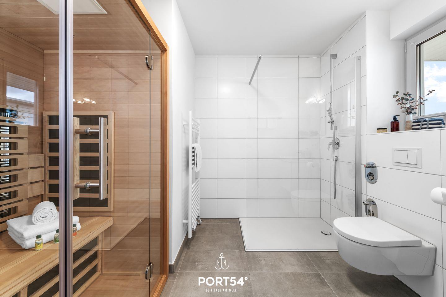 Das Badezimmer ist hell gestaltet und verfügt über eine bodengleiche Dusche. Ein besonderes Extra ist die zur Wohnung gehörende Sauna, ideal für entspannte Stunden nach einem aktiven Tag.