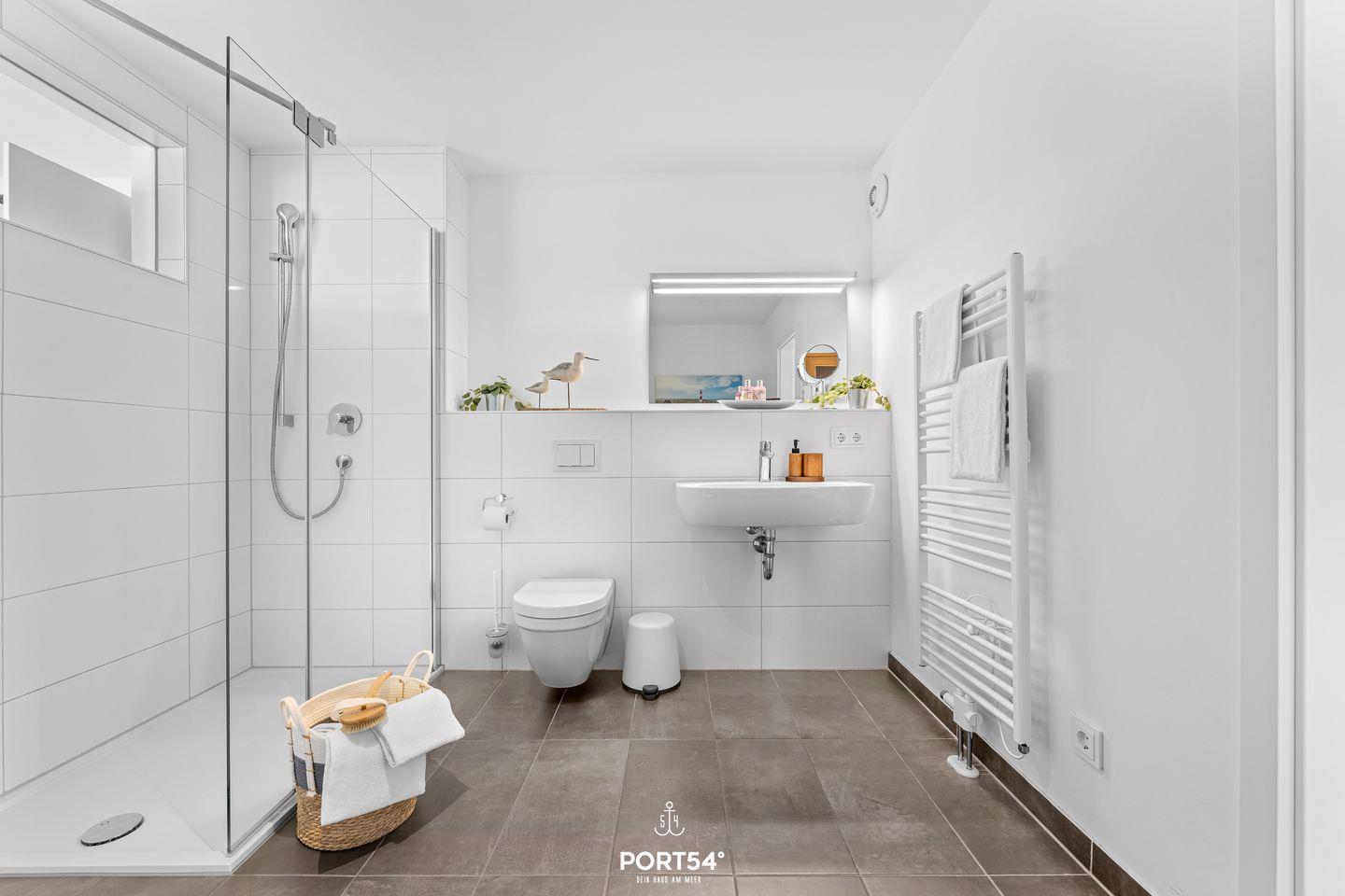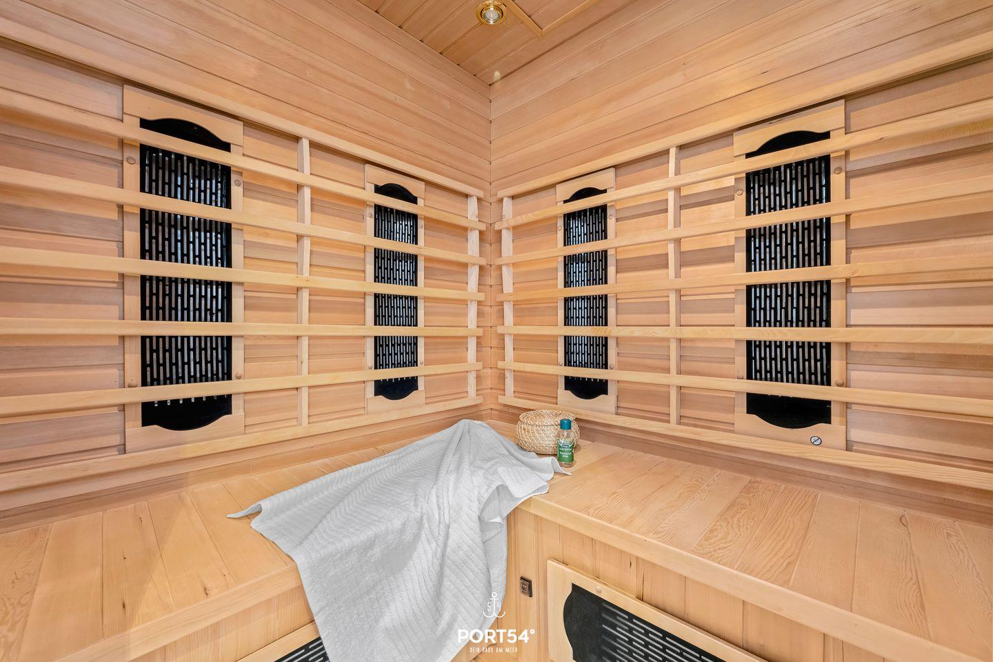 Das Badezimmer ist mit einer bodengleichen Dusche, einem Waschbecken, einem Kosmetikspiegel, einem Haartrockner sowie einem Handtuchtrockner ausgestattet und bietet Dir mit der Infrarotkabine einen privaten Wellnessbereich.