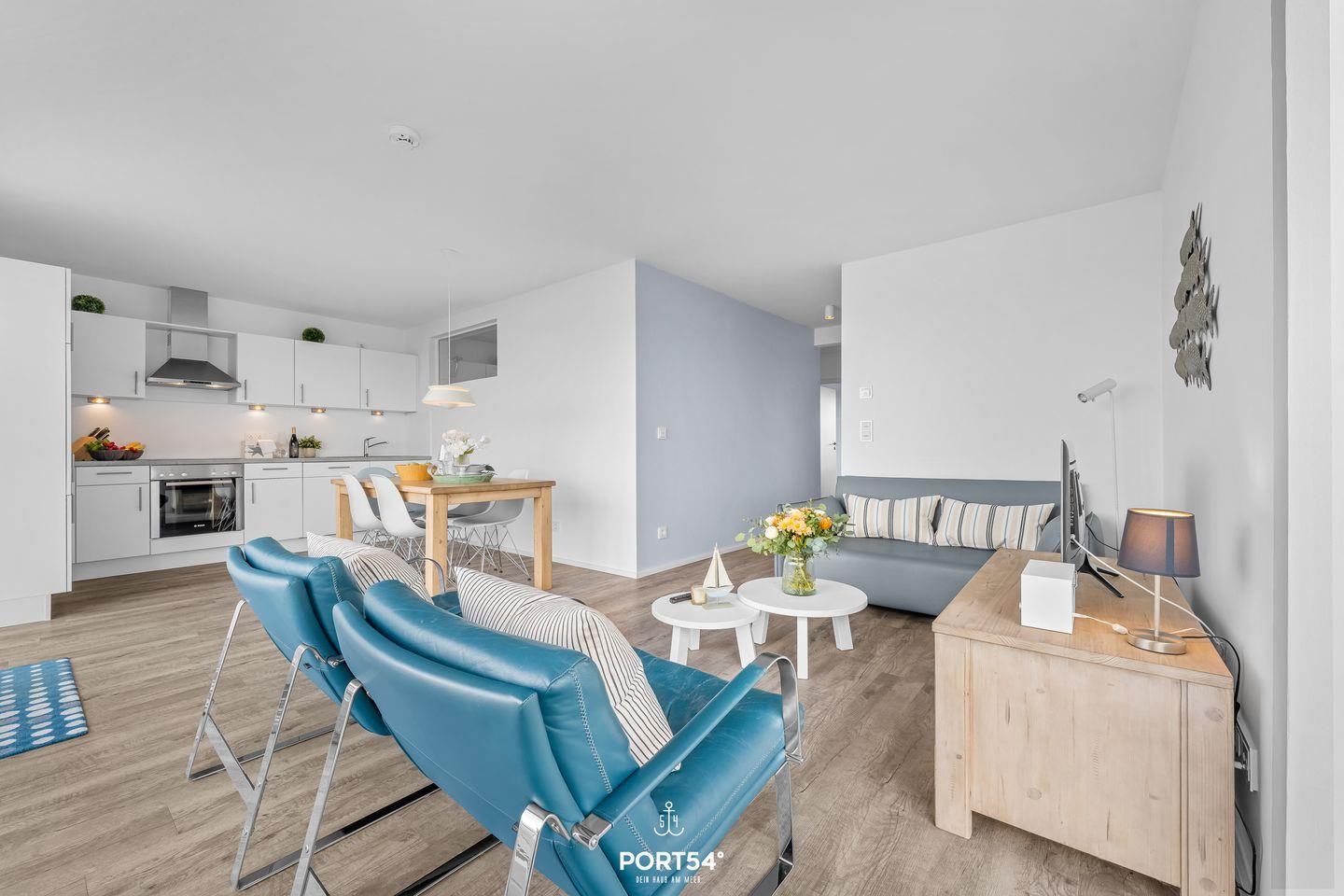 Das Wohnzimmer ist offen mit der voll ausgestatteten Küche verbunden und bietet Dir eine angenehme Wohnatmosphäre mit bequemem Sofa, Sessel und Essbereich. Für Unterhaltung sorgt ein Smart-TV, WLAN kannst Du im gesamten Objekt kostenfrei nutzen.