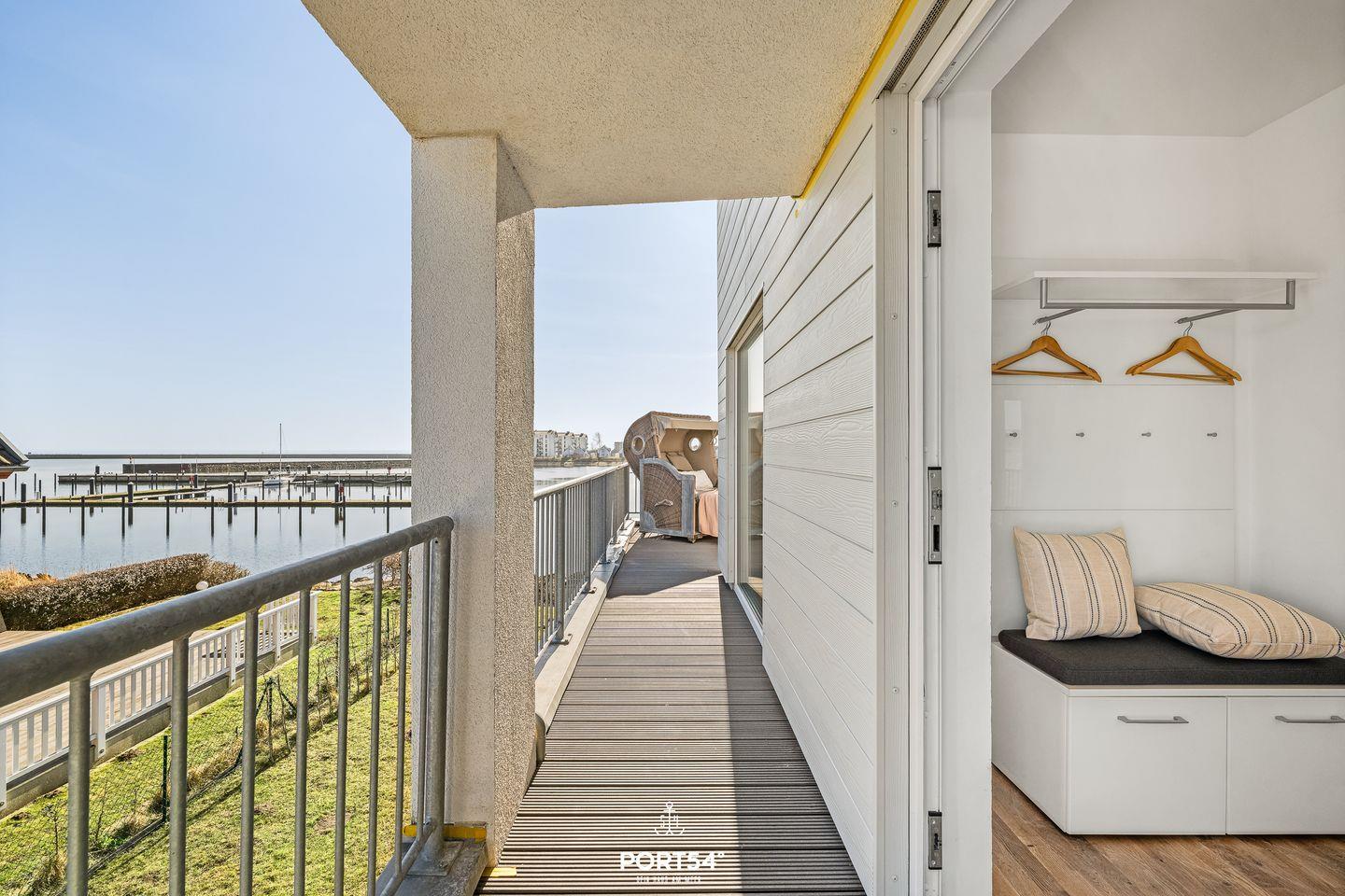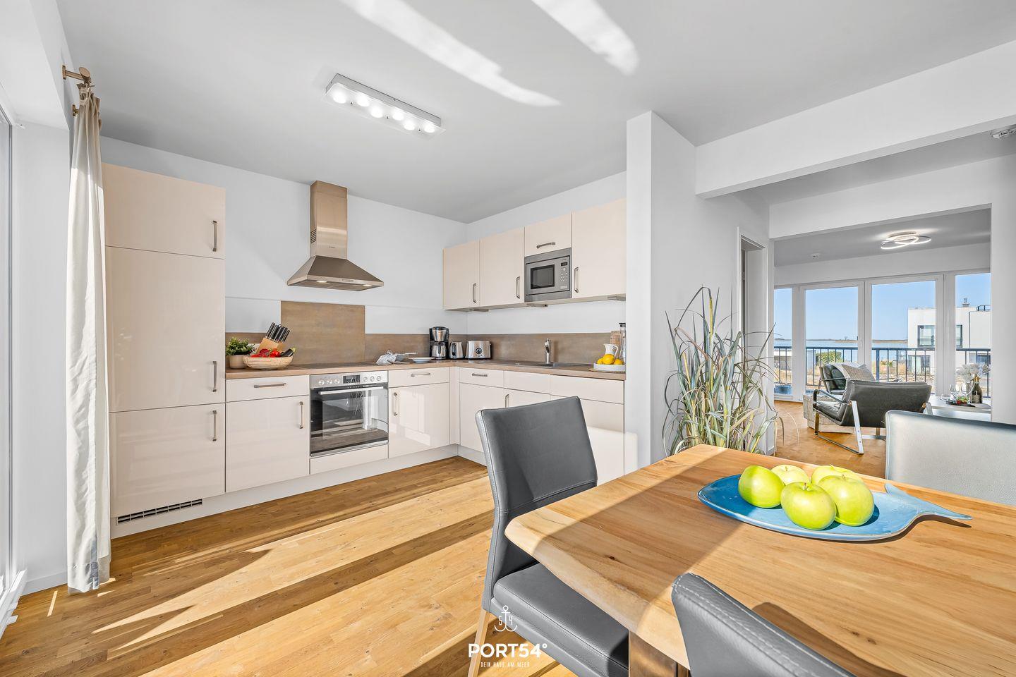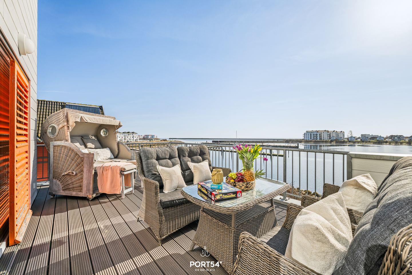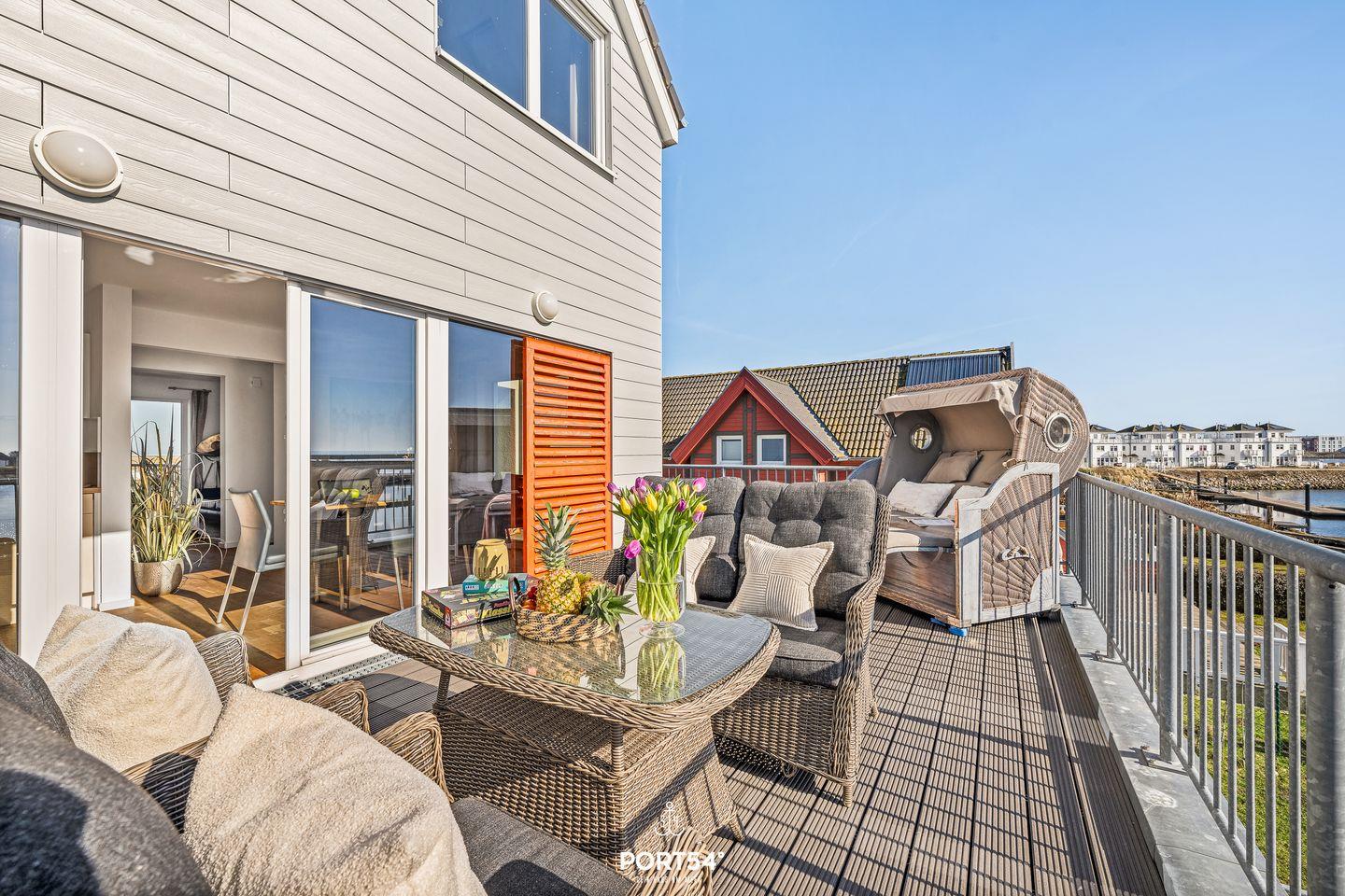 Auf den 2 Balkonen mit Meerblick, Gartenmöbeln, Elektrogrill und Strandkorb lässt sich die maritime Atmosphäre perfekt genießen. Dank der Lage in erster Reihe am Meer bieten sich von fast überall in der Wohnung herrliche Ausblicke auf Wasser und Landschaft.