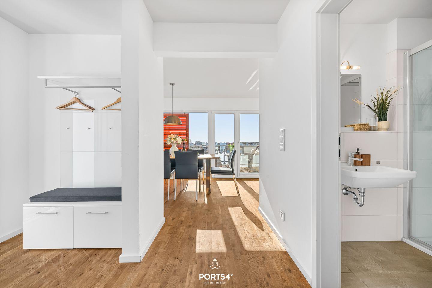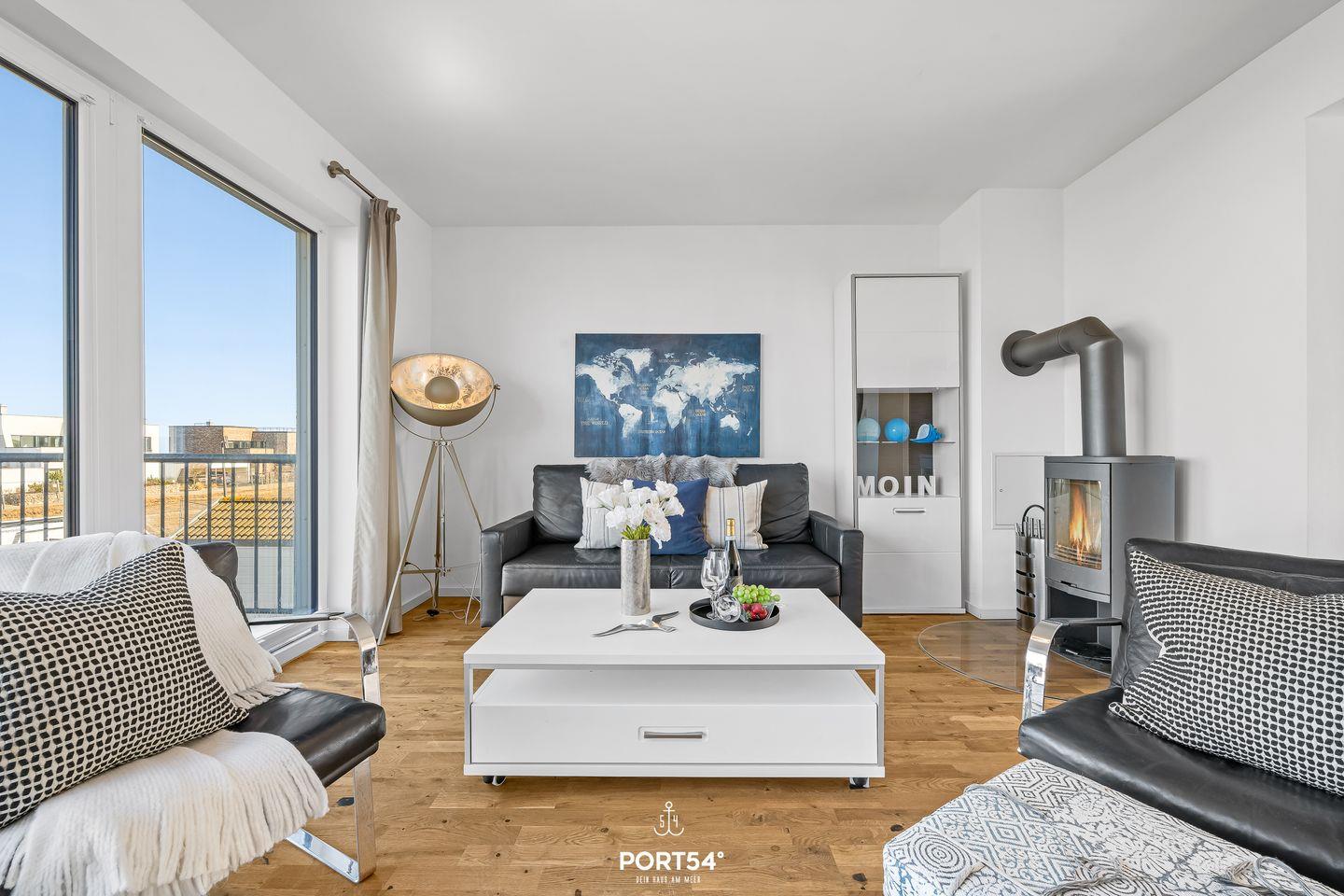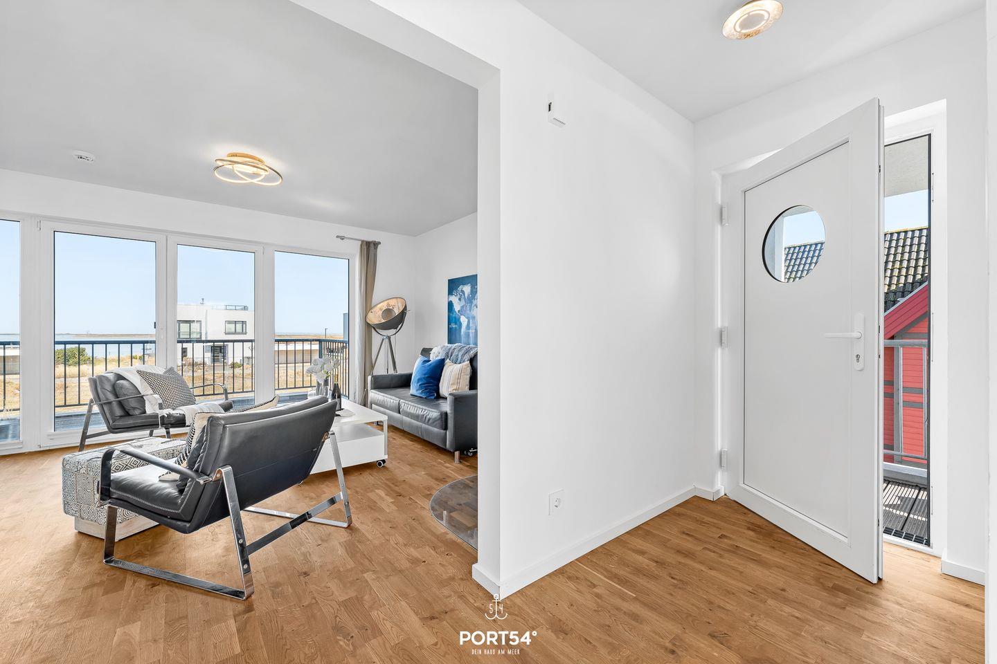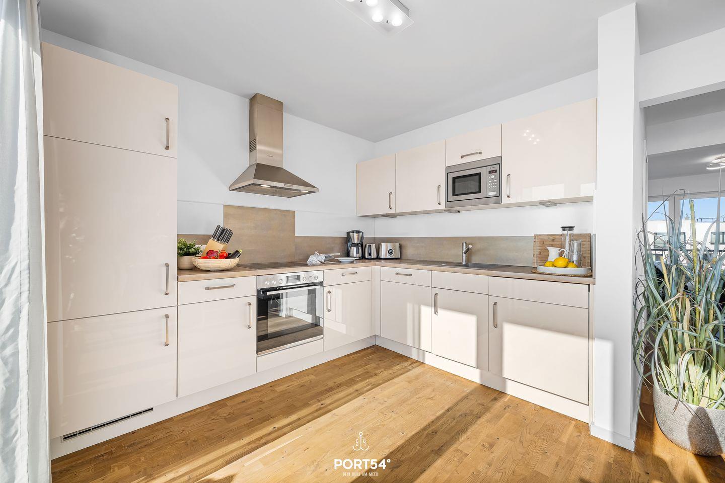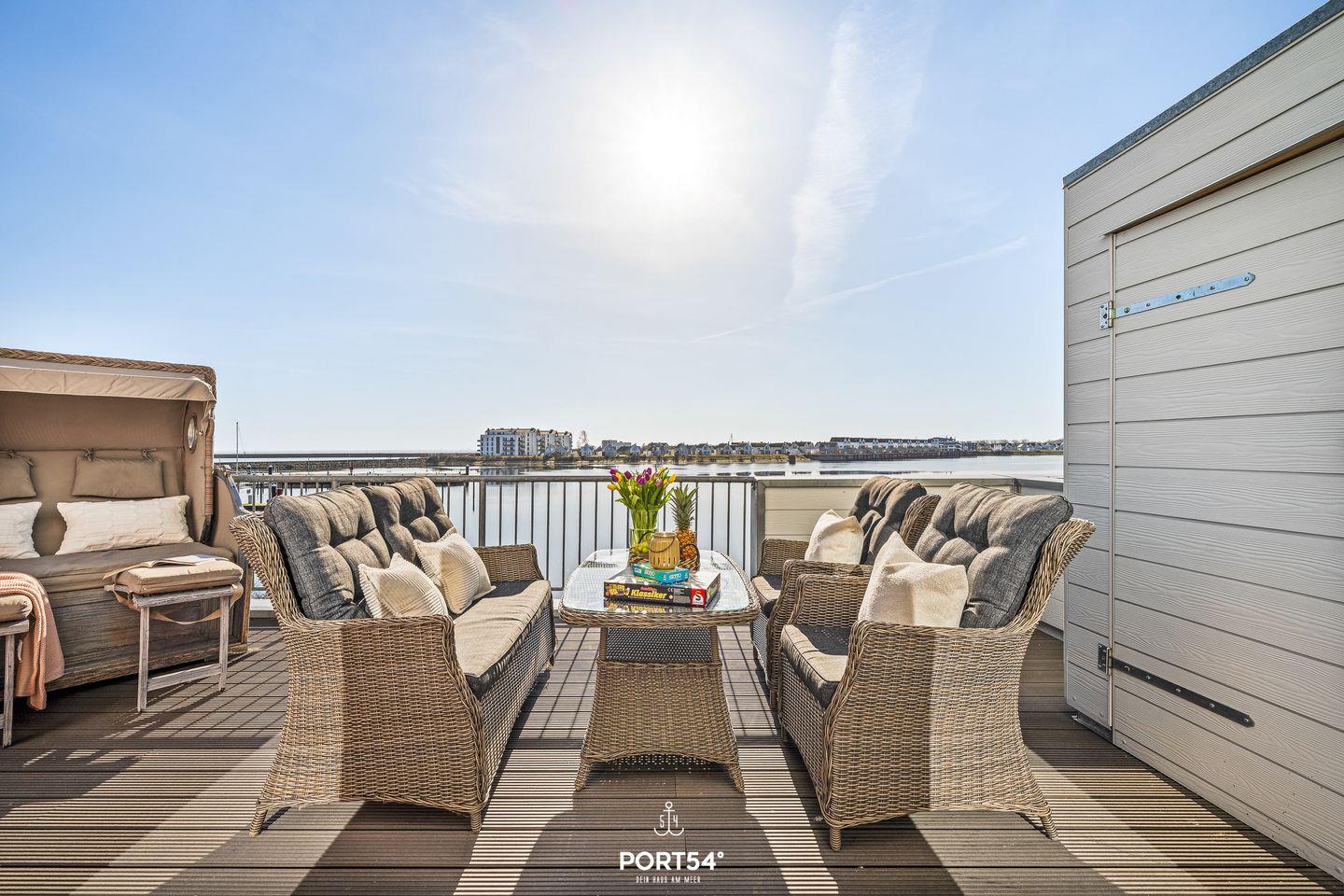 Auf den 2 Balkonen mit Meerblick, Gartenmöbeln, Elektrogrill und Strandkorb lässt sich die maritime Atmosphäre perfekt genießen. Dank der Lage in erster Reihe am Meer bieten sich von fast überall in der Wohnung herrliche Ausblicke auf Wasser und Landschaft.