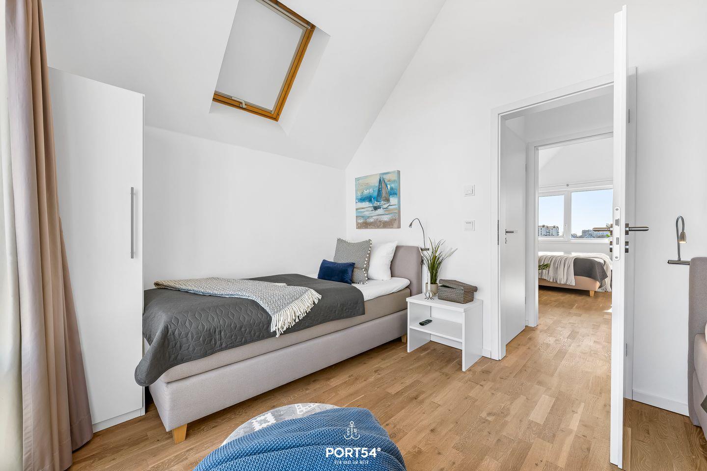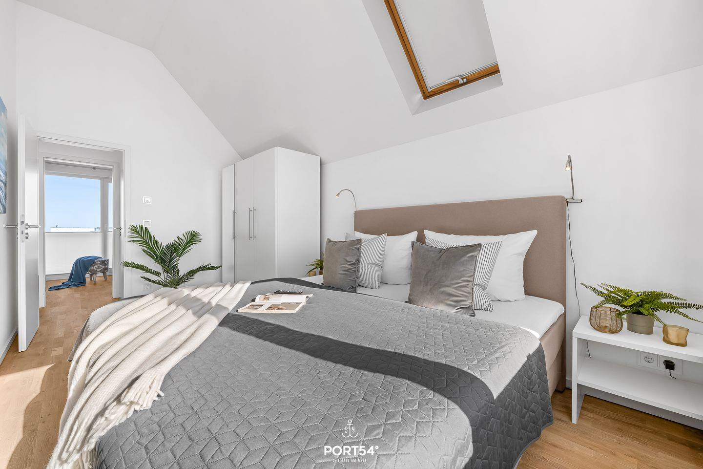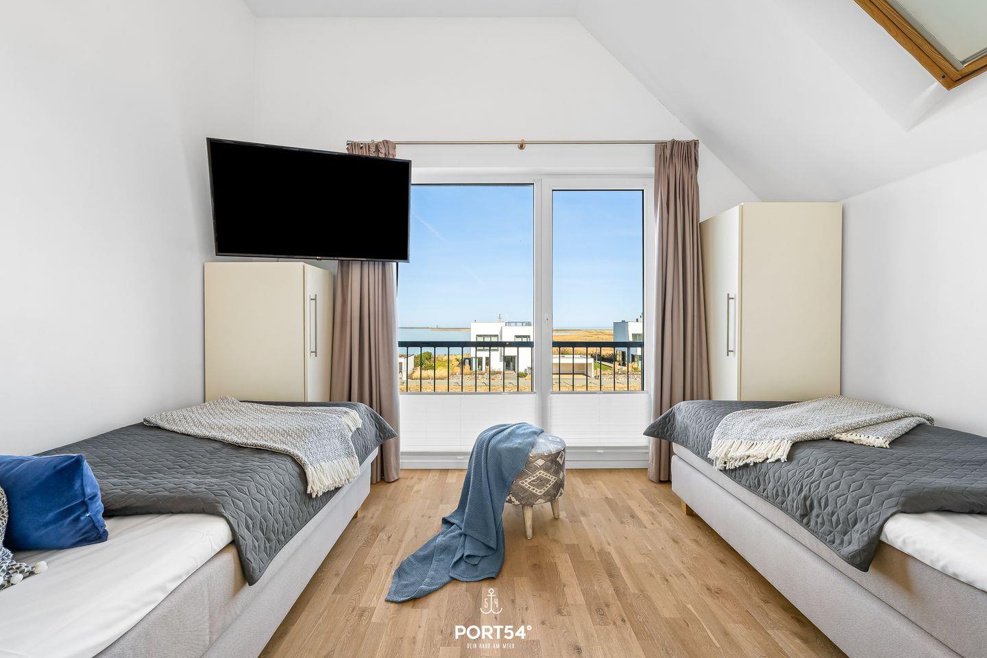 Das Hauptschlafzimmer ist mit einem Boxspringbett (180 × 200?cm) ausgestattet, das zweite Schlafzimmer verfügt über zwei Einzelbetten (je 100 × 200?cm) – perfekt für Kinder oder Freunde. Außerdem befindet sich in jedem der Schlafzimmer je ein Kleiderschrank, ein TV und Verdunkelungsmöglichkeiten.