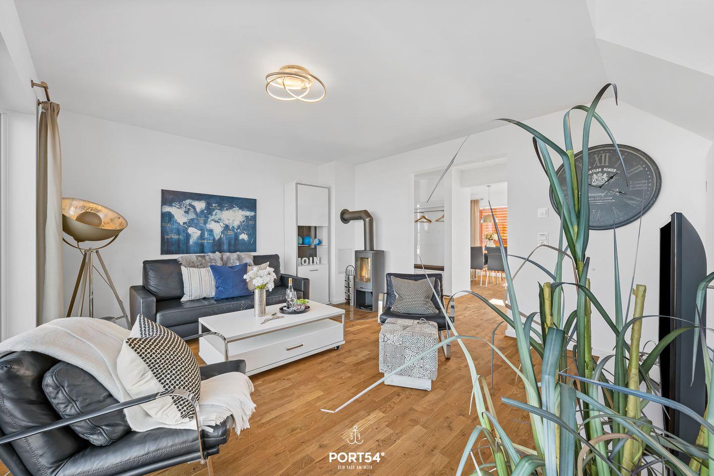 Der stilvoll eingerichtete Wohnbereich vereint Gemütlichkeit und modernen Komfort. Eine großzügige Sofaecke lädt Dich zum Verweilen ein, während der Kamin für behagliche Stimmung sorgt. Für Unterhaltung sorgen Fernseher, HiFi-Anlage und WLAN. Große Fenster schaffen eine helle, freundliche Atmosphäre und verbinden Innenraum und Umgebung harmonisch.