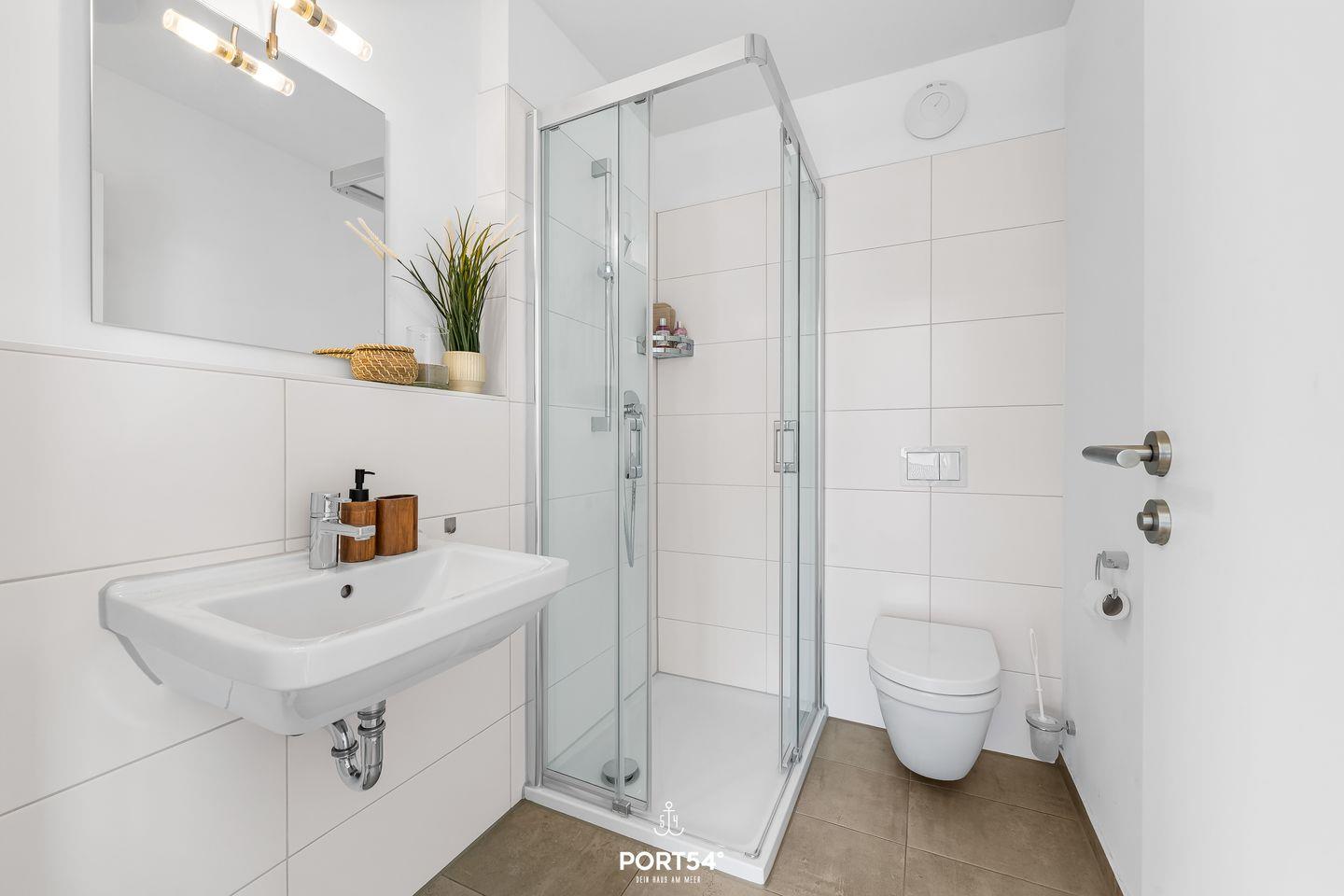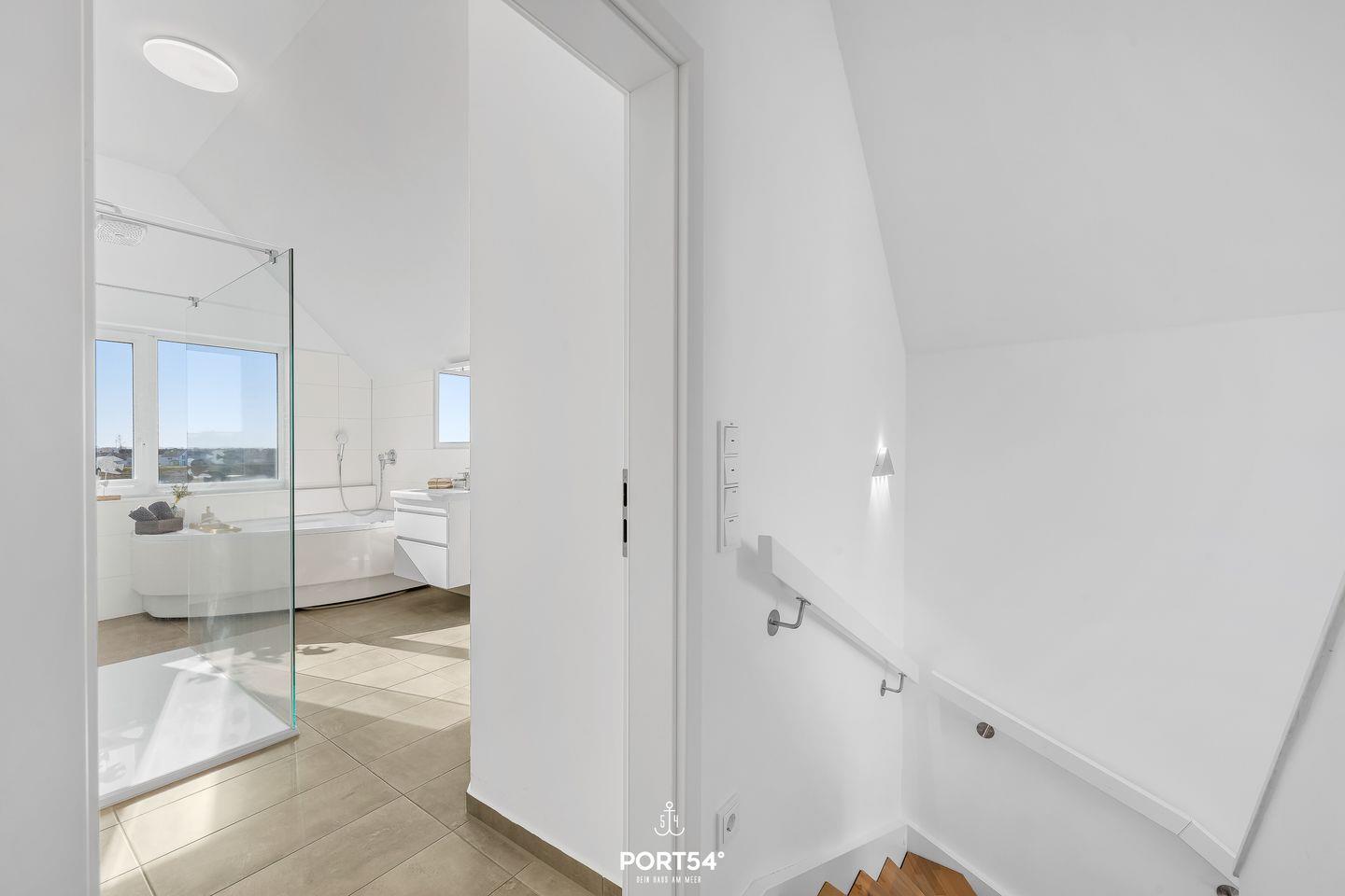 Auch in den Badezimmern setzt sich der hochwertige Stil fort. Das Hauptbad ist modern ausgestattet mit Dusche, Whirlwanne, Kosmetikspiegel und Haartrockner – ideal für entspannte Wellnessmomente nach einem Tag am Meer. Ein zweites Duschbad im ersten Obergeschoss rundet den Komfort ab. Ein besonderes Highlight ist die Infrarotkabine, die Dir nach einem Tag an der Ostsee wohltuende Entspannung bietet. Die Fußbodenheizung sorgt das ganze Jahr über für angenehmes Raumklima.