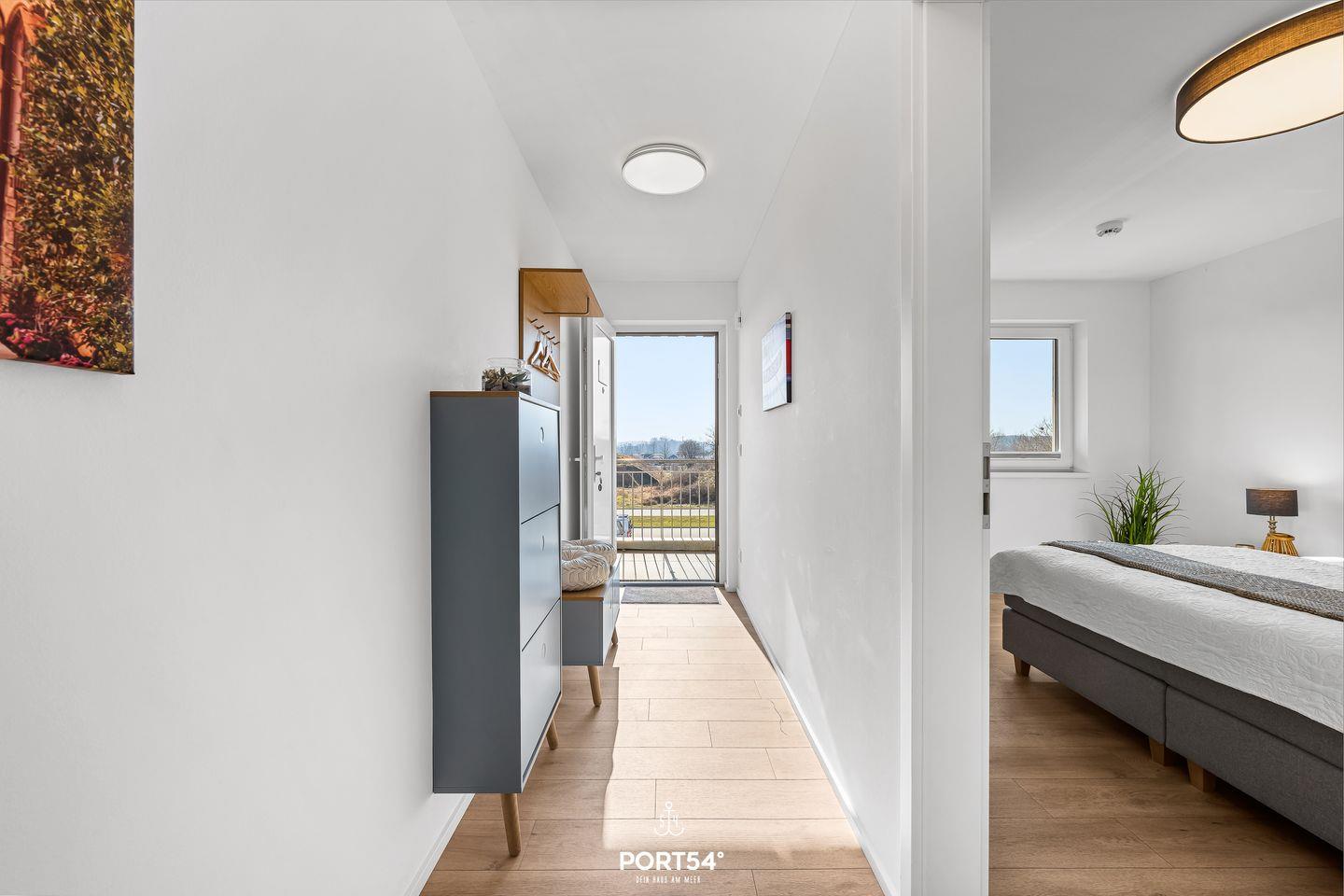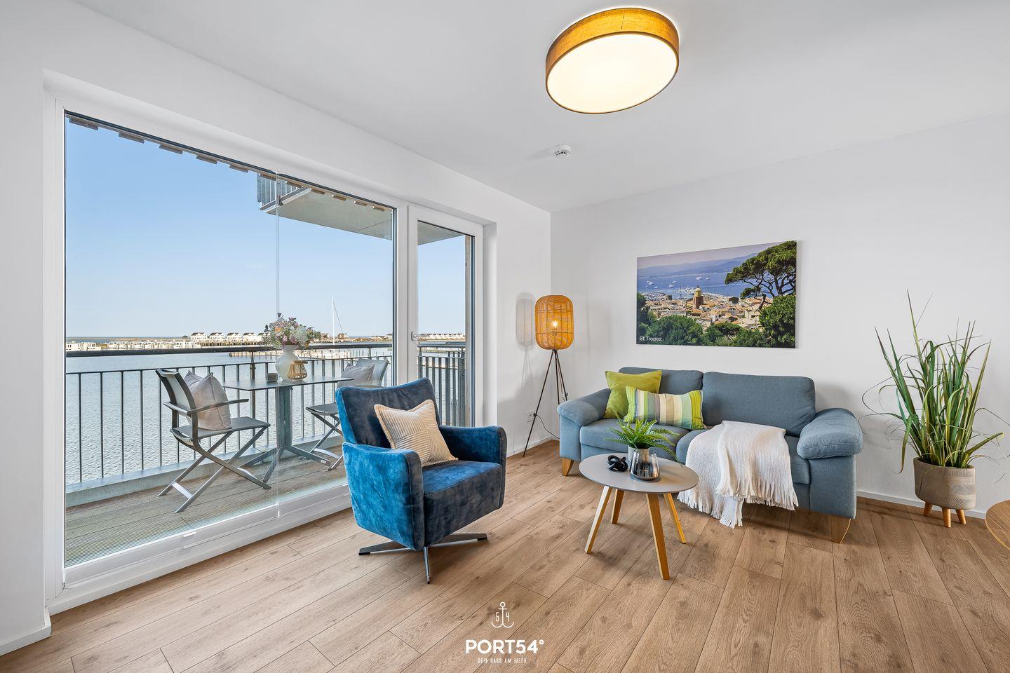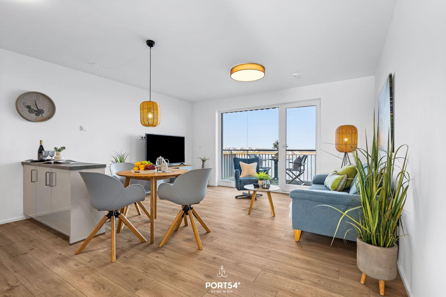 Das Appartement im zweiten Stock bietet Dir einen wunderschönen Blick auf das Meer und die maritime Umgebung – direkt vom Wohnzimmer und dem privaten Balkon aus.