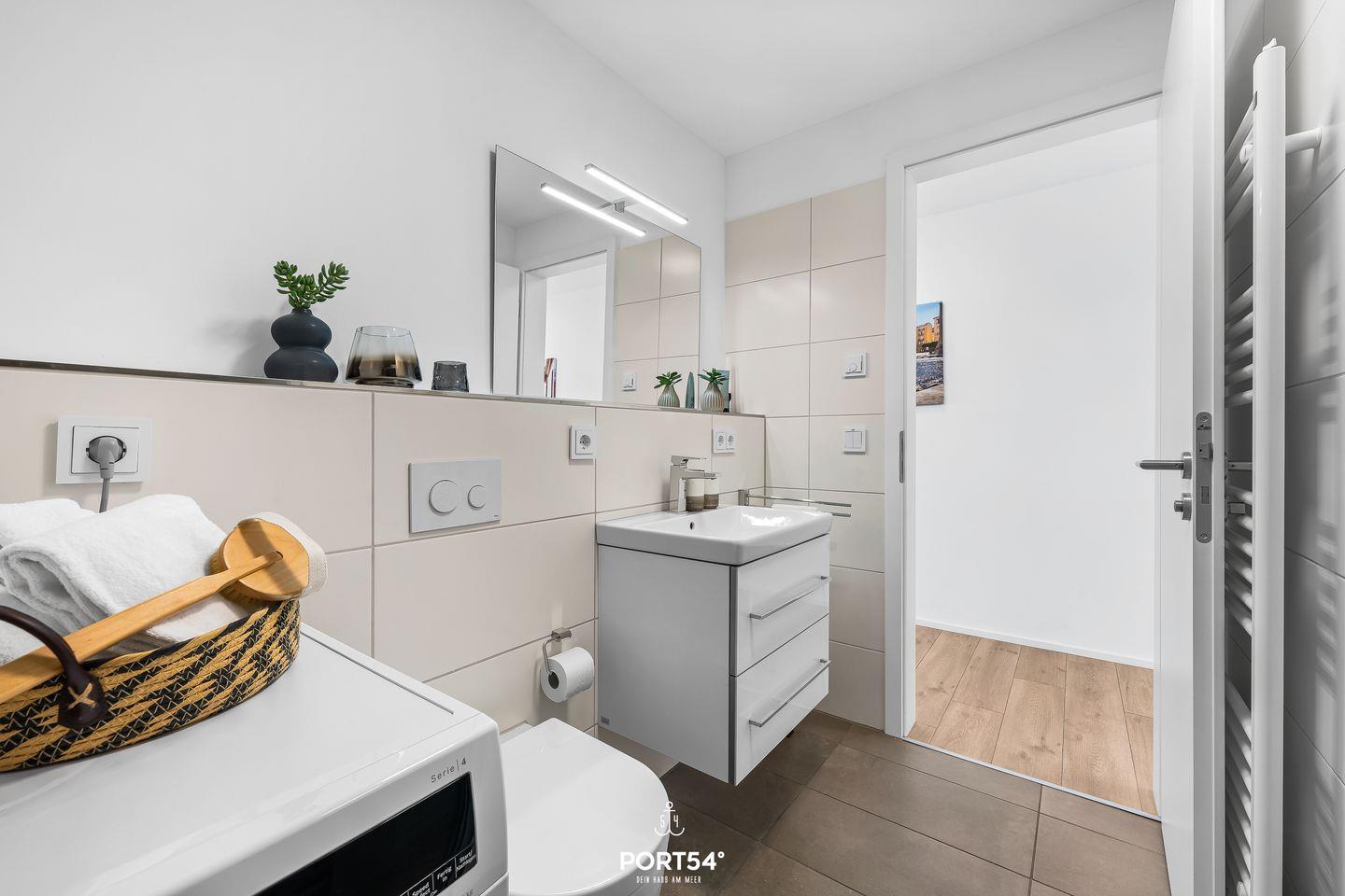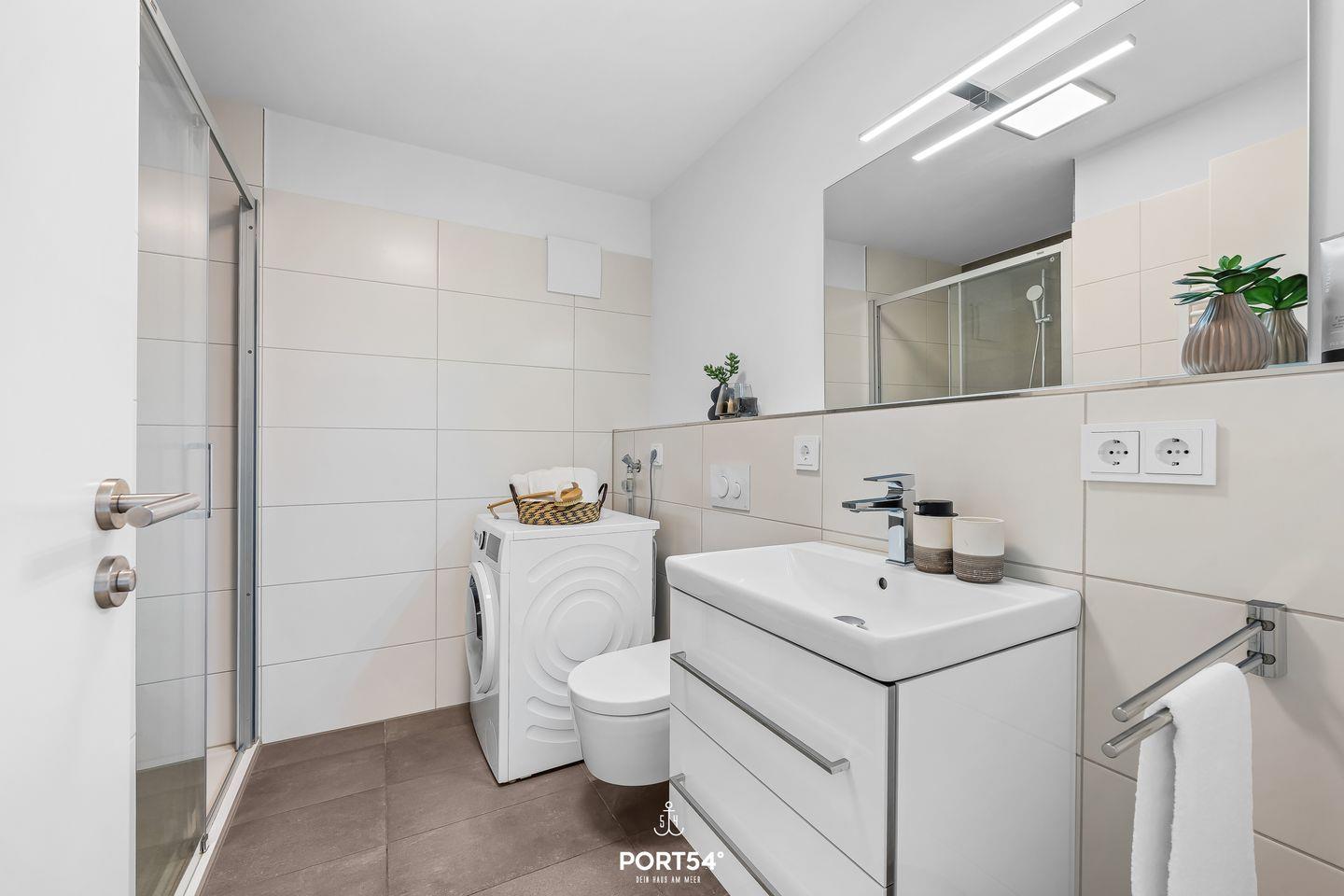 Das moderne Badezimmer verfügt über eine bodengleiche Dusche, Haartrockner und Kosmetikspiegel.