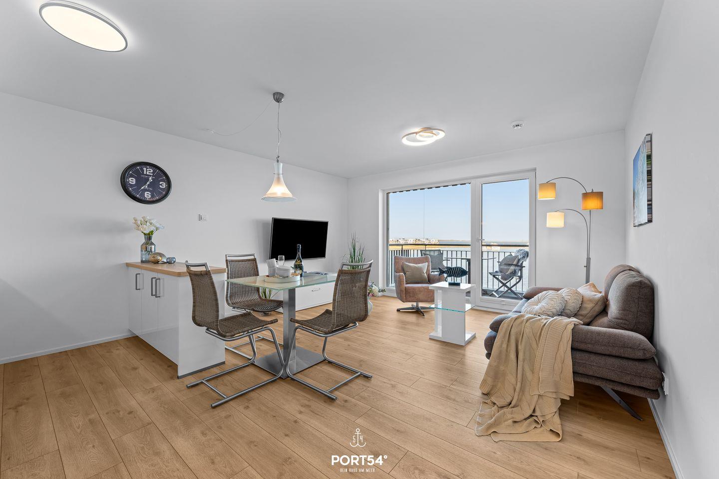 Das Appartement im zweiten Stock bietet Dir einen wunderschönen Blick auf das Meer und die maritime Umgebung – direkt vom Wohnzimmer und dem privaten Balkon aus.