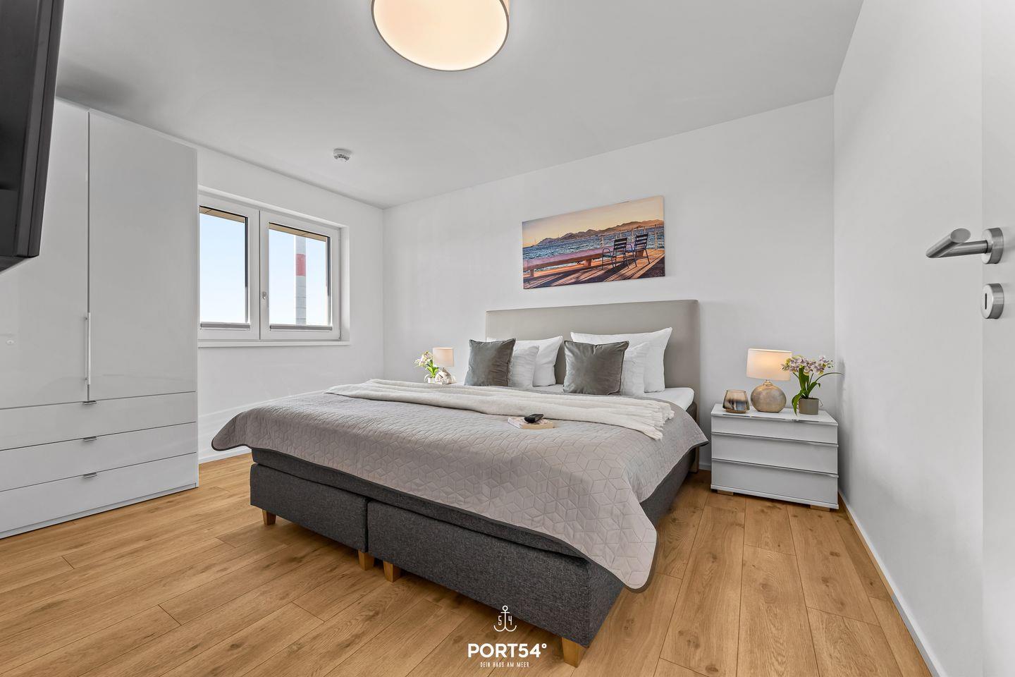 Das Schlafzimmer ist mit einem komfortablen Doppel-Boxspringbett (180×200 cm) ausgestattet und verfügt über einen eigenen Fernseher.