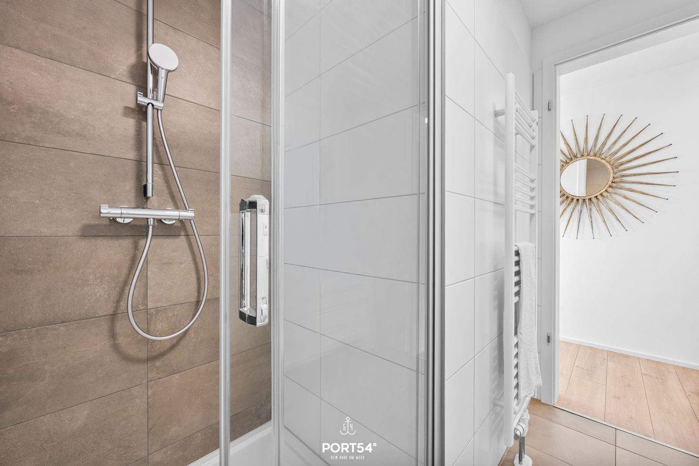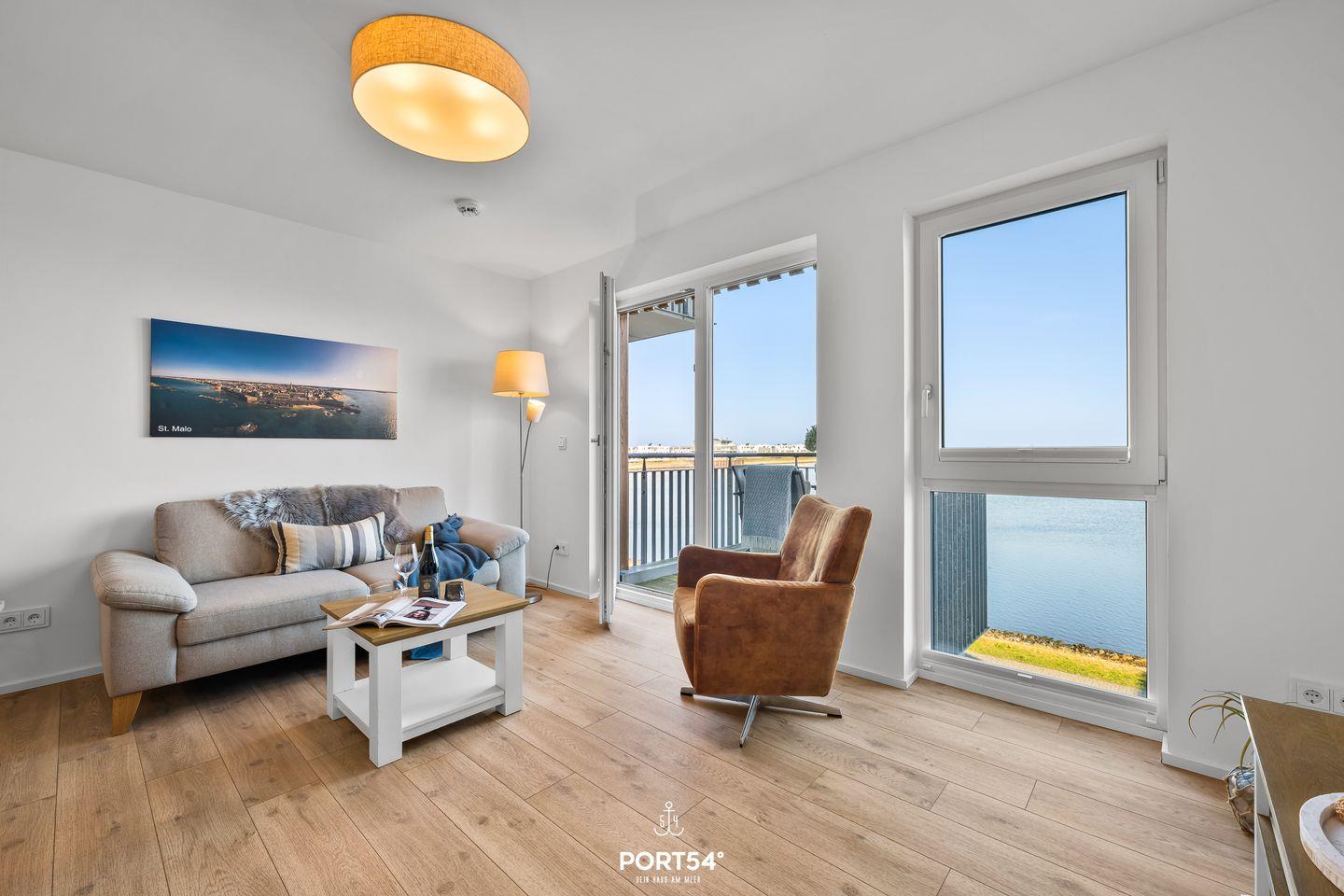 Vom Wohnzimmer und dem privaten Balkon genießt Du einen herrlichen Blick auf das Meer und die maritime Umgebung.
