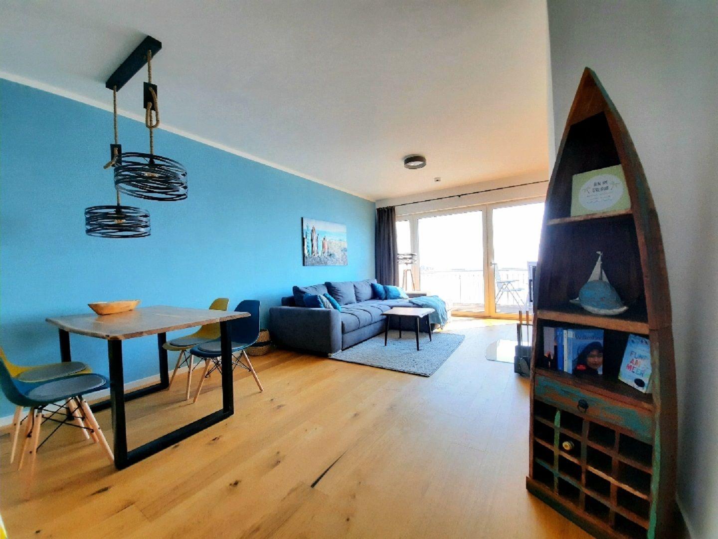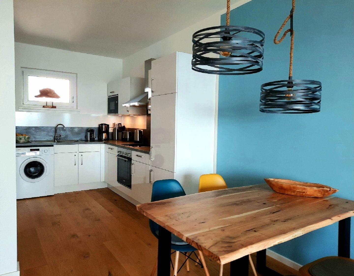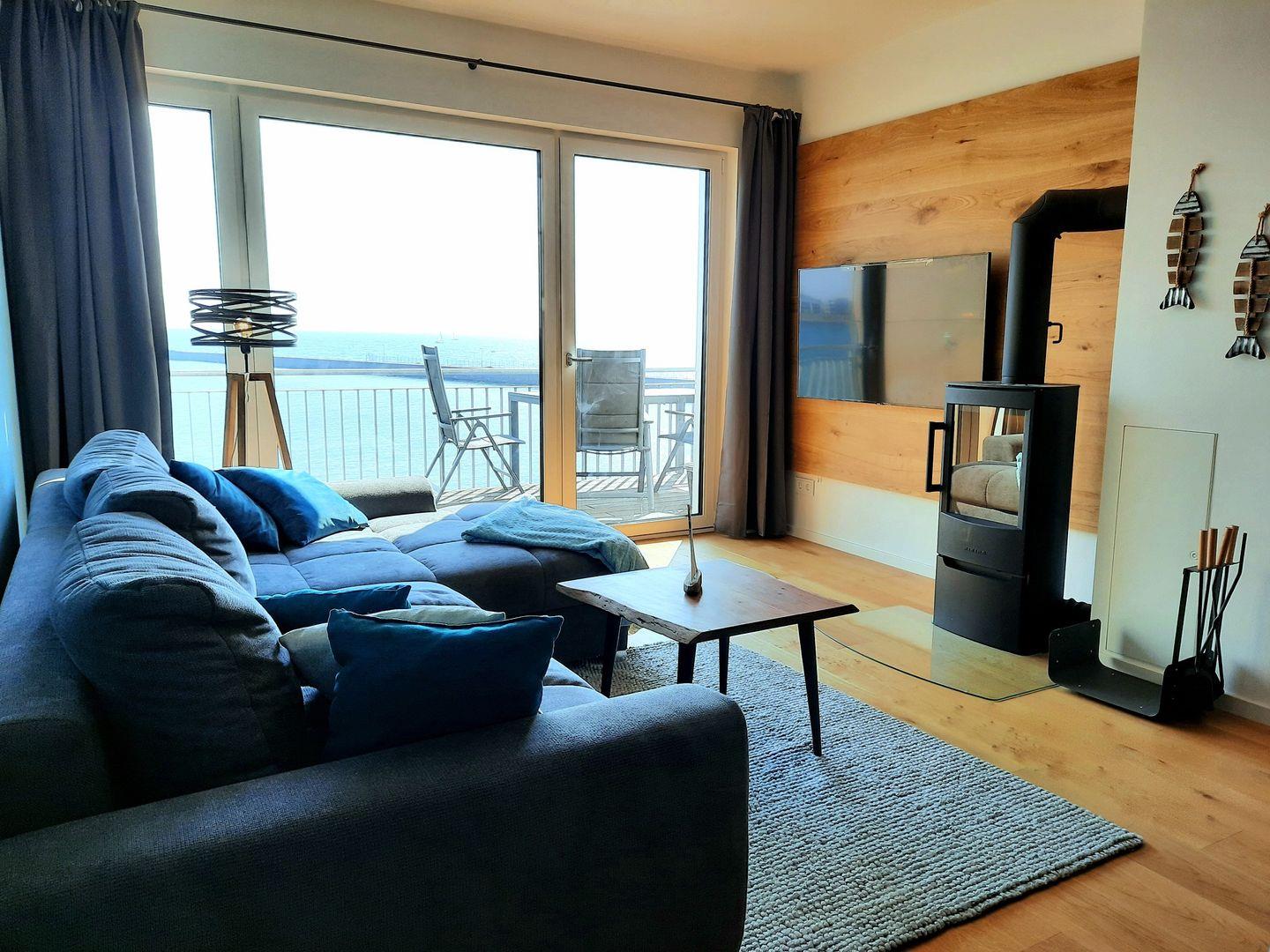 Das Herzstück der Wohnung ist der offen gestaltete Wohn- und Essbereich, der mit seinem eleganten Design und dem Kaminofen für ein behagliches Raumgefühl sorgt. Große Fenster lassen viel Tageslicht in den Raum und bieten Dir einen tollen Meerblick, der zu jeder Tageszeit für ein besonderes Wohlfühlerlebnis sorgt. Für Unterhaltung sorgen hier der Smart-TV, Spiele und WLAN in der gesamten Unterkunft.