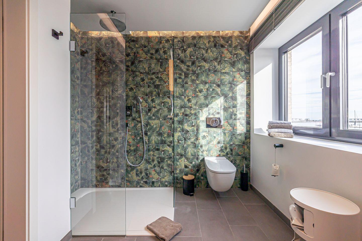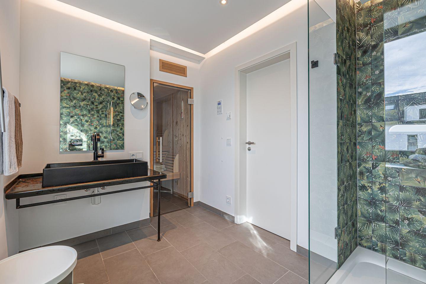 Im Tageslicht-Bad erwarten Dich eine bodengleiche Dusche, ein Föhn sowie ein Kosmetikspiegel, zudem ist ein separates Gäste-WC vorhanden.
