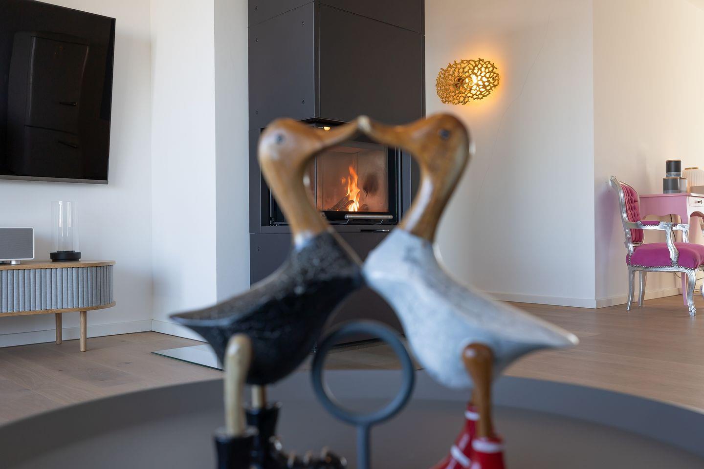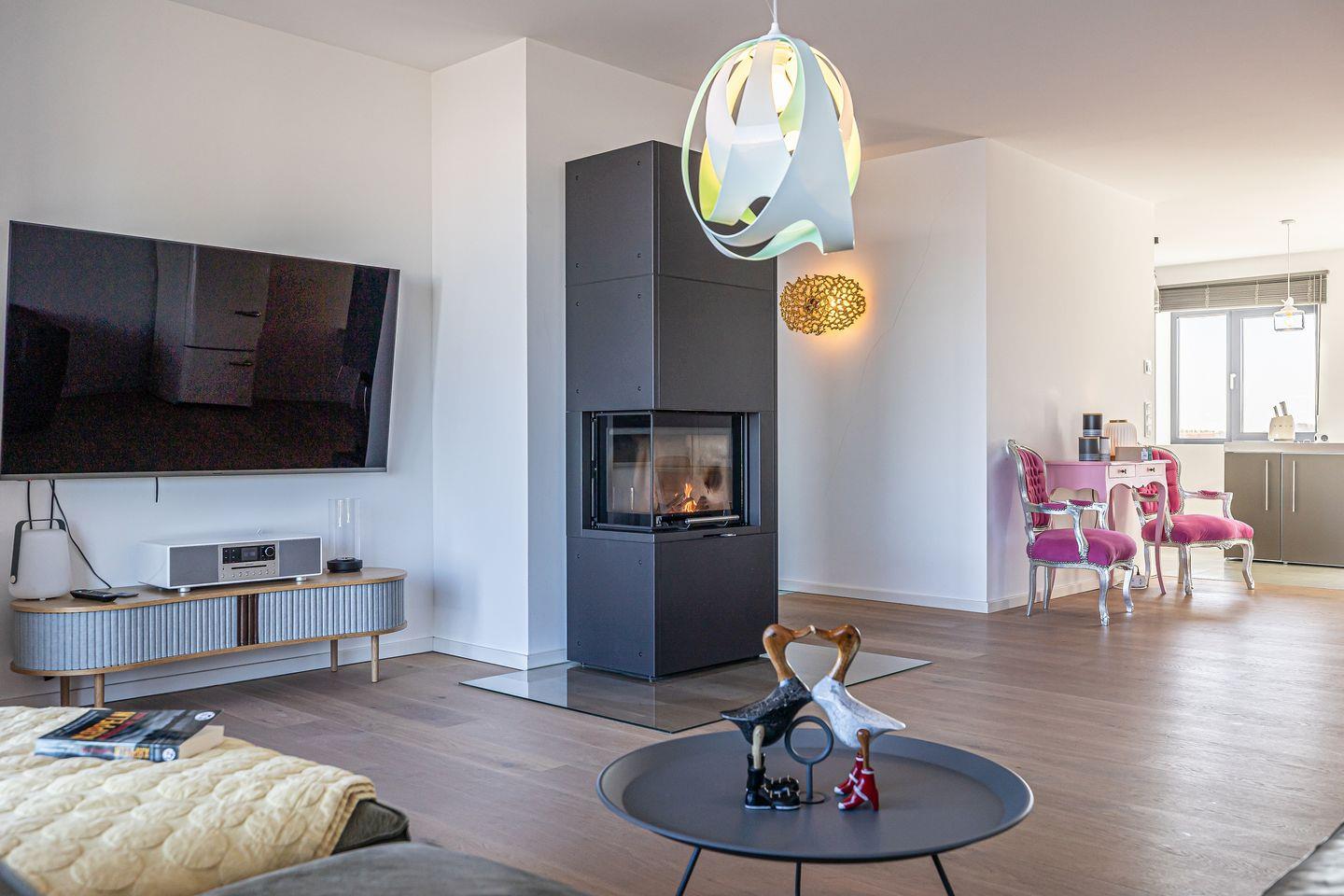 Für gemütliche Stunden sorgen ein Kaminofen und ein Smart-TV im Wohnzimmer.
