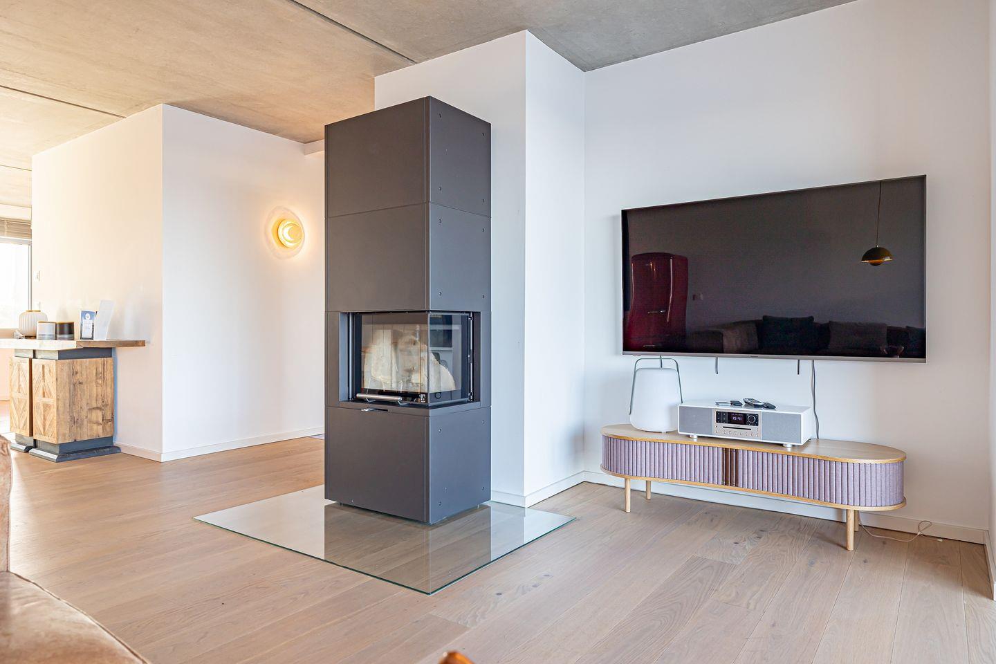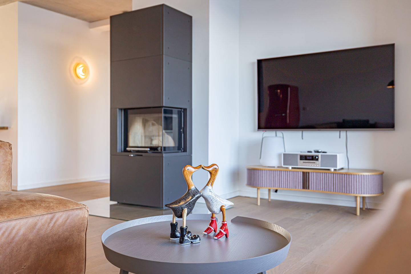 Für gemütliche Stunden sorgen ein Kaminofen und ein Smart-TV im Wohnzimmer.