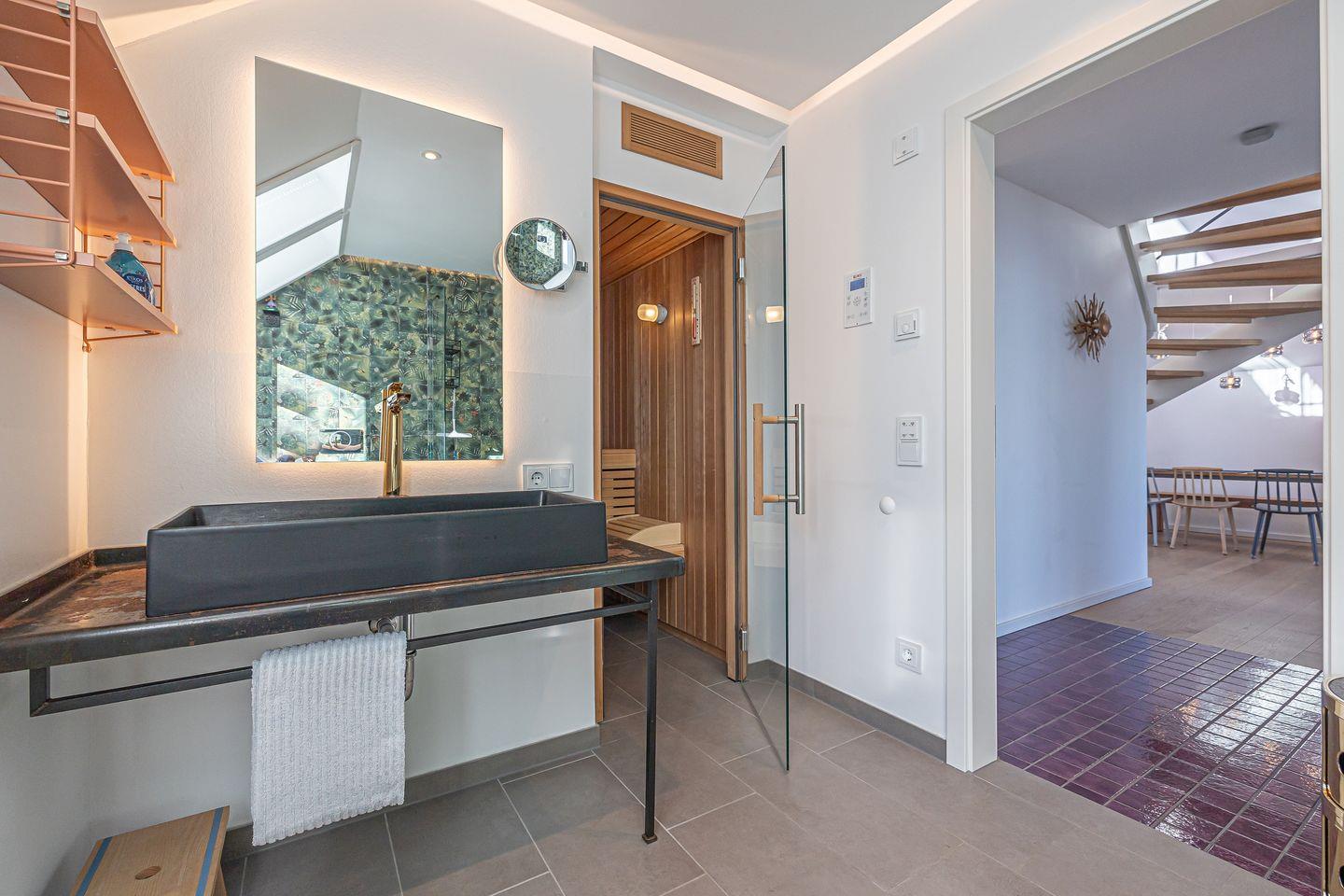 Im Tageslicht-Bad erwarten Dich eine bodengleiche Dusche, ein Föhn sowie ein Kosmetikspiegel, zudem ist ein separates Gäste-WC vorhanden.