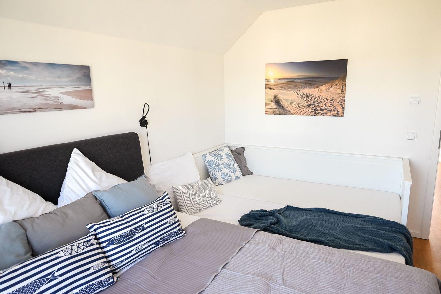Zwei Schlafzimmer bieten Dir flexible Schlafmöglichkeiten. Schlafzimmer 1 verfügt über ein komfortables Boxspringbett (1,80 × 2,00 m), einen großzügigen Kleiderschrank und einen Smart-TV – perfekt, um nach einem erlebnisreichen Tag entspannt den Abend zu genießen. Schlafzimmer 2 bietet ein gemütliches Doppelbett (1,60 × 2,00 m) und ein Einzelbett (0,80 × 2,00 m) sowie ebenfalls einen geräumigen Schrank und einen Smart-TV, sodass jeder Ruhe und Privatsphäre findet. Aus dem Einzelbett wird im Handumdrehen ein großzügiges Doppelbett. Zusammen mit dem danebenstehenden Doppelbett entsteht so ein gemütliches Familienbett.