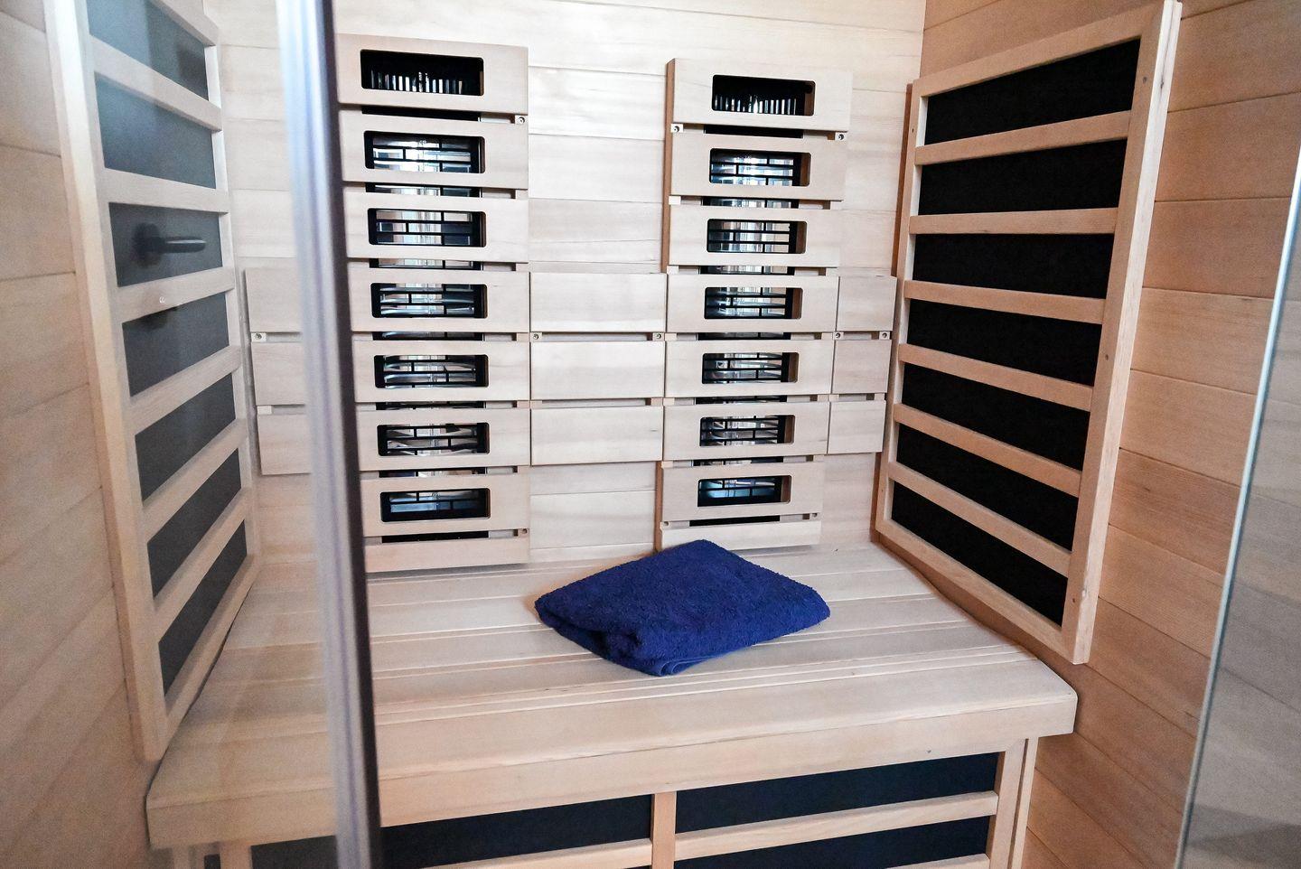 Ein wunderschönes Badezimmer mit Fenster, Handtuchheizkörper, einer ebenerdigen Dusche und dem Highlight einer Infrarot-Sauna bietet Dir zusätzlichen Komfort und Wohlbefinden.