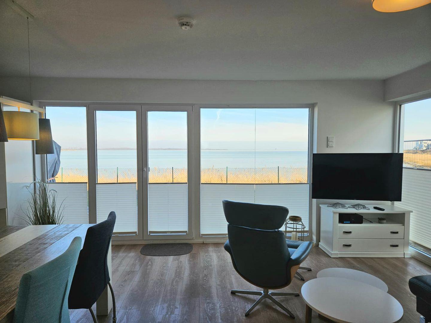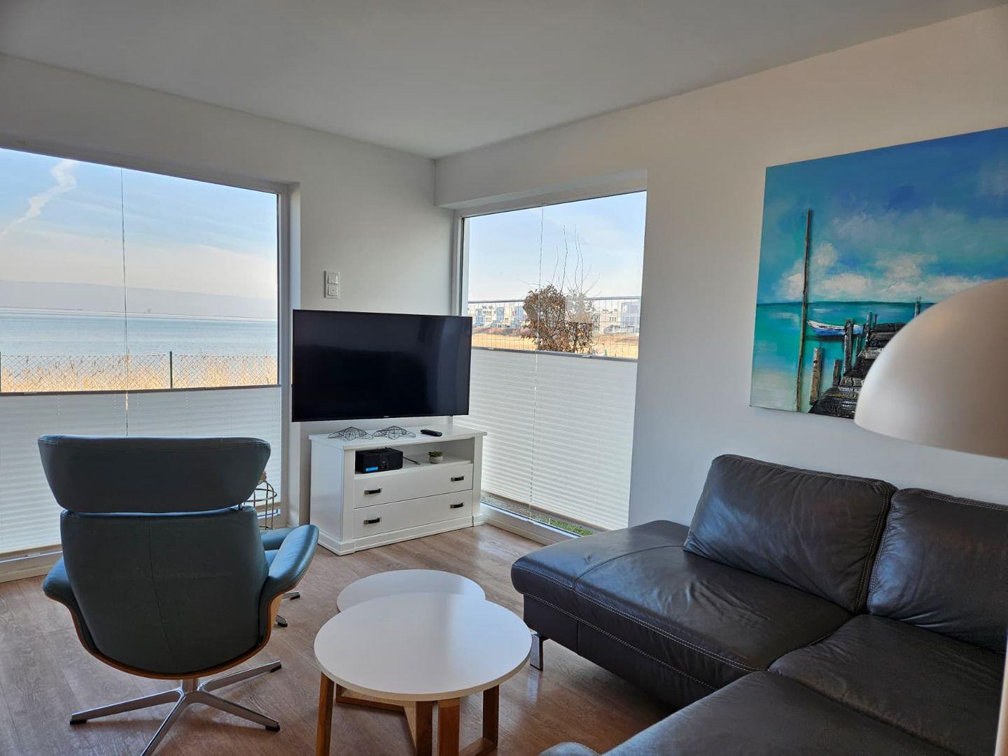 Der offene Wohnbereich mit Wasserblick vereint Gemütlichkeit mit moderner Ausstattung: Ein komfortables Sofa, Sessel, ein Esstisch und ein TV sorgen für Unterhaltung und Erholung auch an weniger sonnigen Tagen.